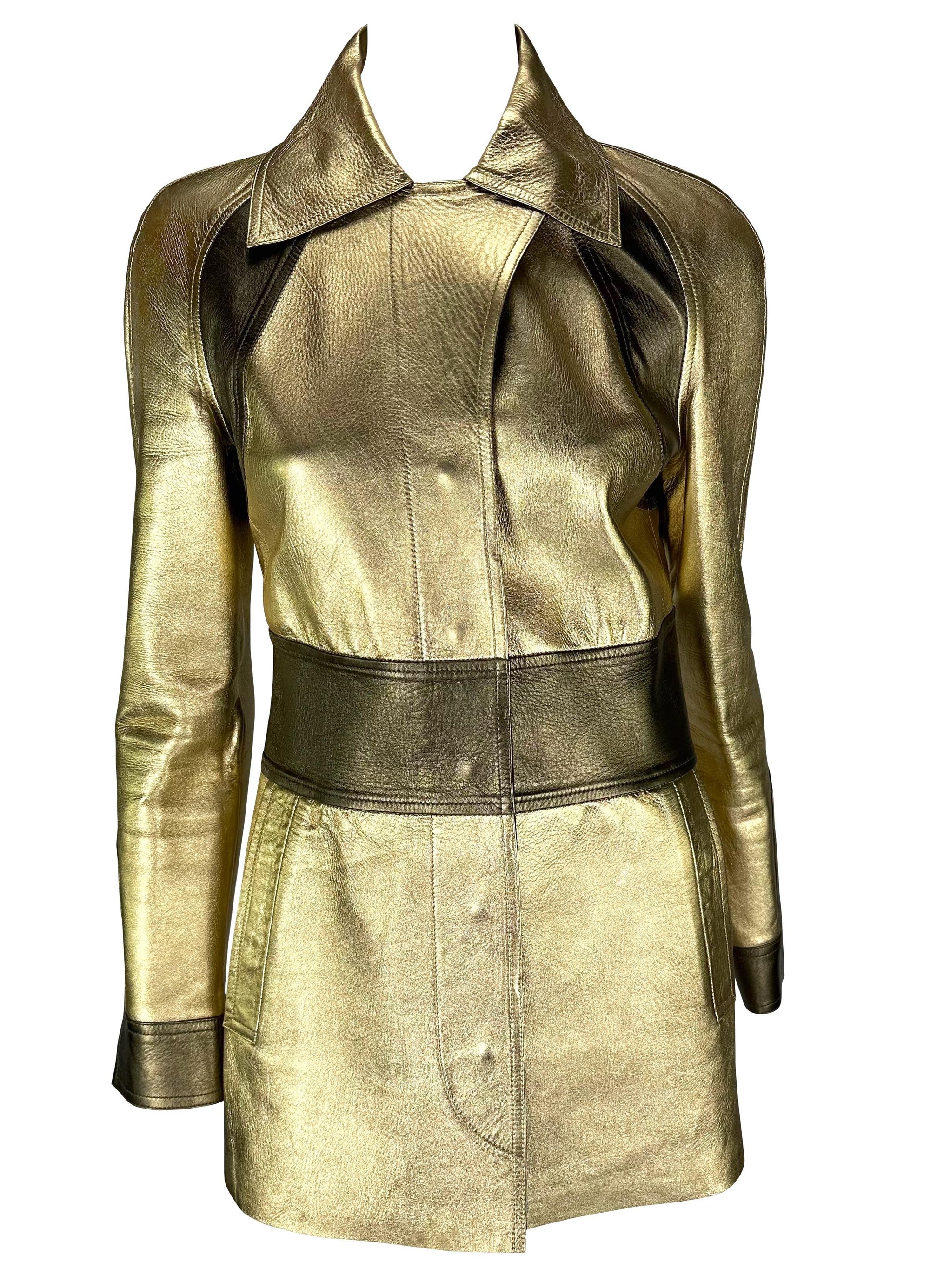 Presenting this incredible two-tone gold Gucci leather trench coat designed by Tom Ford. From the Fall/Winter 2000 collection, the more extended version of this jacket debuted on the season's runway as part of Look 26. It was also highlighted in the season's ad campaign captured by Mario Testino. This fabulous gold-tone jacket is constructed entirely of leather and features concealed snap button closures. Add this glamorous and iconic Gucci by Tom Ford coat to your wardrobe!