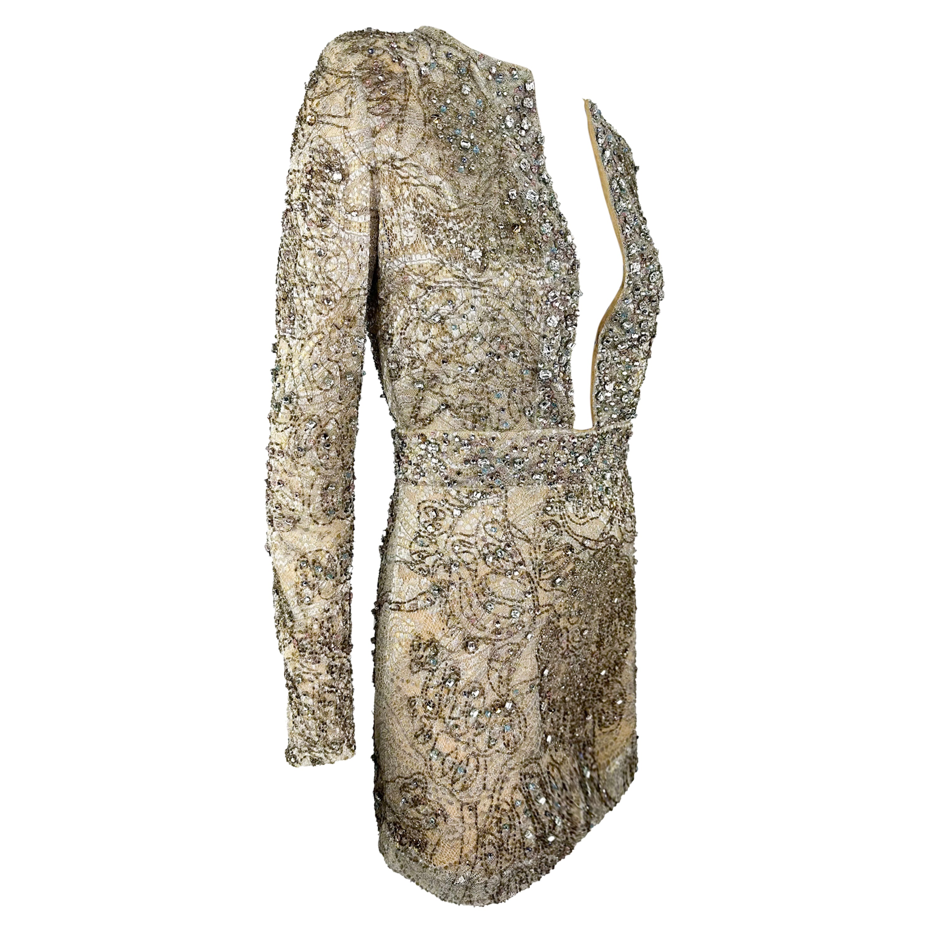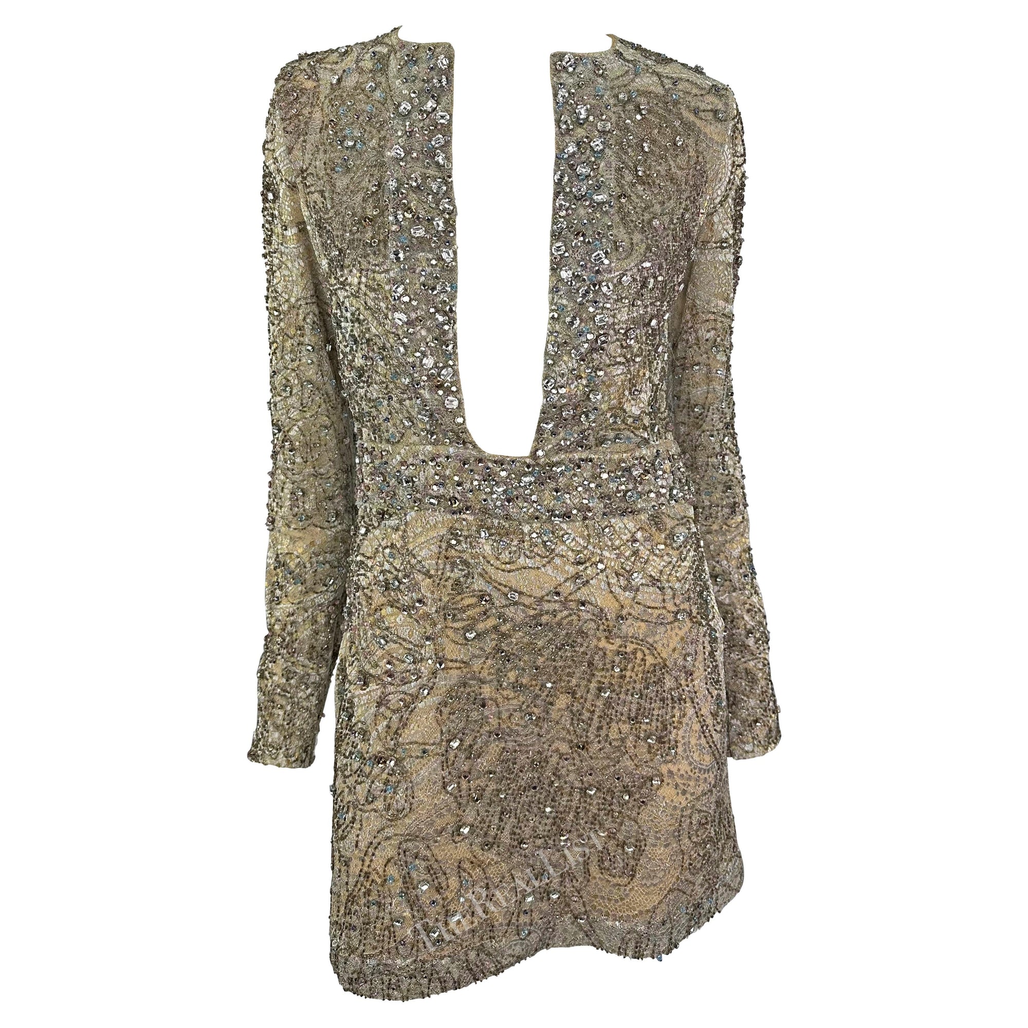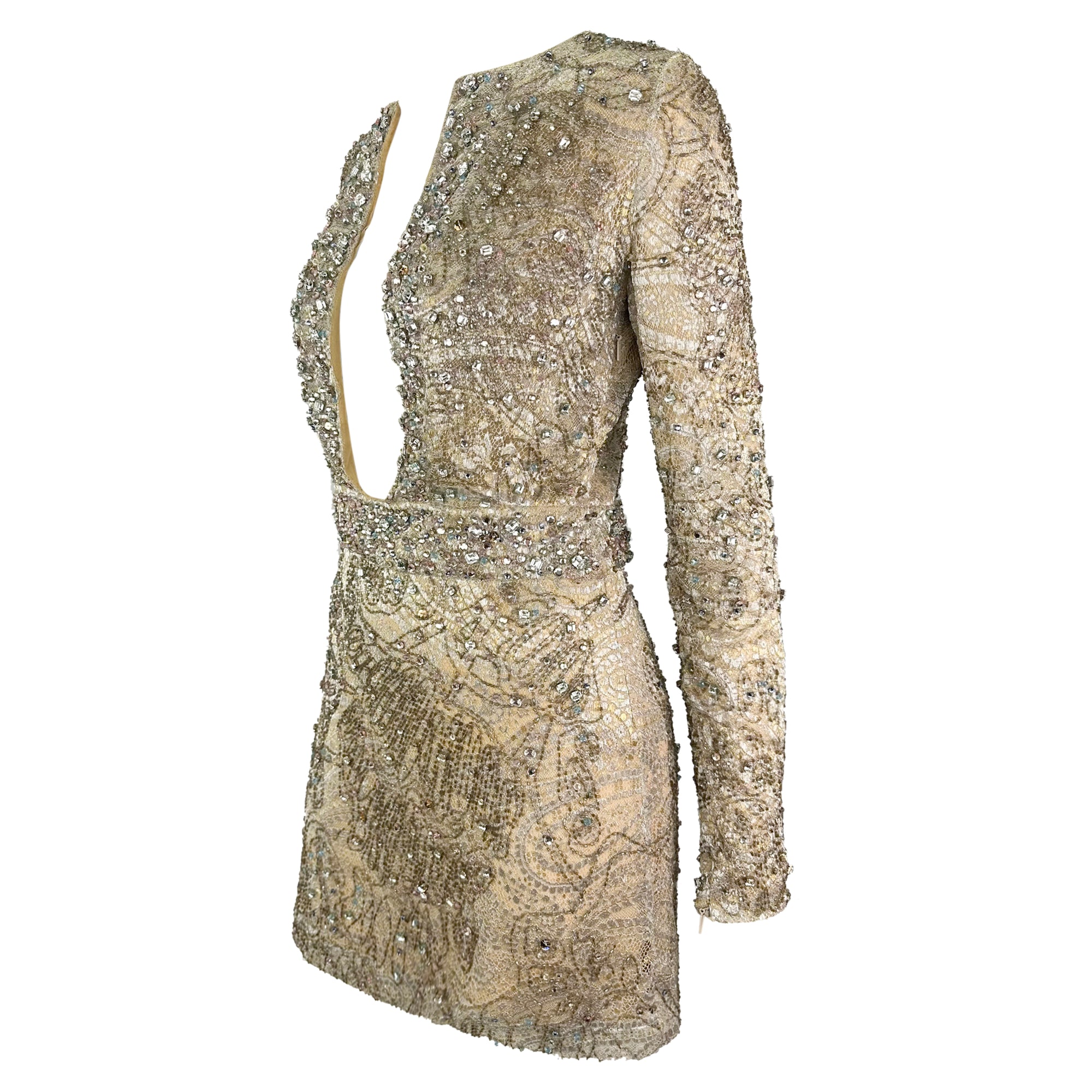 F/W 2000 Gucci by Tom Ford Rhinestone Beaded Plunge Silver Beige Lace Mini Dress