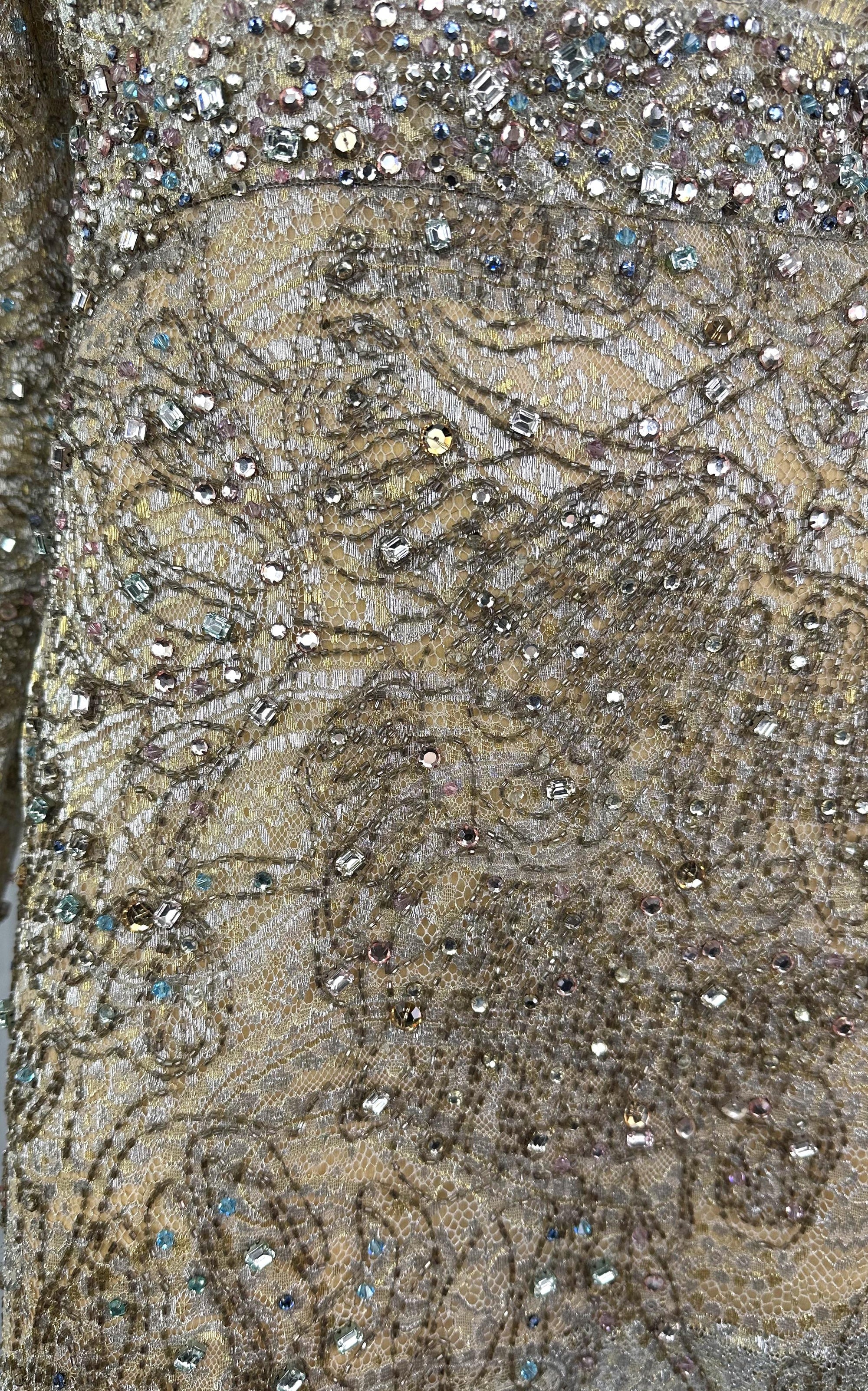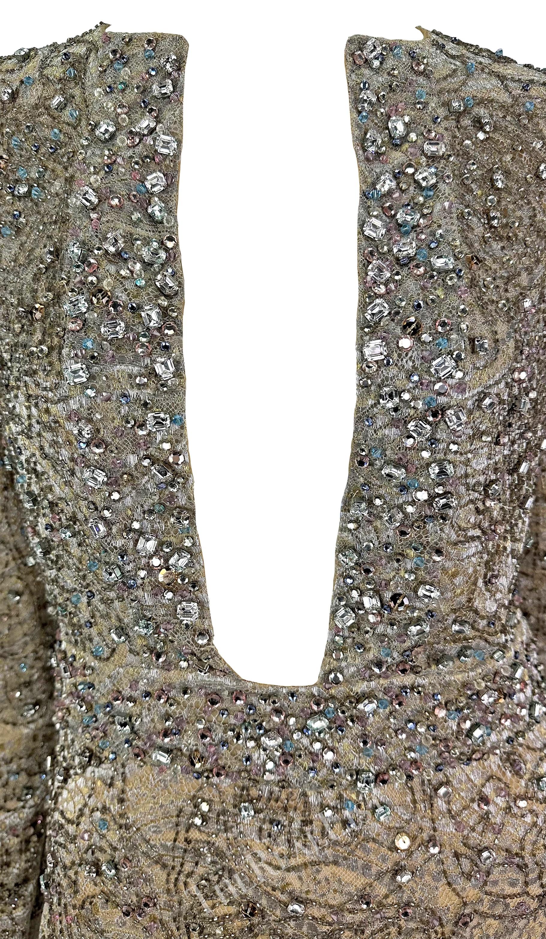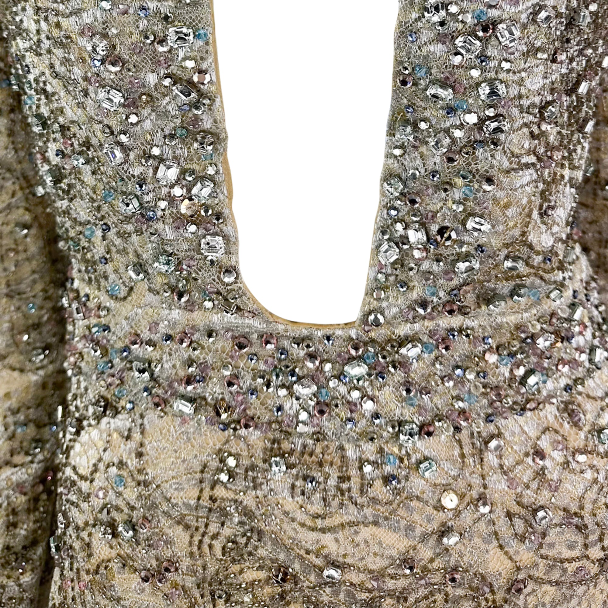 F/W 2000 Gucci by Tom Ford Rhinestone Beaded Plunge Silver Beige Lace Mini Dress
