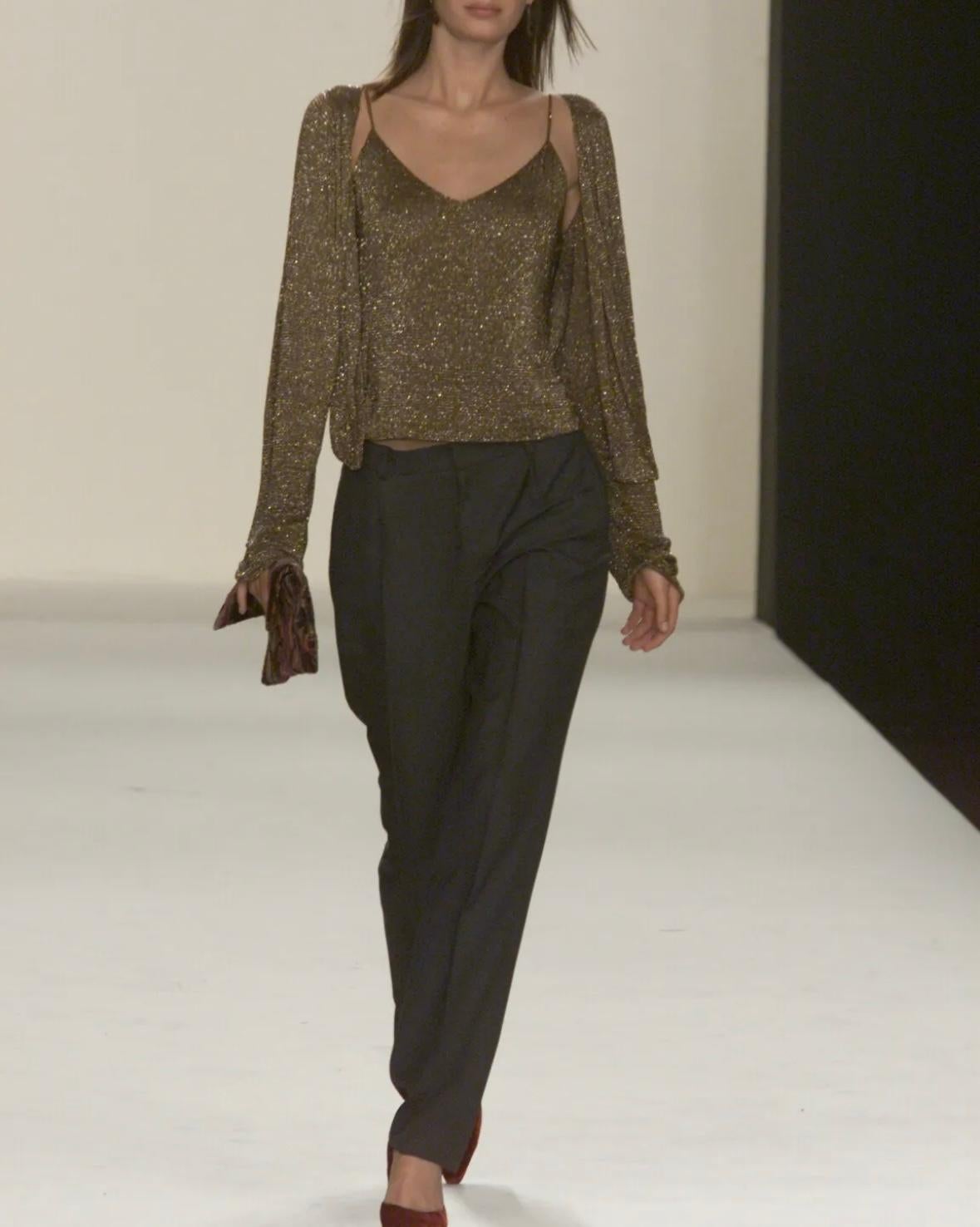 From Ralph Lauren’s Fall/Winter 2000 collection, this bronze cami tank is crafted from a brown silk knit densely hand-beaded with metallic beads. Featuring delicate crossover straps, the design was worn on the runway as look 45 and appeared in the season’s ad campaign modeled by Penelope Cruz.