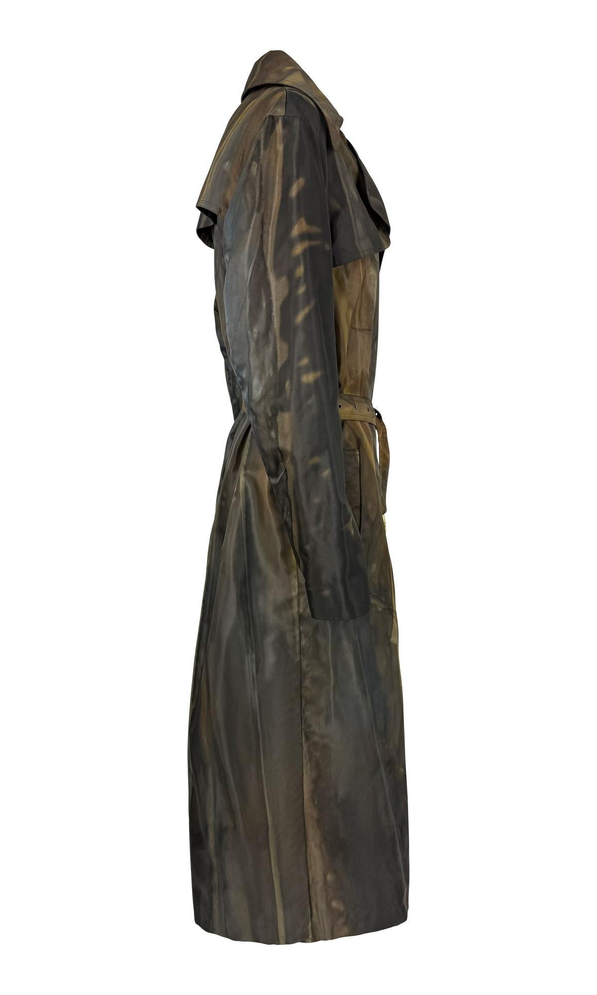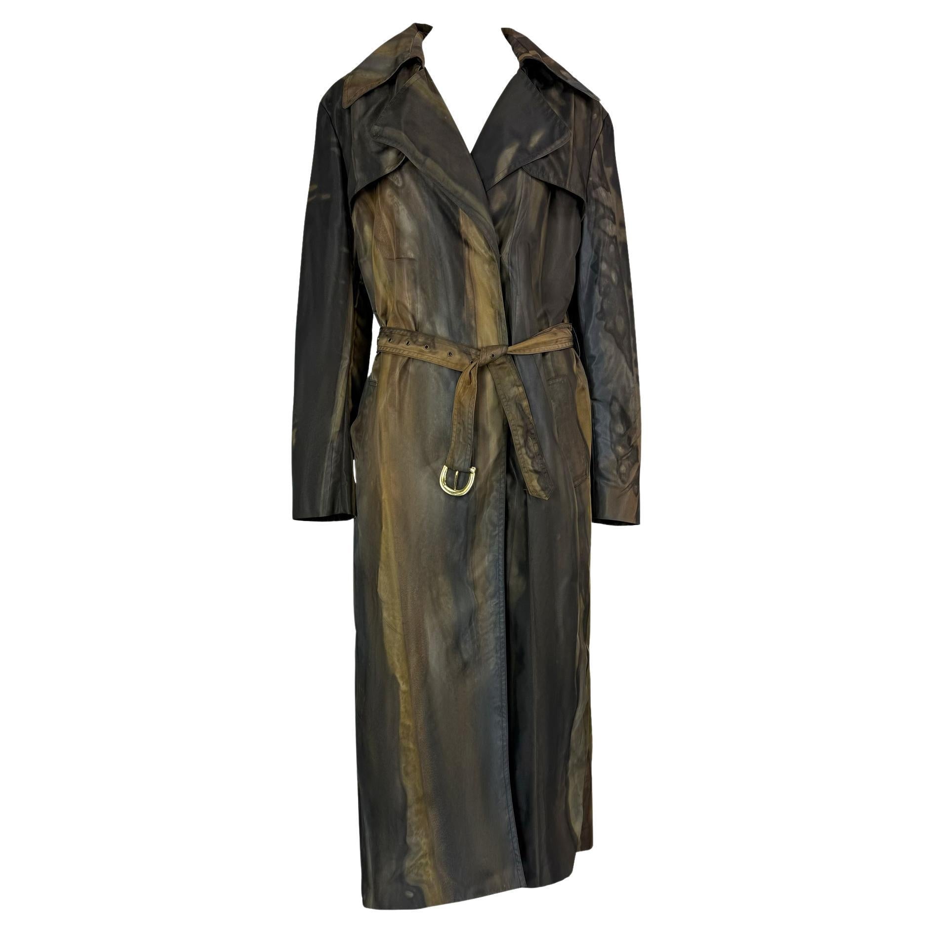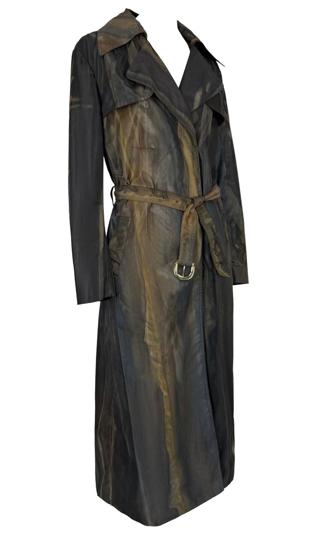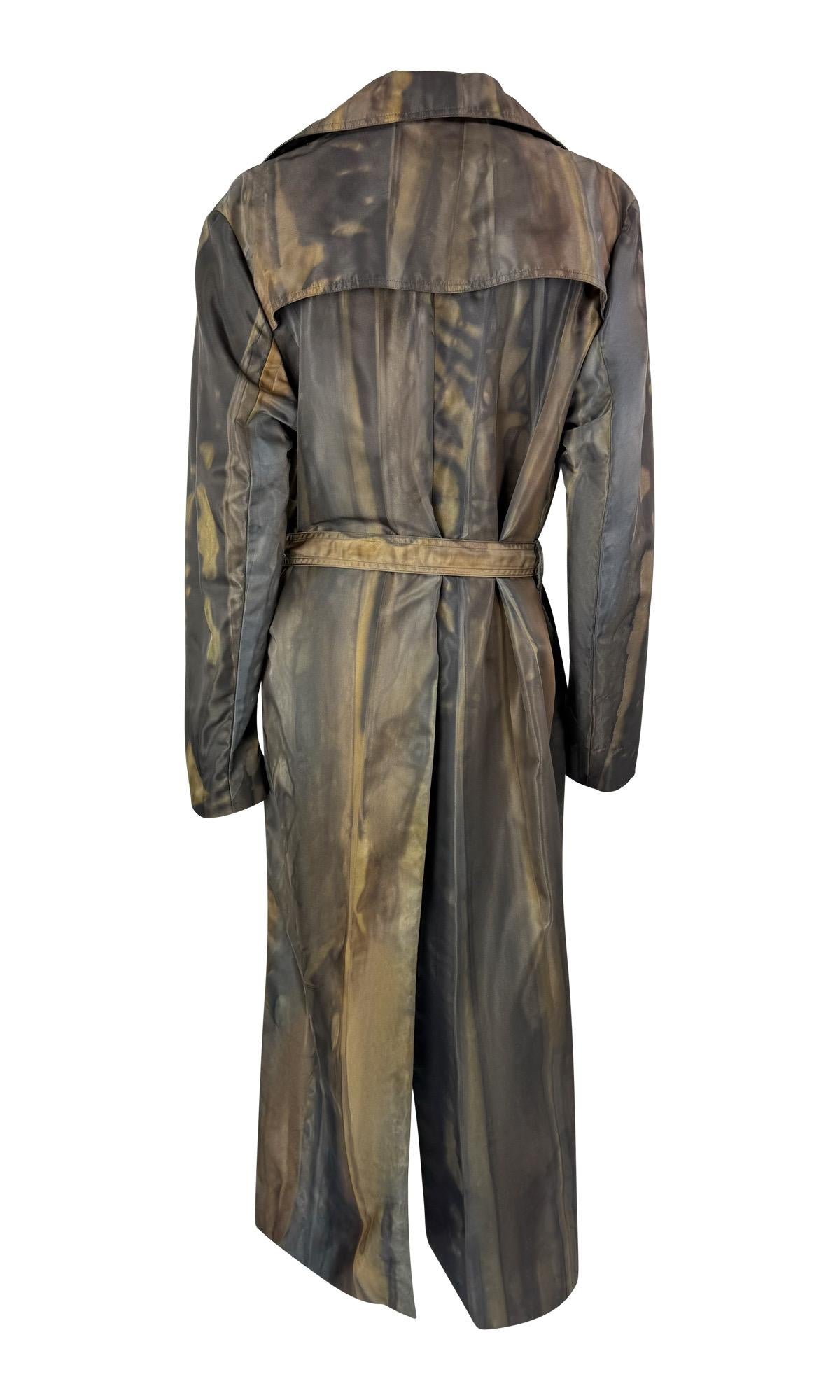 This Christian Dior brown nylon coat from Fall/Winter 2001, designed by John Galliano, features an abstract watercolor effect. The lightweight design is defined by trench coat stylings, a belted waist, and its fluid pattern.