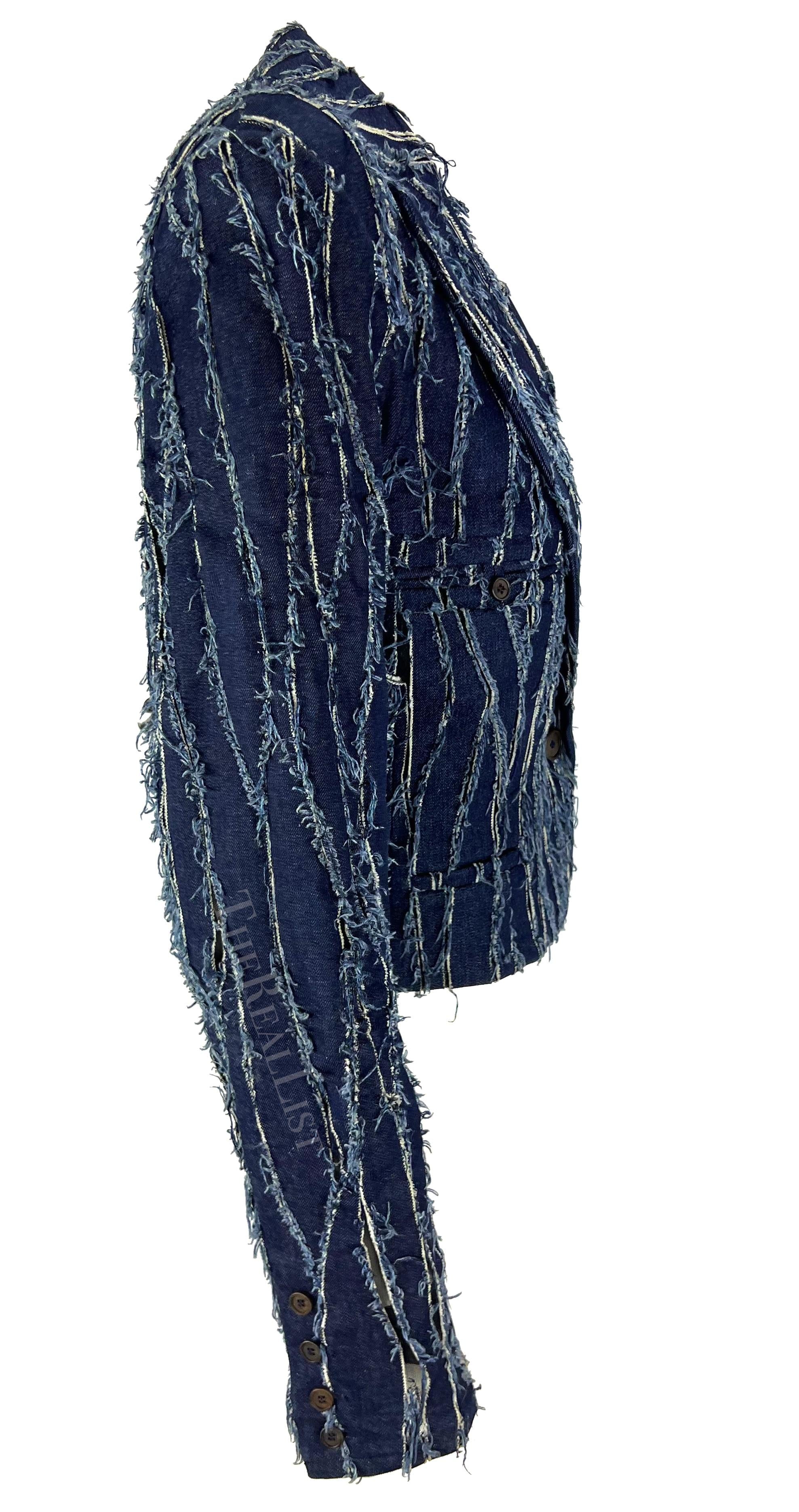 This distressed denim blazer from Christian Dior’s Fall/Winter 2001 collection was designed by John Galliano and exemplifies his masterful balance of deconstruction and refinement. Constructed from distressed denim patches layered over sheer mesh, the jacket reveals glimpses of transparency between panels for a subtly provocative effect. Cropped in silhouette and finished with a single front button closure, this piece is a striking example of Galliano’s inventive tailoring and his ability to turn denim into art.