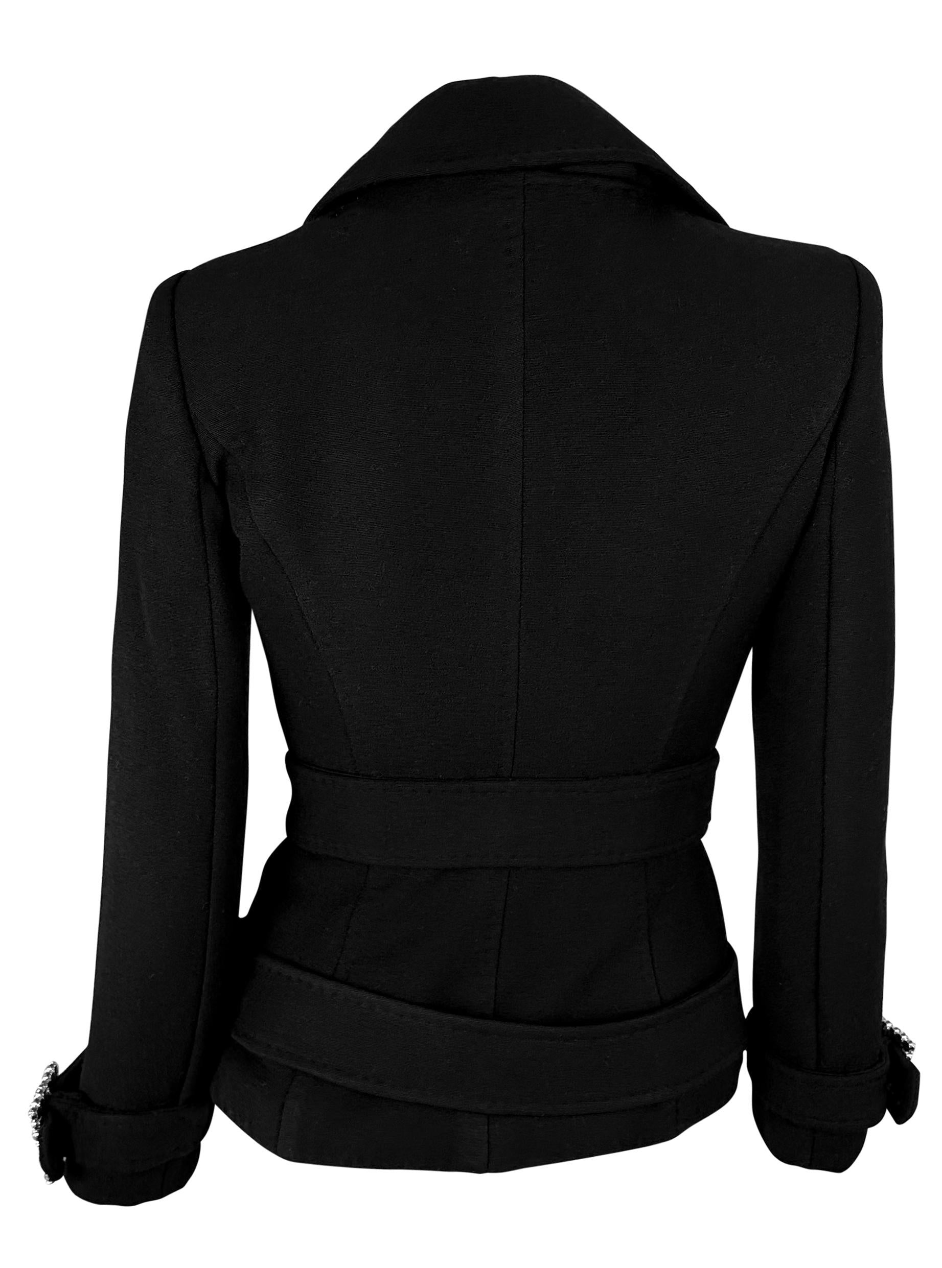 This black wool jacket from Dolce & Gabbana's Fall/Winter 2001 collection features double rhinestone buckles at the waist and cuffs. A similar version of the jacket debuted on the season's runway, the structured design is complemented by sparkling rhinestone buttons down the front.