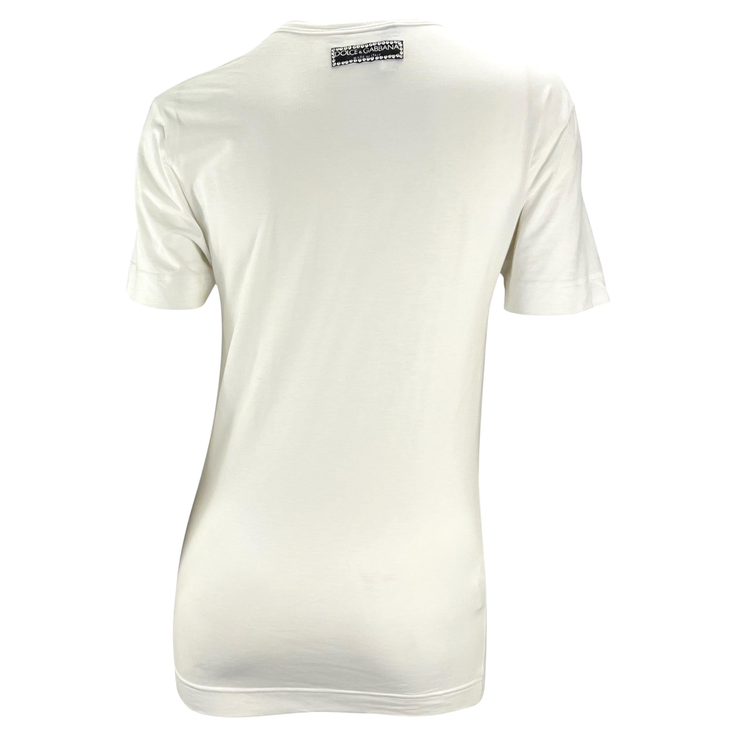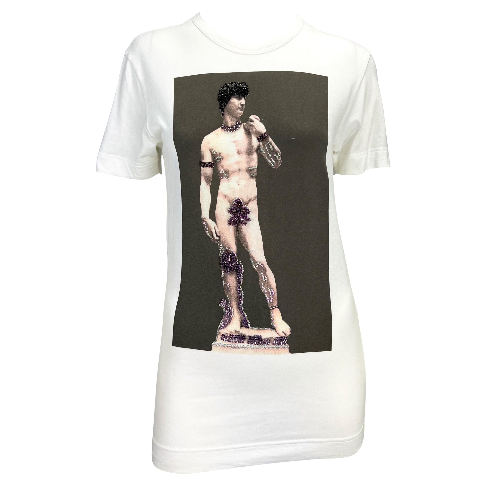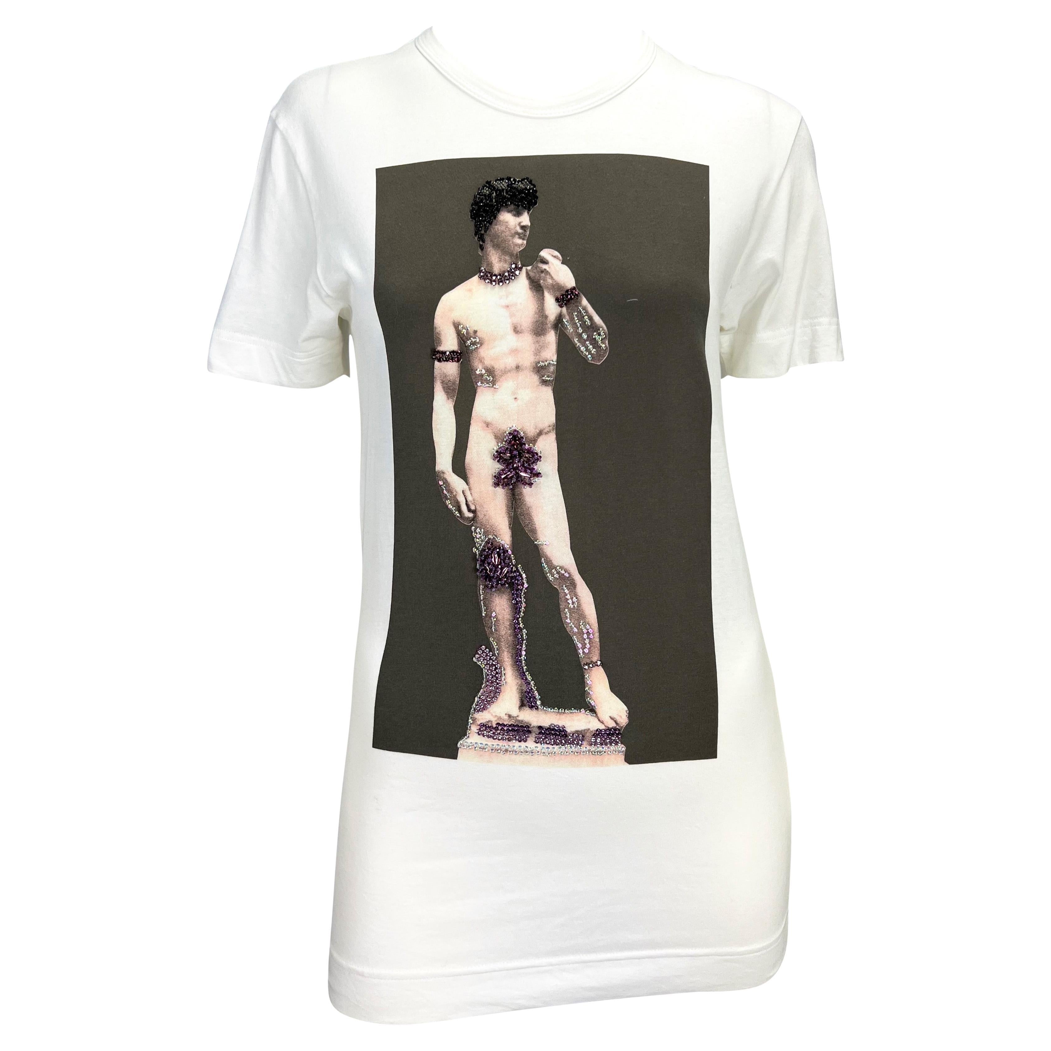 Presenting a fabulous printed Dolce and Gabbana t-shirt. From the Fall/Winter 2001 collection, this incredible t-shirt features a print of Michaelangelo's famous David sculpture in black and white. The print is camped up with bead and rhinestone accents. This classic white t-shirt is made with the Dolce and Gabbana brand tag below the nape and a border of rhinestones.