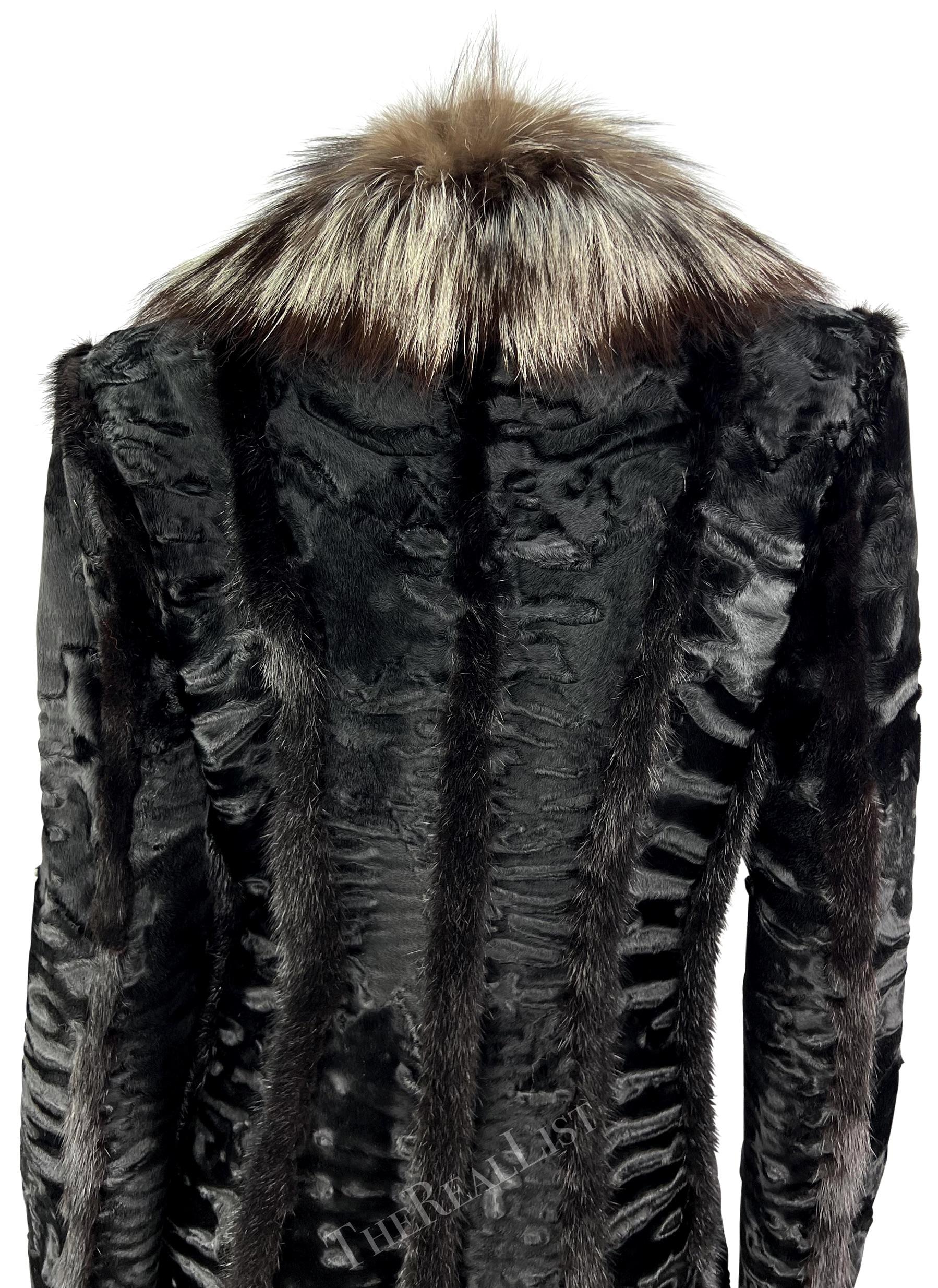 This luxurious full-length Gianni Versace coat from the Fall/Winter 2001 collection, designed by Donatella Versace, is crafted from black astrakhan fur with an opulent silver fox fur trim along the collar and front opening. The design includes mink accents, adding to the coat's rich texture and depth. Marked as a men's extra-small, this unisex full length coat is the ultimate vintage Versace statement piece.