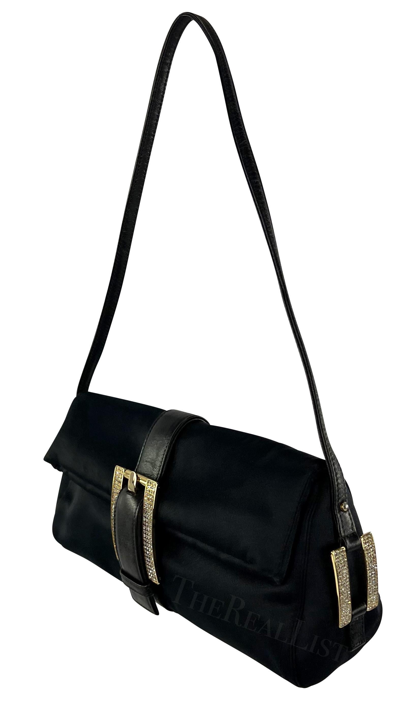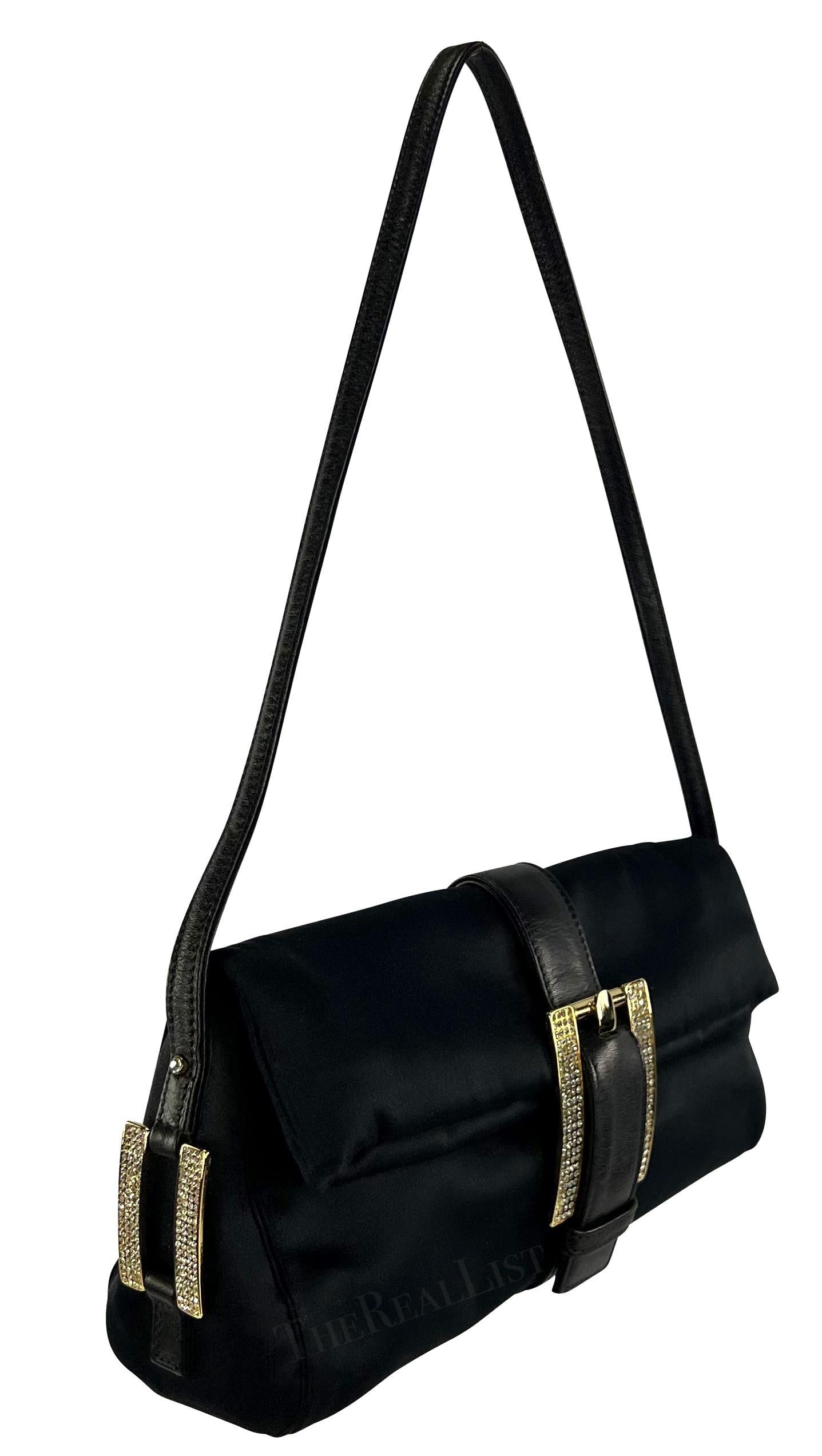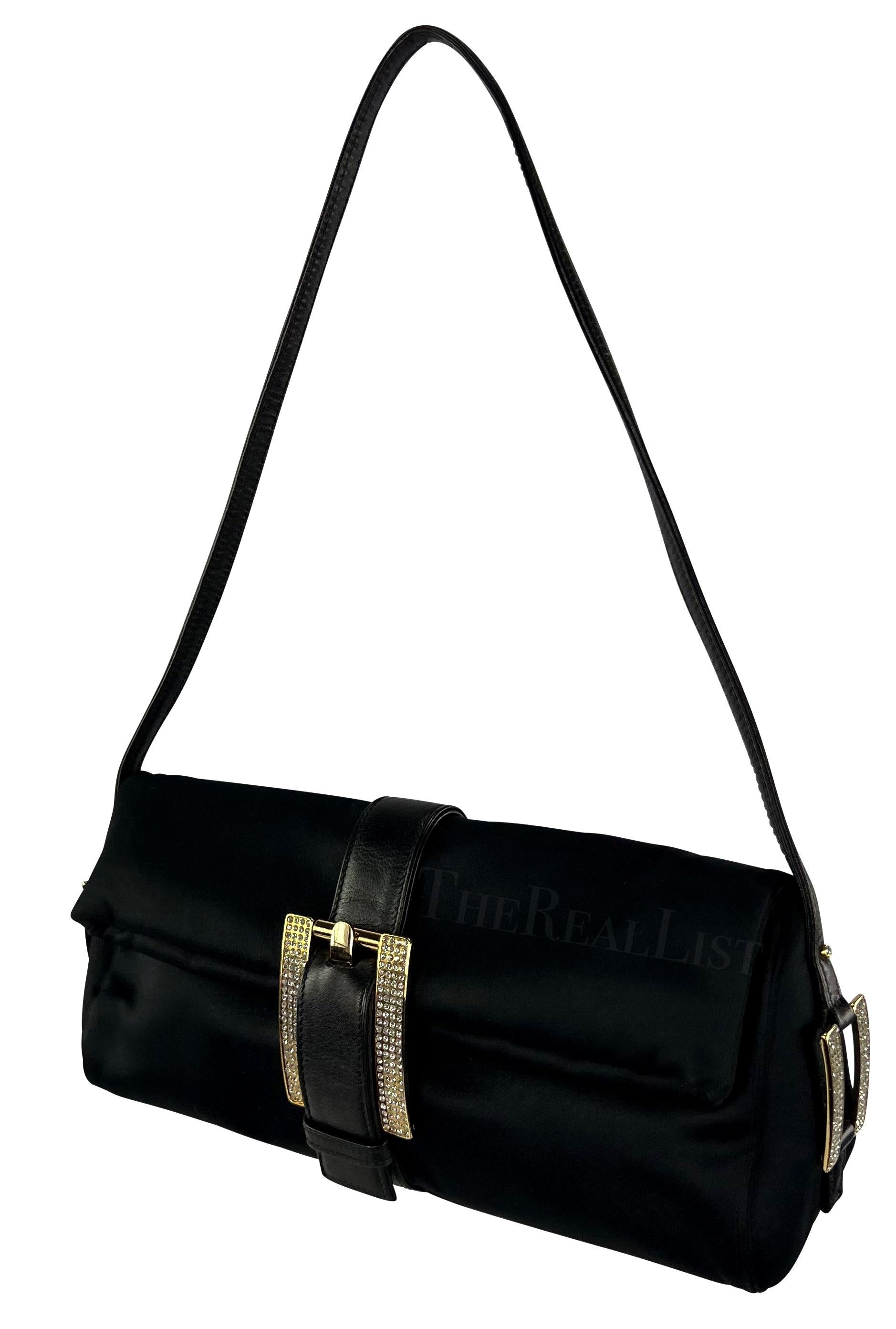 Presenting a chic black satin Gianni Versace shoulder bag, designed by Donatella Versace. From the Fall/Winter 2001 collection, this bag shares the distinctive buckle shape found in various runway looks from that season. Boasting black leather accents and a large, rhinestone-adorned gold-tone buckle, this beautiful bag is a perfect fusion of style and sophistication. Ideal for an upscale night out, this Donatella design will enrich any wardrobe or collection.
