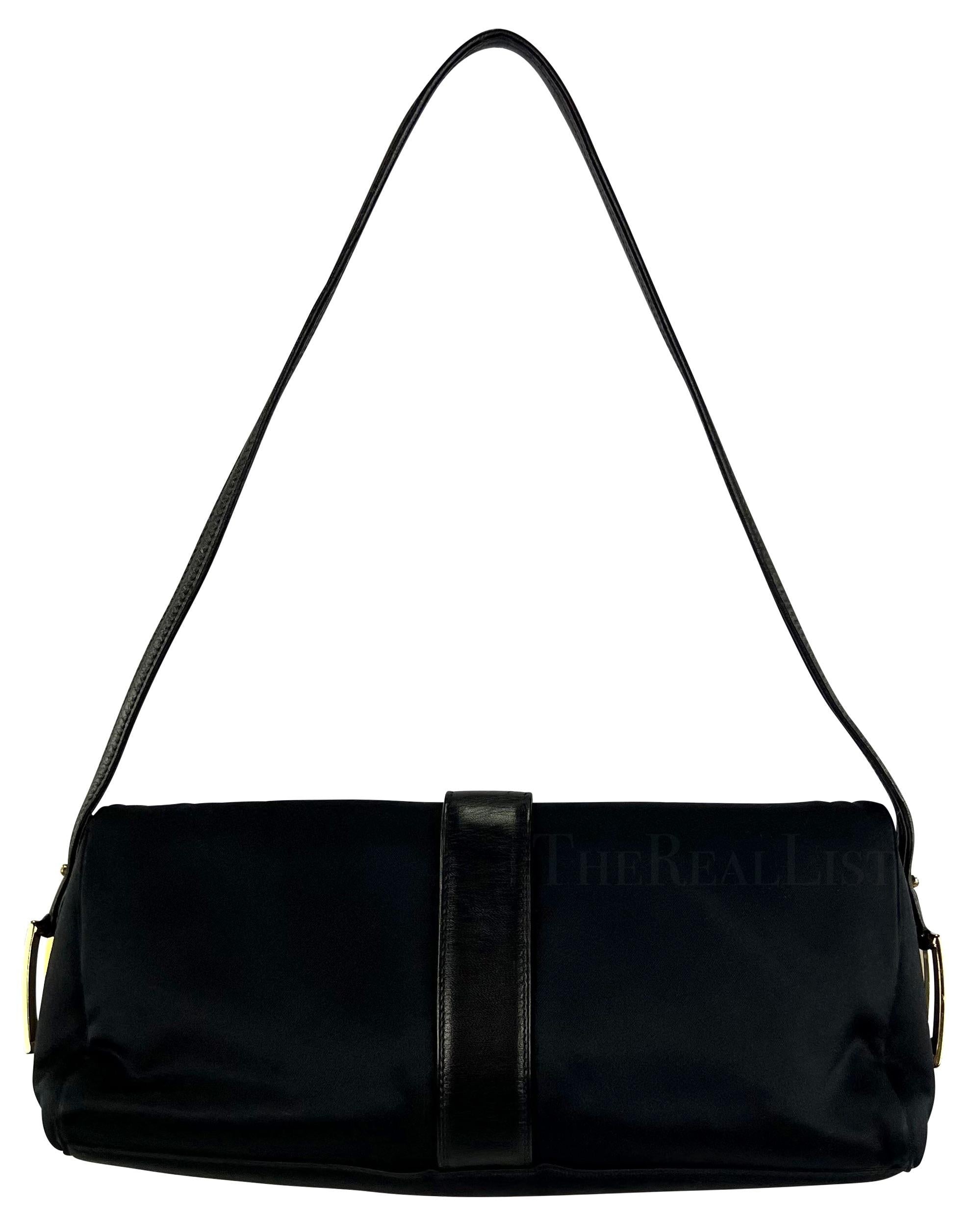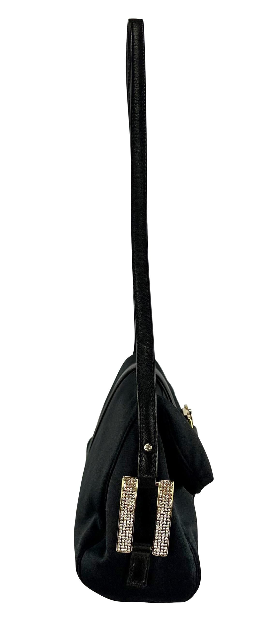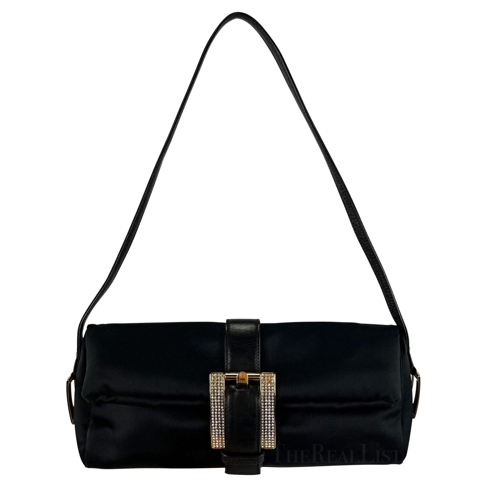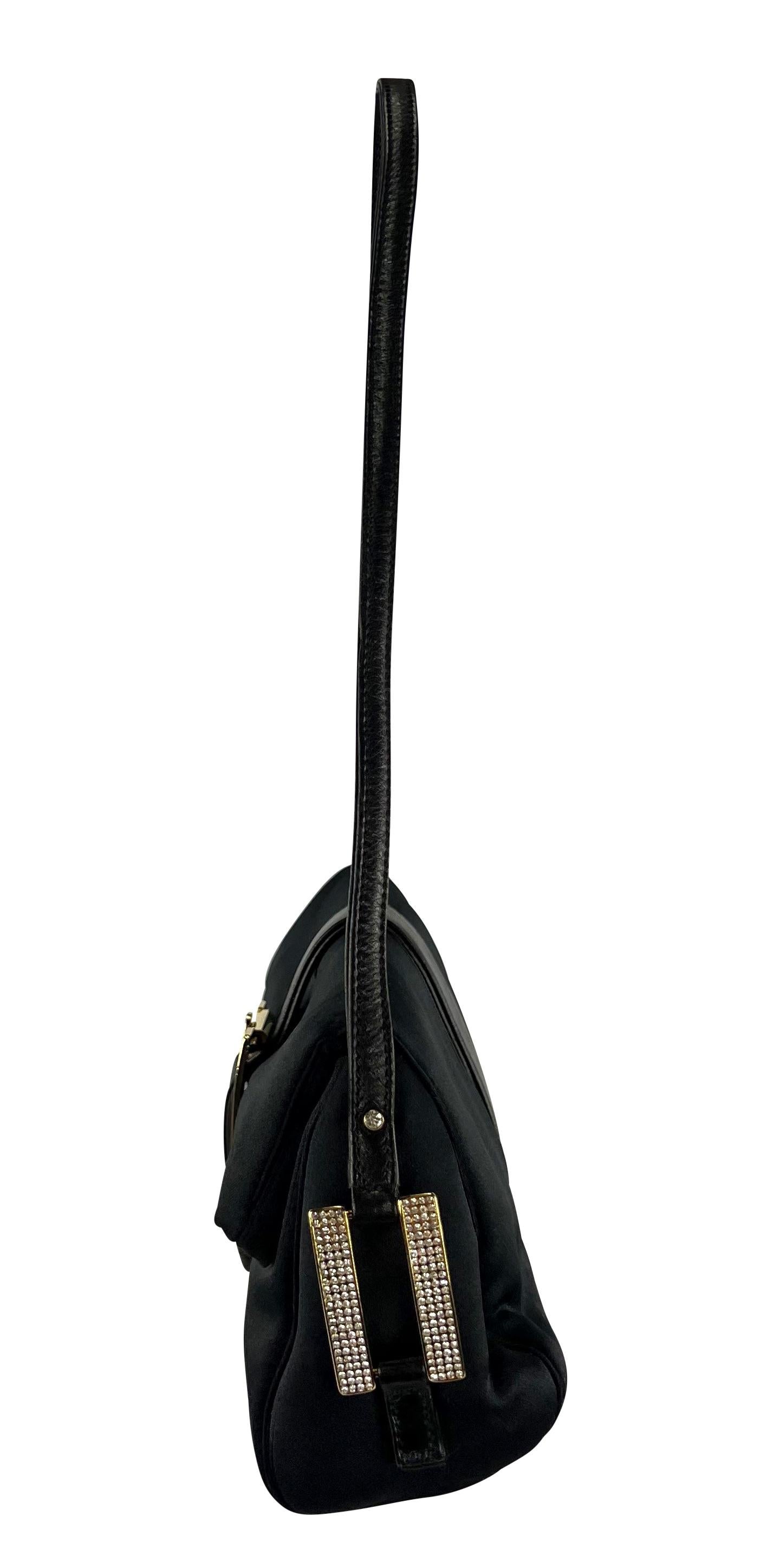 Presenting a chic black satin Gianni Versace shoulder bag, designed by Donatella Versace. From the Fall/Winter 2001 collection, this bag shares the distinctive buckle shape found in various runway looks from that season. Boasting black leather accents and a large, rhinestone-adorned gold-tone buckle, this beautiful bag is a perfect fusion of style and sophistication. Ideal for an upscale night out, this Donatella design will enrich any wardrobe or collection.