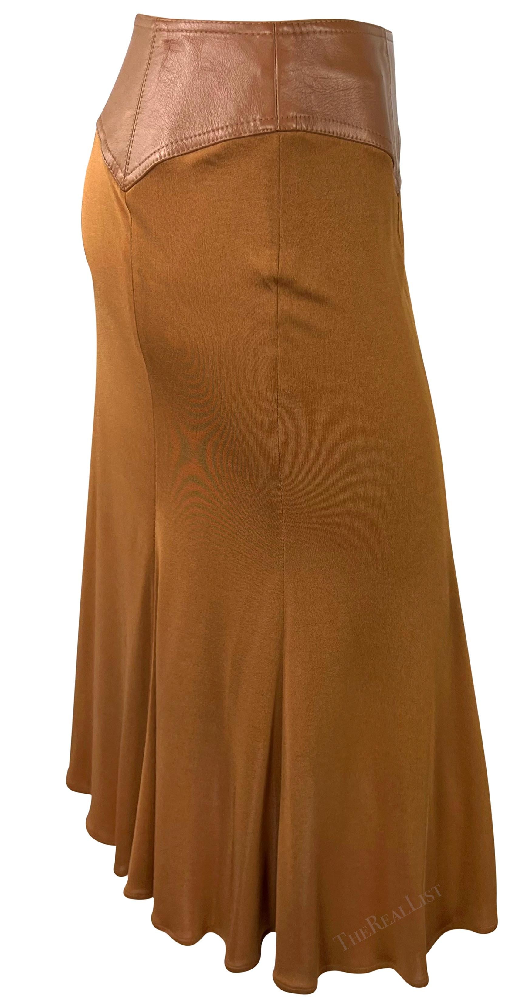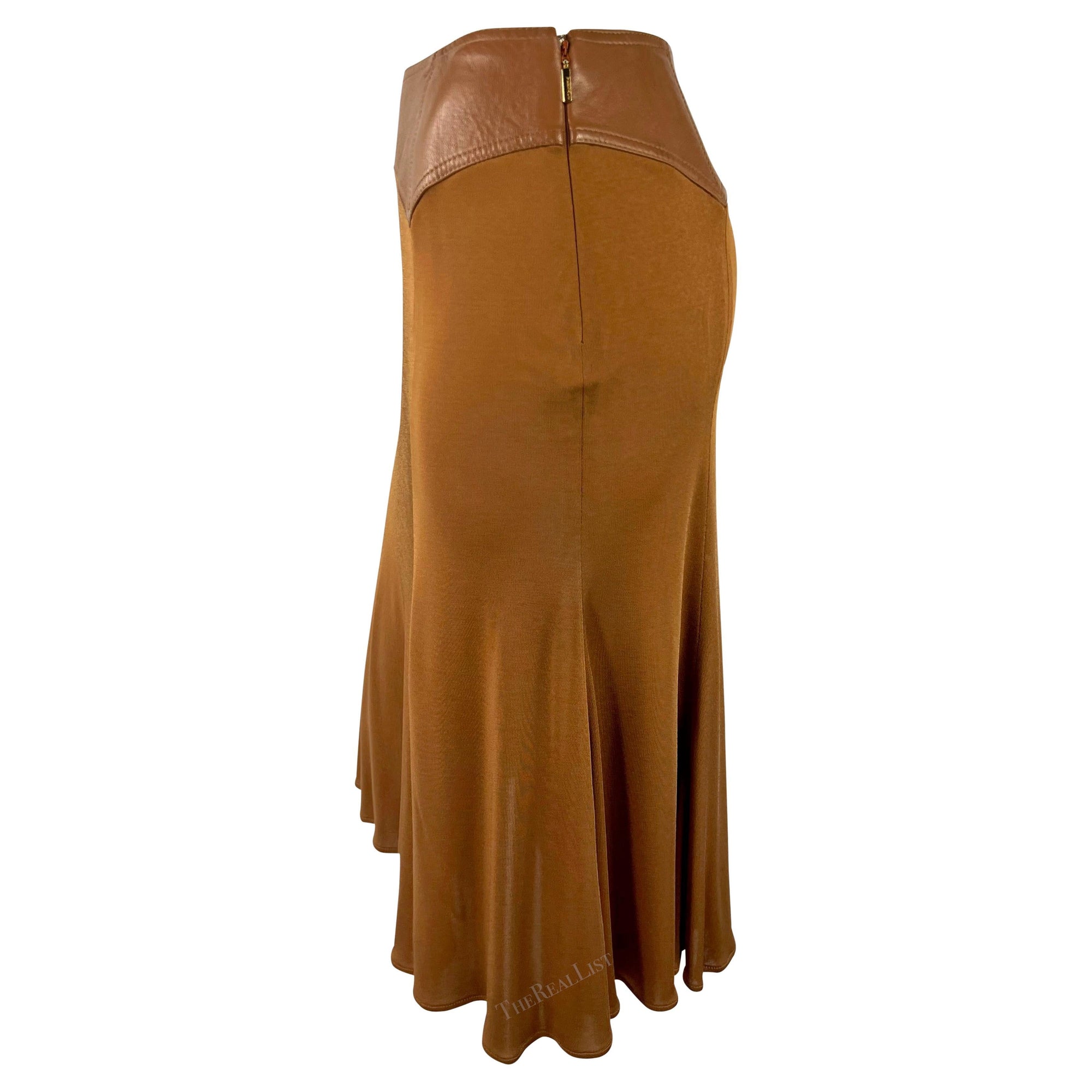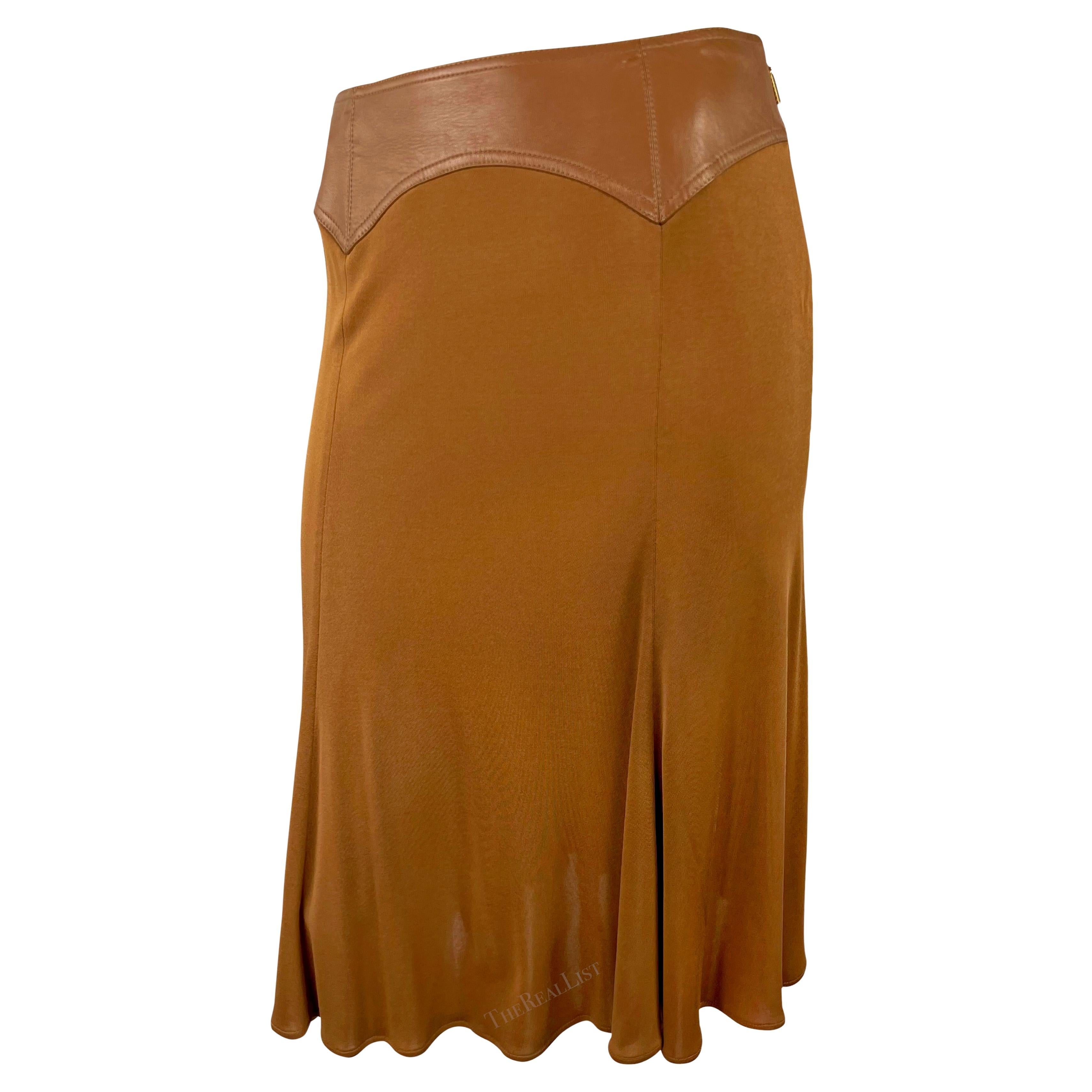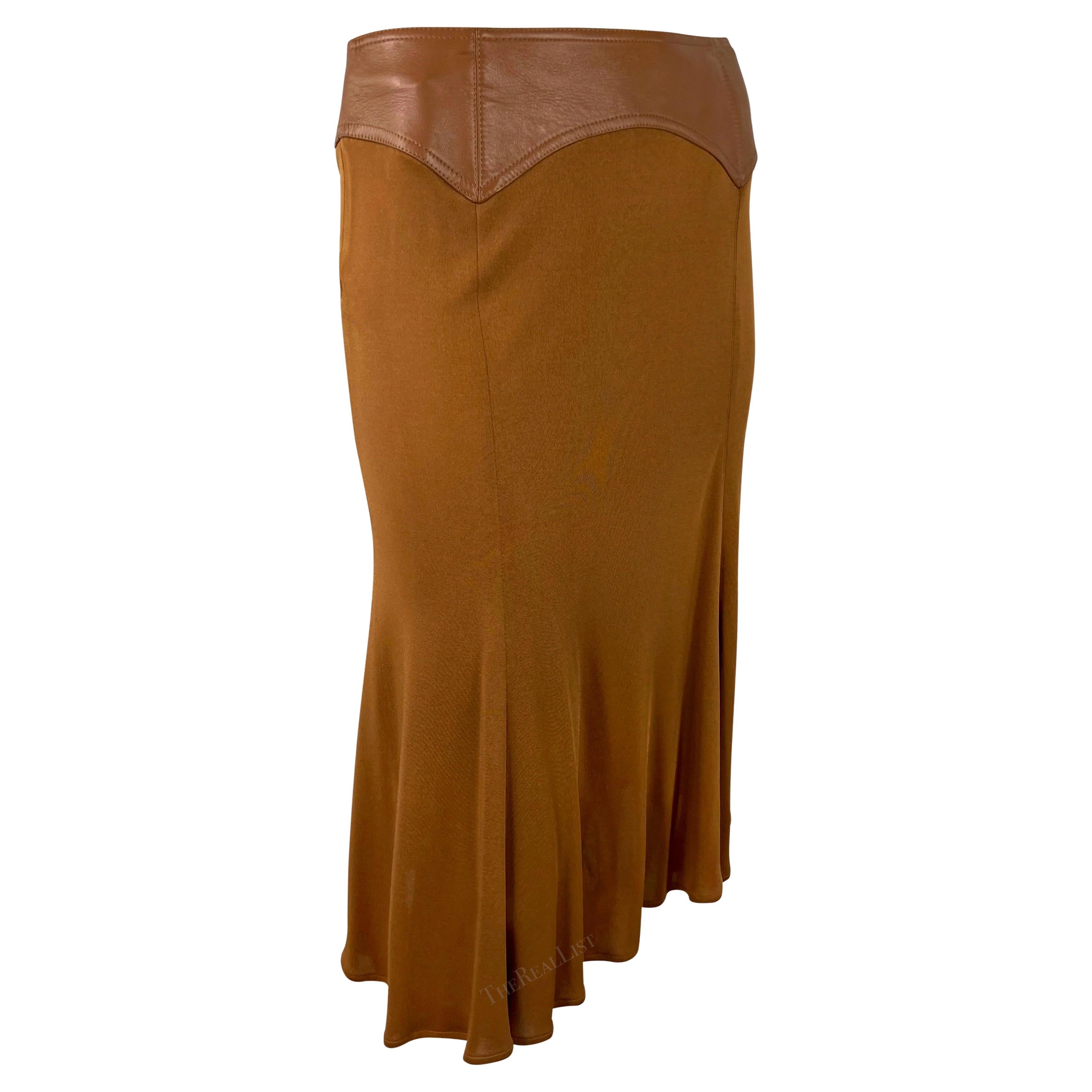 This stunning saddle brown Gianni Versace skirt with leather accents, was designed by Donatella Versace. From the Fall/Winter 2001 collection, similar styles and leather accented pieces were highlighted on the season's runway. This knee-length handkerchief skirt is complemented by an inverse scallop-cut saddle brown leather accent encircling the waist.