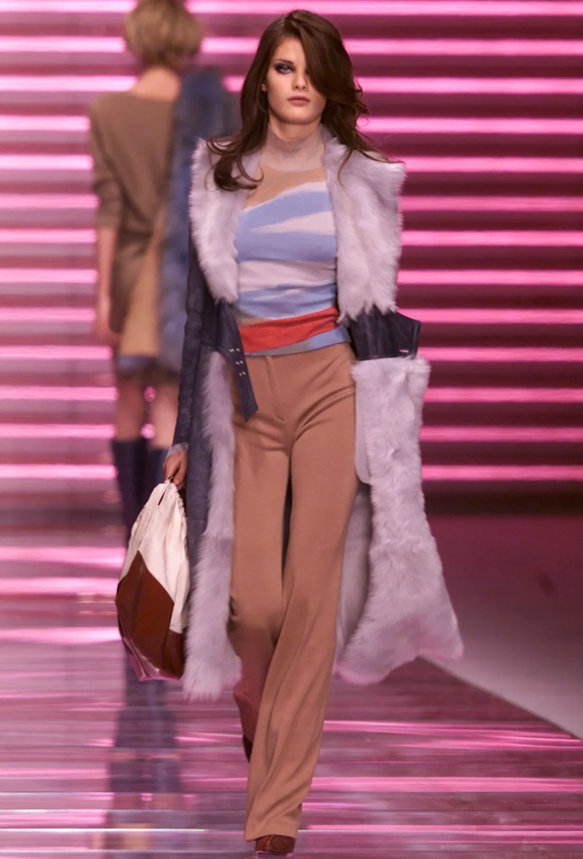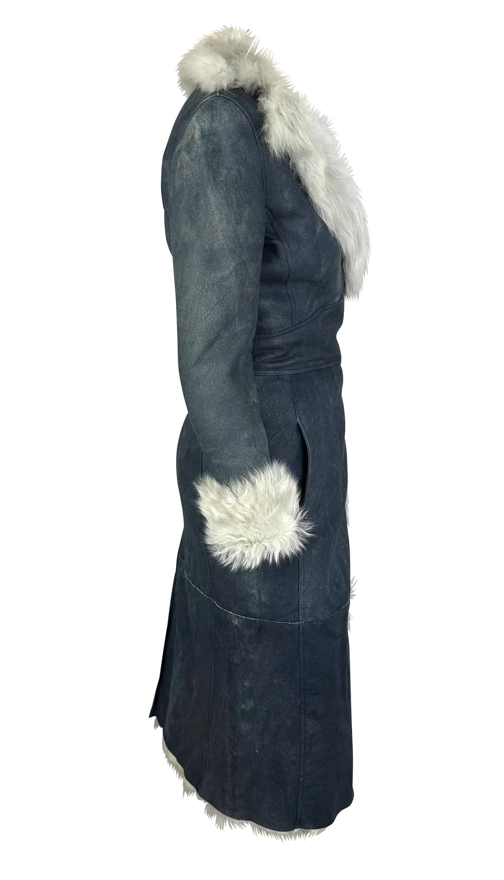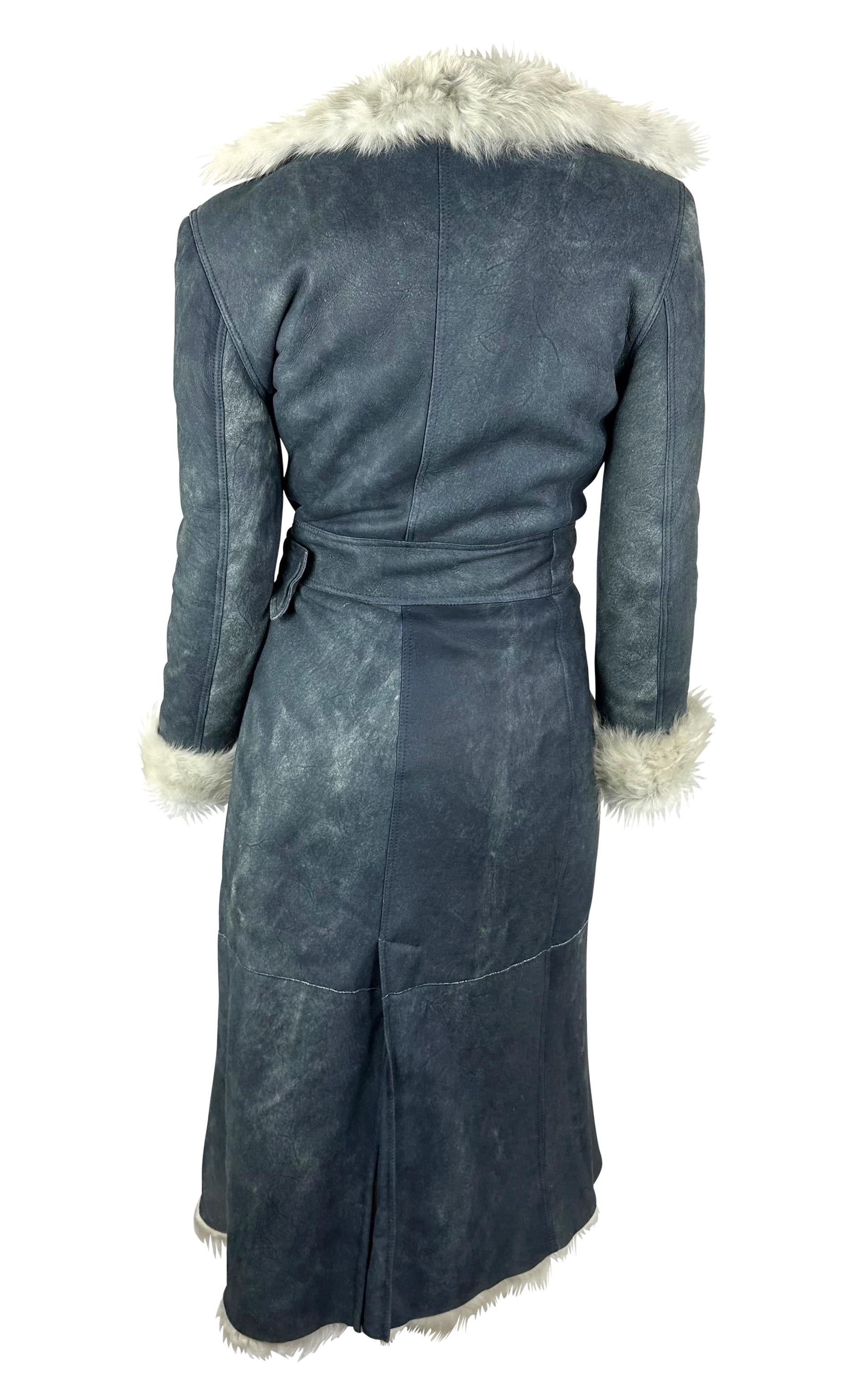 This navy and grey shearling coat from Gianni Versace’s Fall/Winter 2001 collection, designed by Donatella Versace, debuted on the runway as look 14 on Isabeli Fontana.The full-length design is crafted entirely from shearling and features a built-in waist belt that defines the silhouette. The coat was also prominently featured in the season's ad campaign photographed by Steven Meisel, further cementing its place in Versace’s early-2000s history. A documented archival piece, this runway Versace coat exemplifies Donatella’s bold yet refined vision for the house.