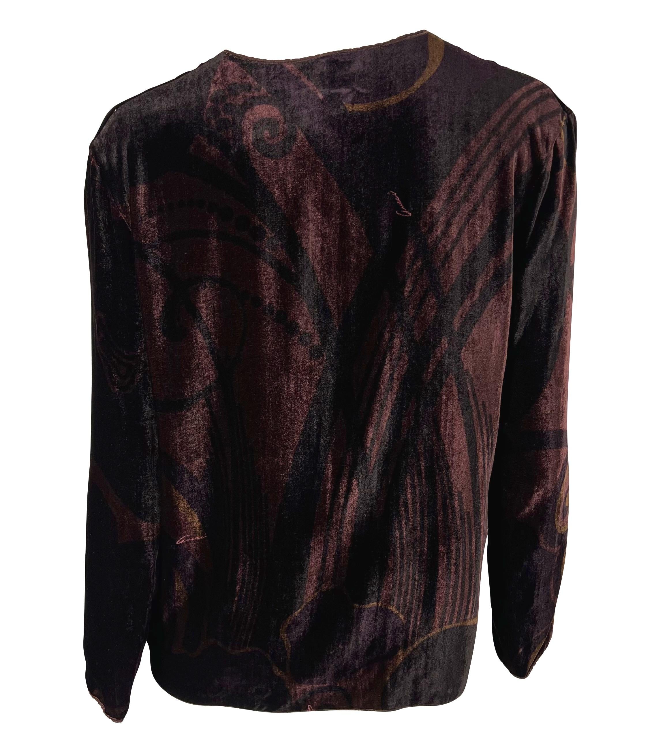 Presenting a luxurious brown velvet Gucci tunic top, designed by Tom Ford. From the Fall/Winter 2001 collection, this loose-fitting top features a plunging v-neckline, a small pleat below the neckline, and an abstract print with 'Gucci' written in cursive throughout.
