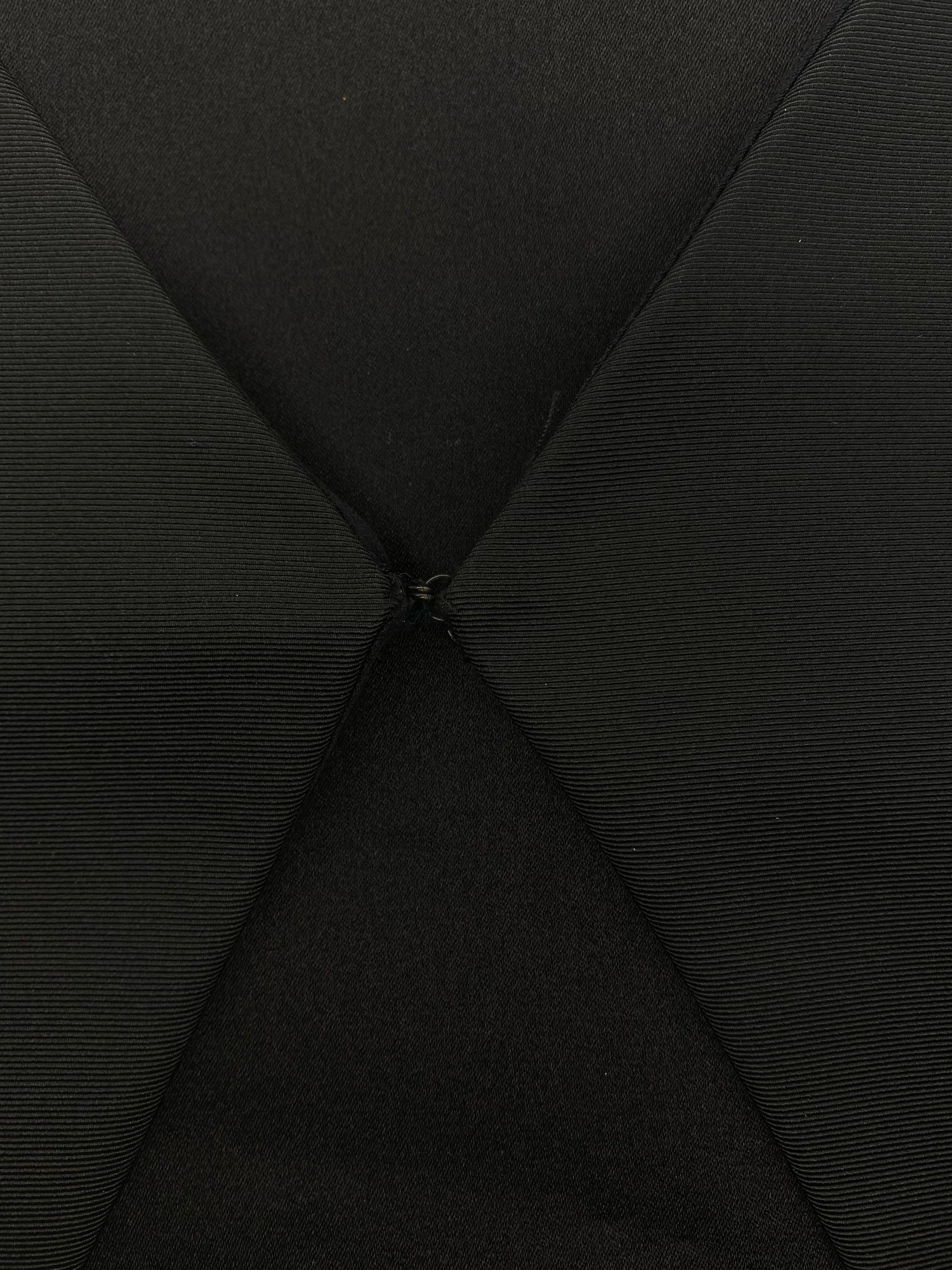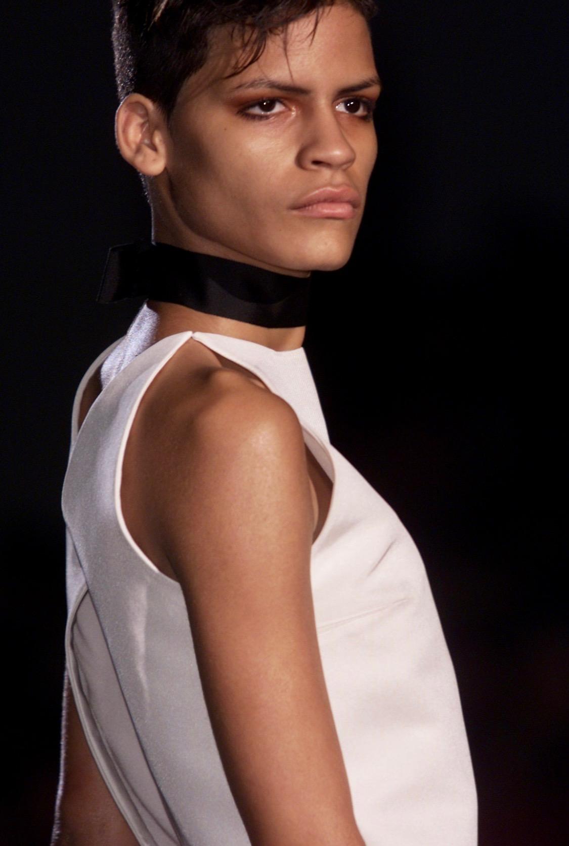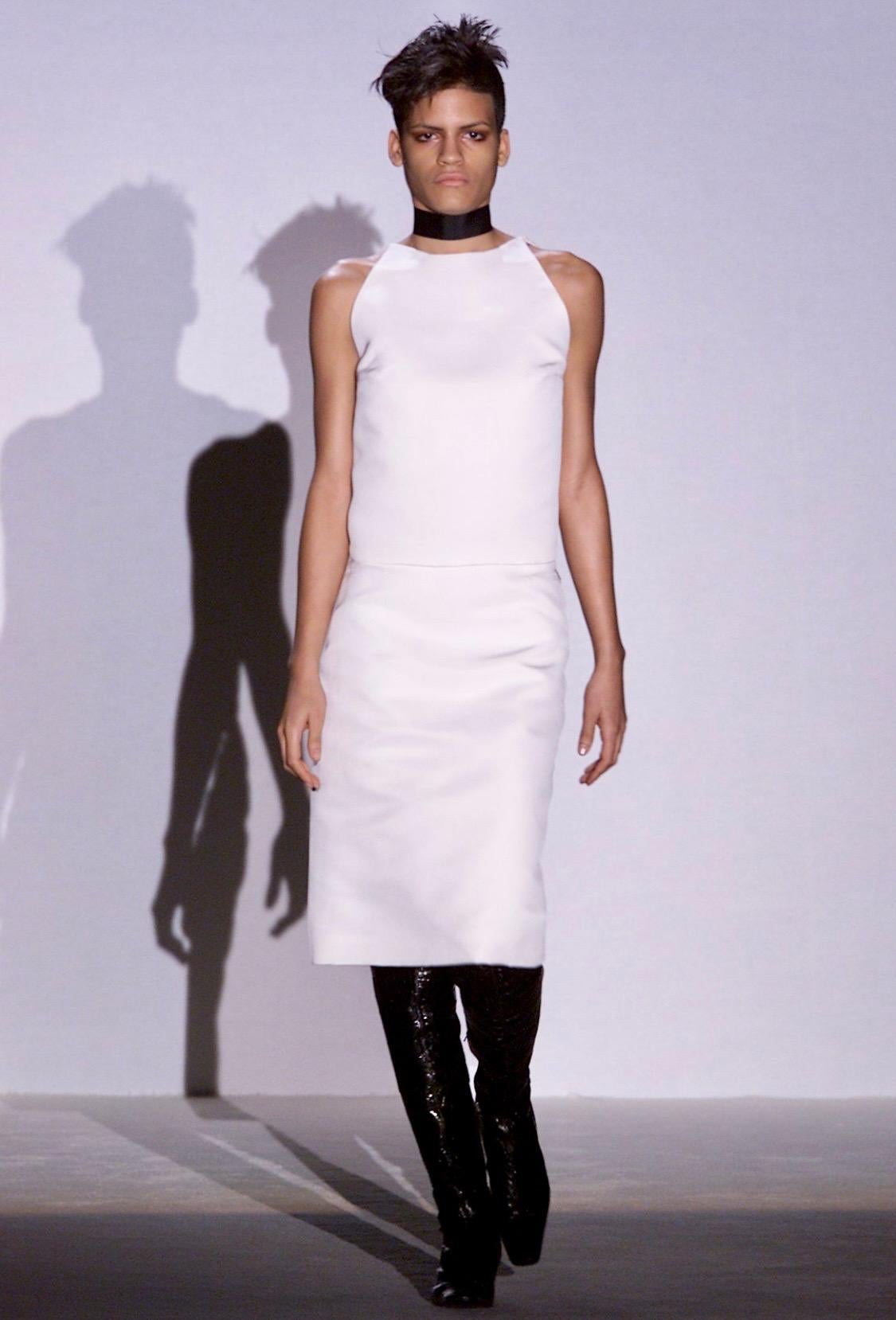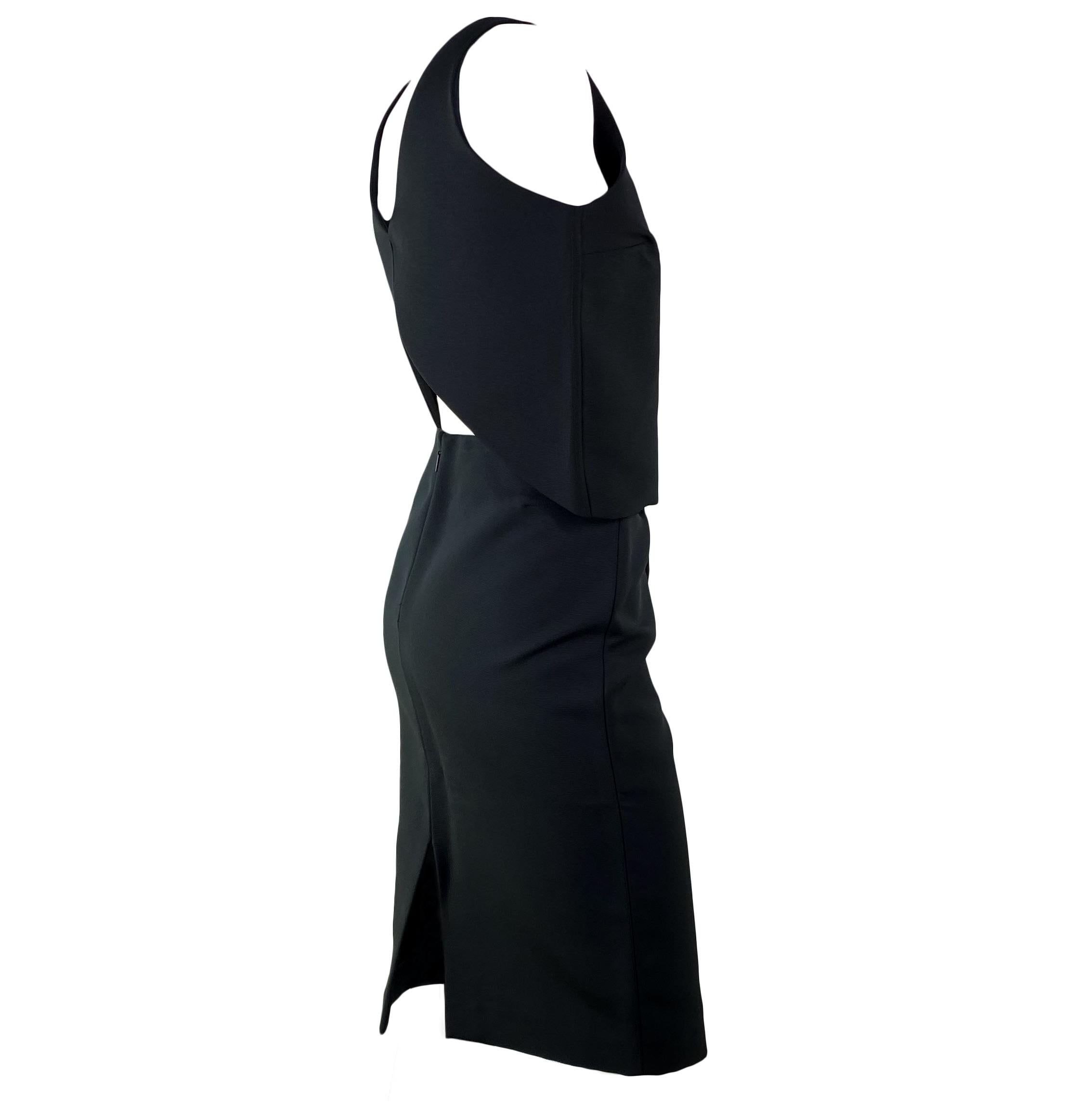 A chic black silk two-piece skirt set designed by Tom Ford for Gucci’s Fall/Winter 2001 collection. This ensemble debuted on the runway in white as Look 31, modeled by Omahyra Mota, and was also featured in the season’s ad campaign on Erin Wasson, photographed by Terry Richardson. Defined by large triangular cutouts, the set embodies Ford’s signature sensual minimalism.