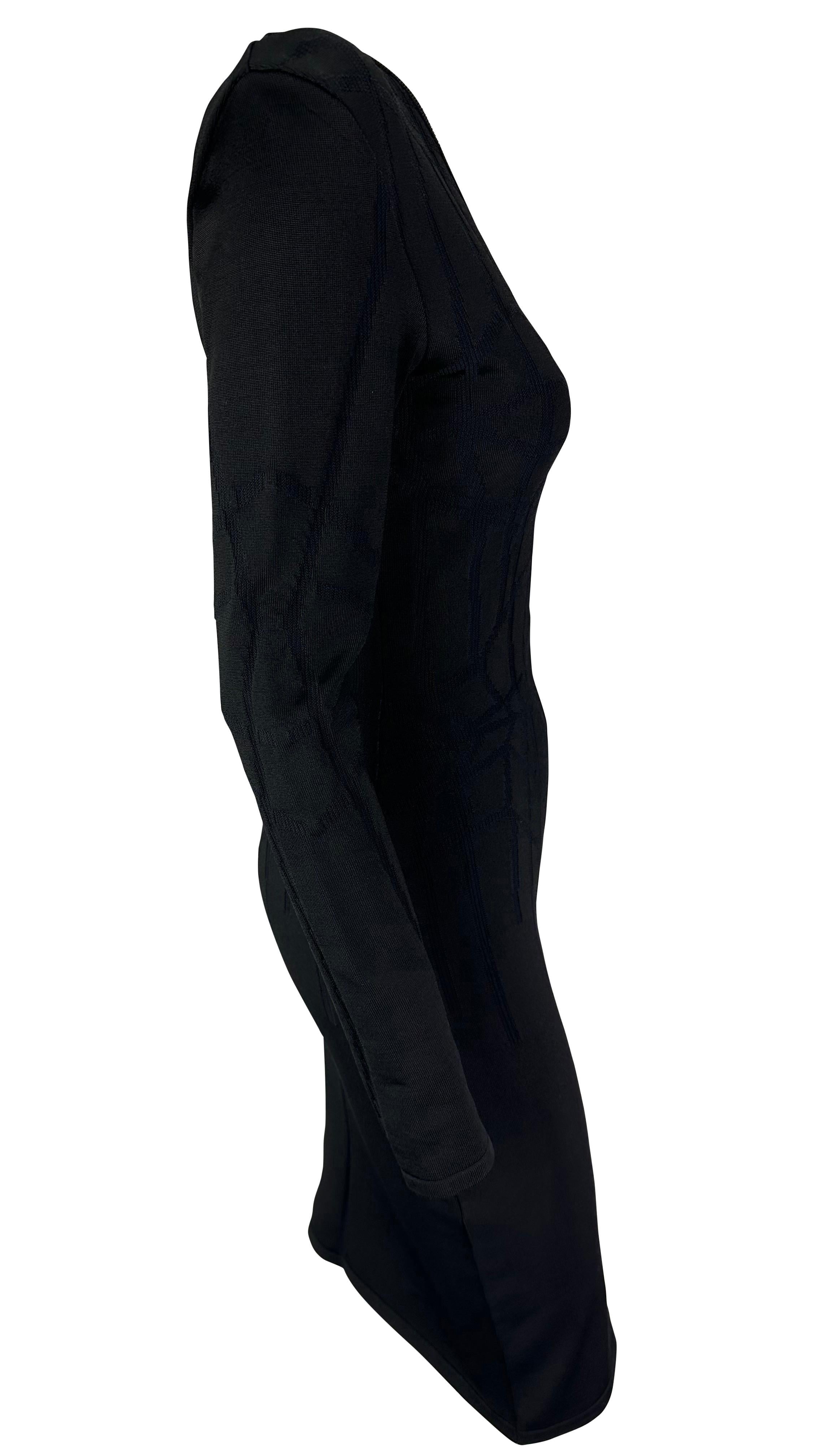 Presenting a chic black knit Thierry Mugler body con dress, designed by Manfred Mugler for his final collection. From the Fall/Winter 2001 collection, this fabulous mini dress features long sleeves and a v-neckline. A version of this stunning dress debuted in red on the runway. This dress is elevated with a Mugler touch featuring a linear pattern that emphasizes and contours the shape of the female form. A perfectly sexy yet conservative little black dress, add a touch of sexy elegance to your style with this vintage Thierry Mugler treasure.
