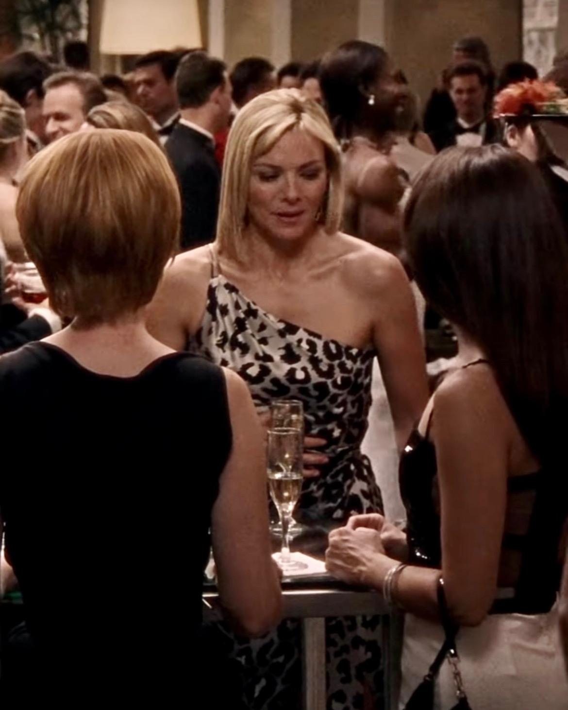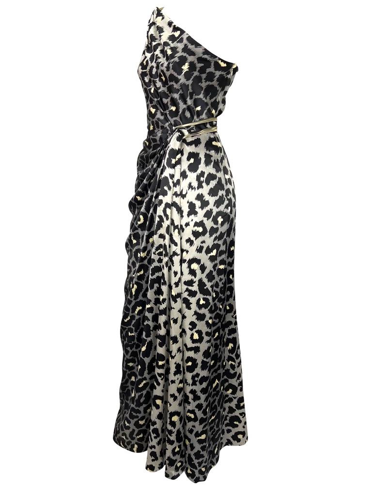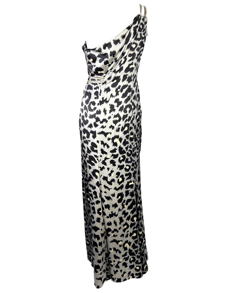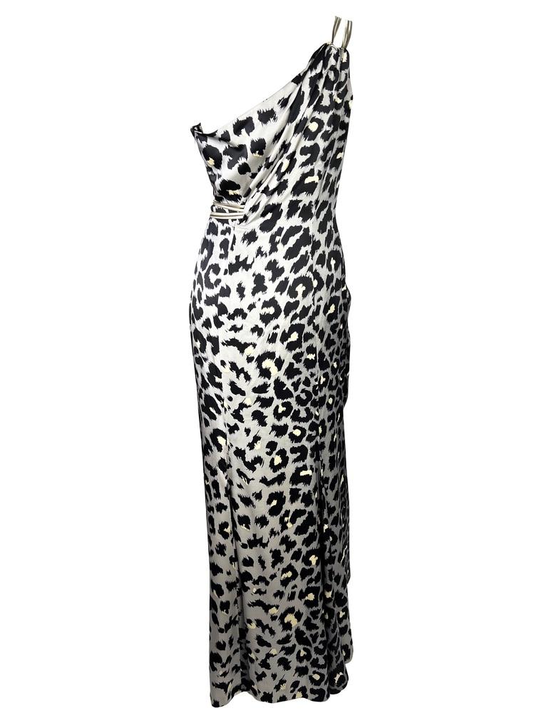 Presenting a stunning silver leopard print silk Thierry Mugler Couture gown from Manfred Thierry Mugler's final collection before his retirement, the Fall/Winter 2001 "Beasts" collection. This one-shoulder gown is constructed entirely of luxurious silk with metal snake chain accents at the waist and shoulder. The one-shoulder strap creates an asymmetric design balanced by the metal chain at the opposite side's waist and high slit. An absolute masterpiece, this dress debuted on the season's runway. It was even worn by Kim Cattrall's character Samantha Jones in Episode 15, Season 4 of the iconic Sex and the City.