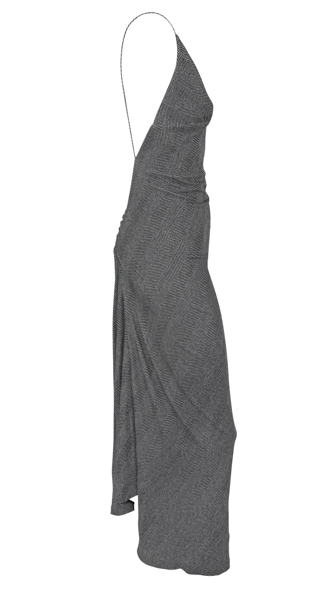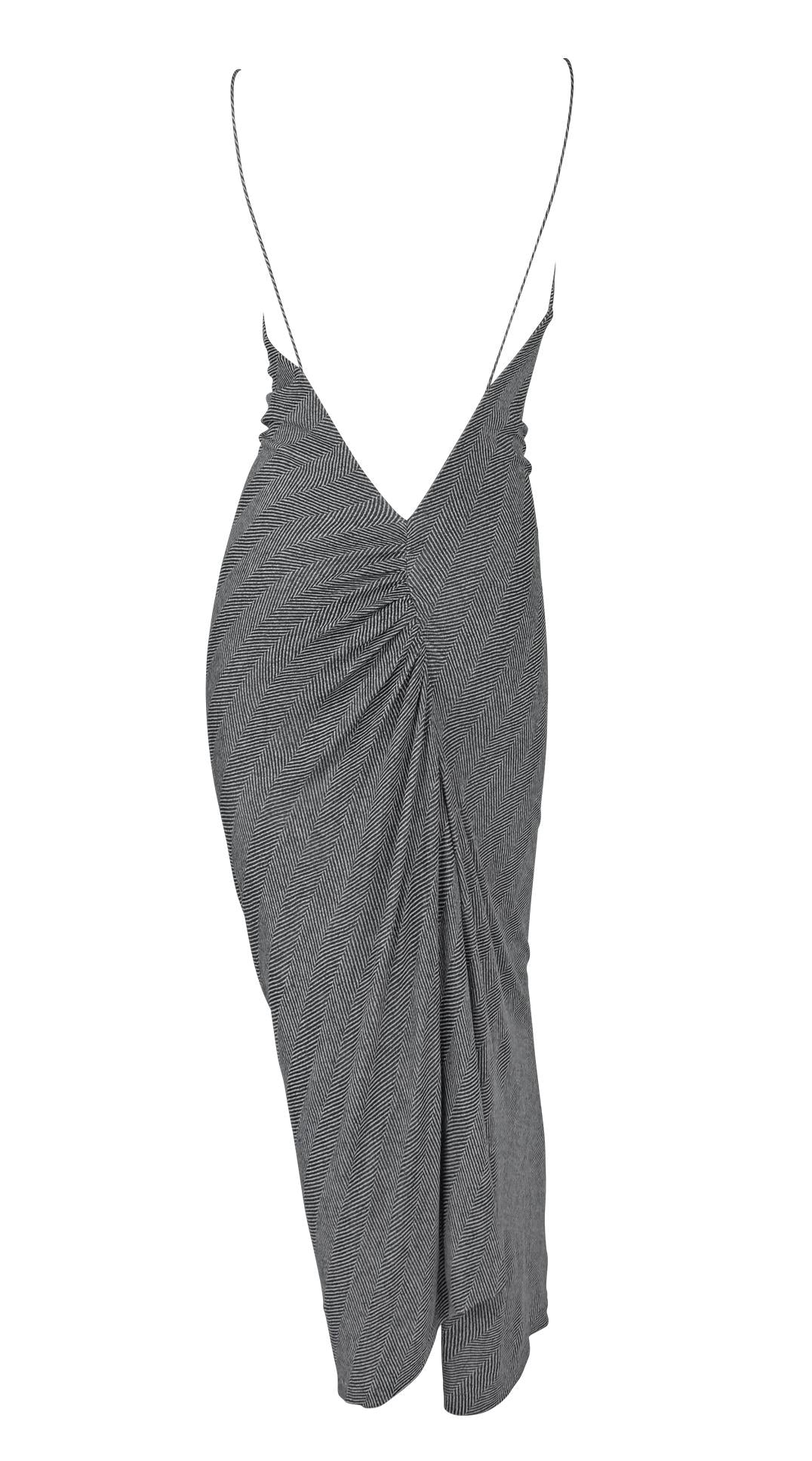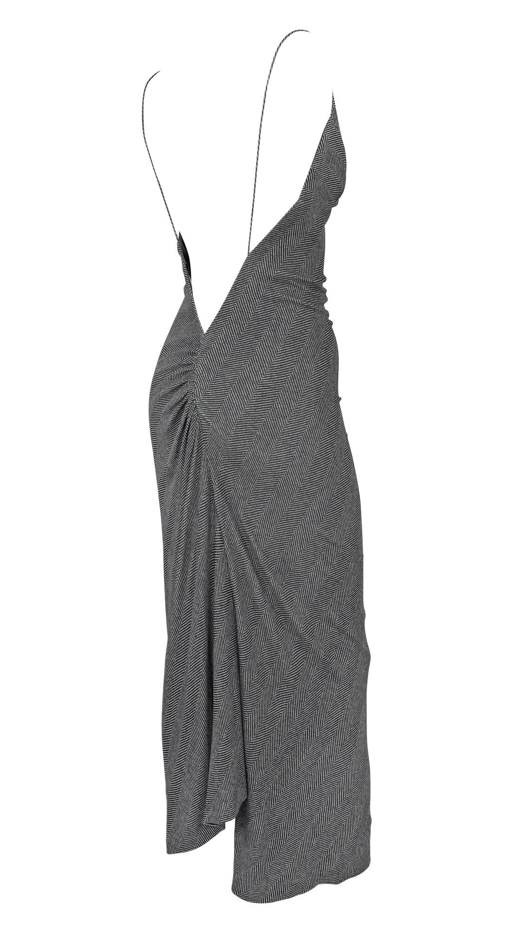 From Yigal Azrouël's Fall/Winter 2001 collection, this grey herringbone dress features a bodycon silhouette with a plunging neckline and dramatic open back. Finished with ultra-thin straps, subtle ruching between the hips, and an asymmetrical draped slit, this runway piece blends a classic suiting-style herringbone pattern with sultry minimalism.