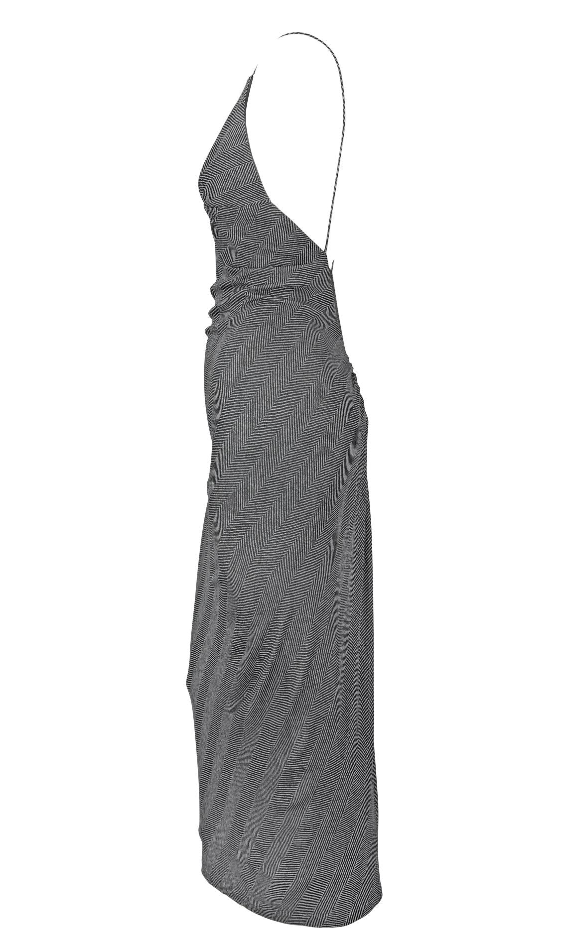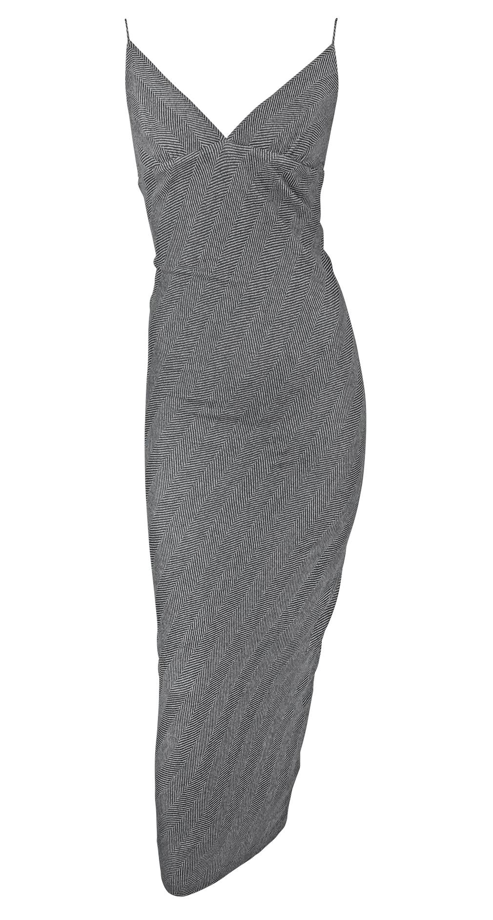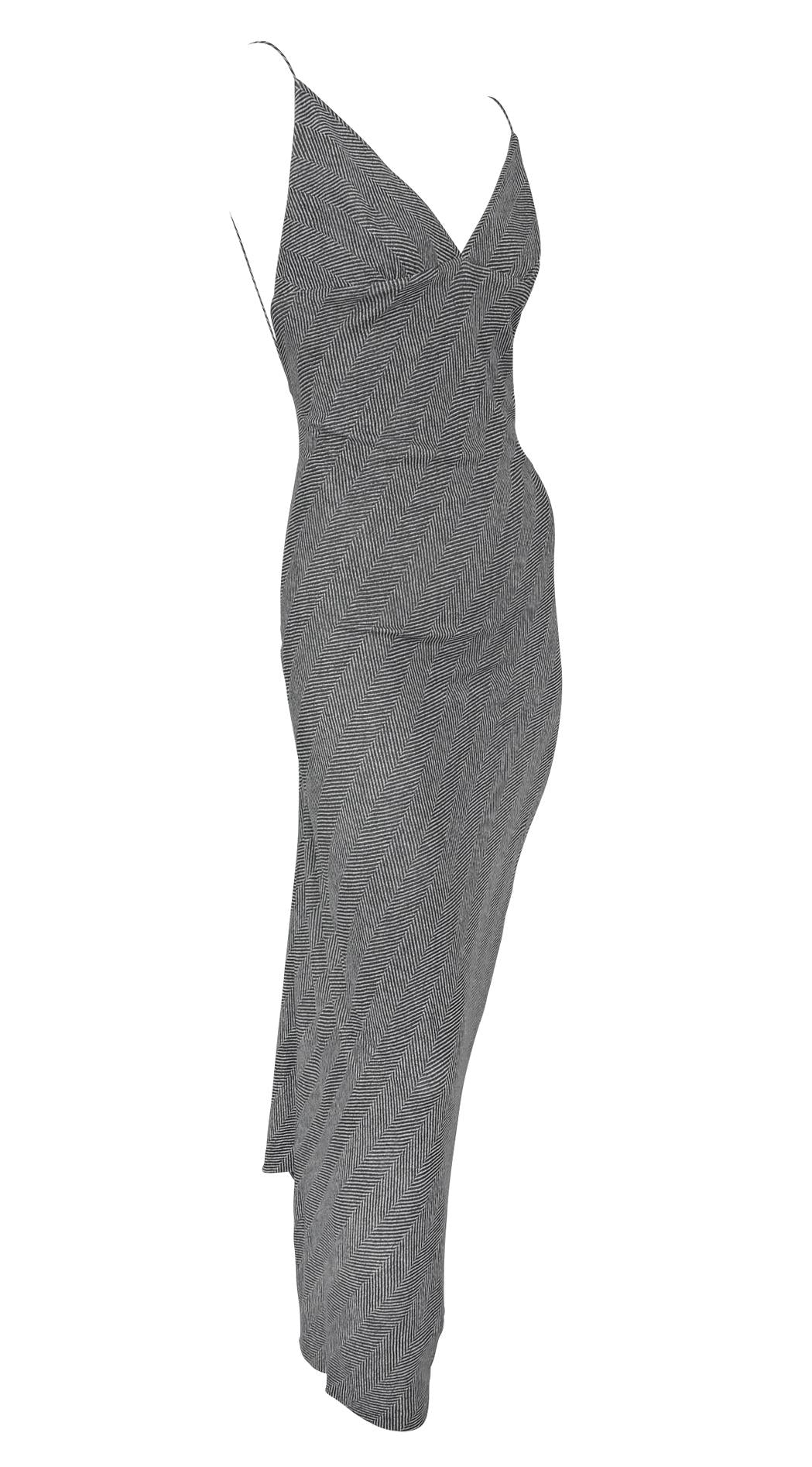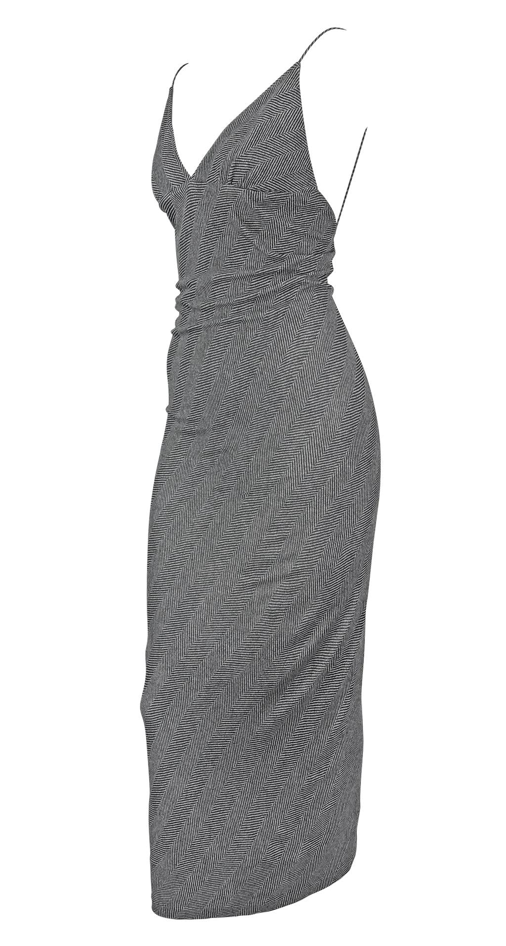 From Yigal Azrouël's Fall/Winter 2001 collection, this grey herringbone dress features a bodycon silhouette with a plunging neckline and dramatic open back. Finished with ultra-thin straps, subtle ruching between the hips, and an asymmetrical draped slit, this runway piece blends a classic suiting-style herringbone pattern with sultry minimalism.