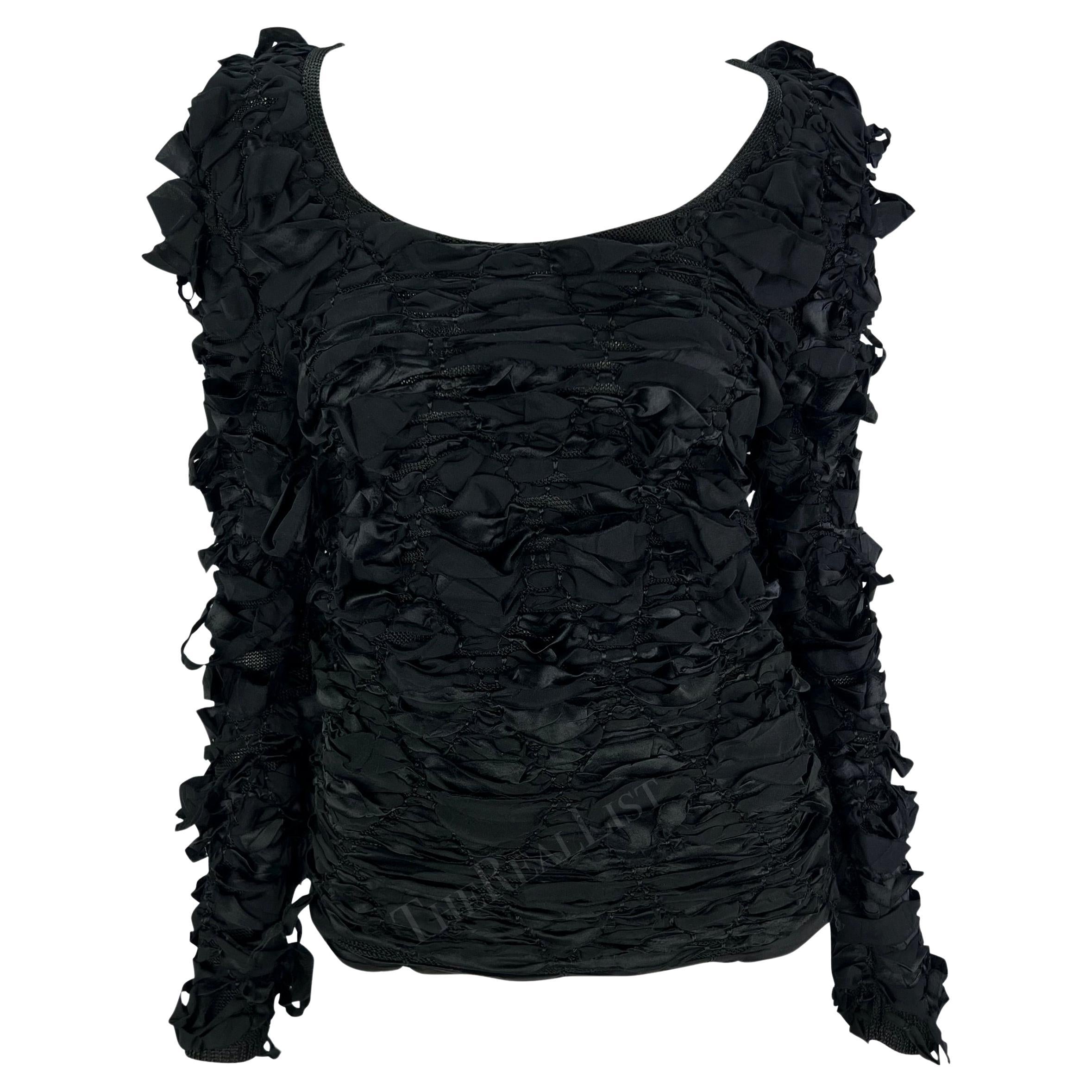 Presenting a fabulous black ribbon Yves Saint Laurent Rive Gauche sweater top, designed by Tom Ford. From the Fall/Winter 2001 collection, this top debuted as part of look 9, modeled by Jacquetta Wheeler. Constructed of a knit base, this chic sweater features ribbons woven throughout the top. Check out our storefront for other chic YSL by Tom Ford pieces!