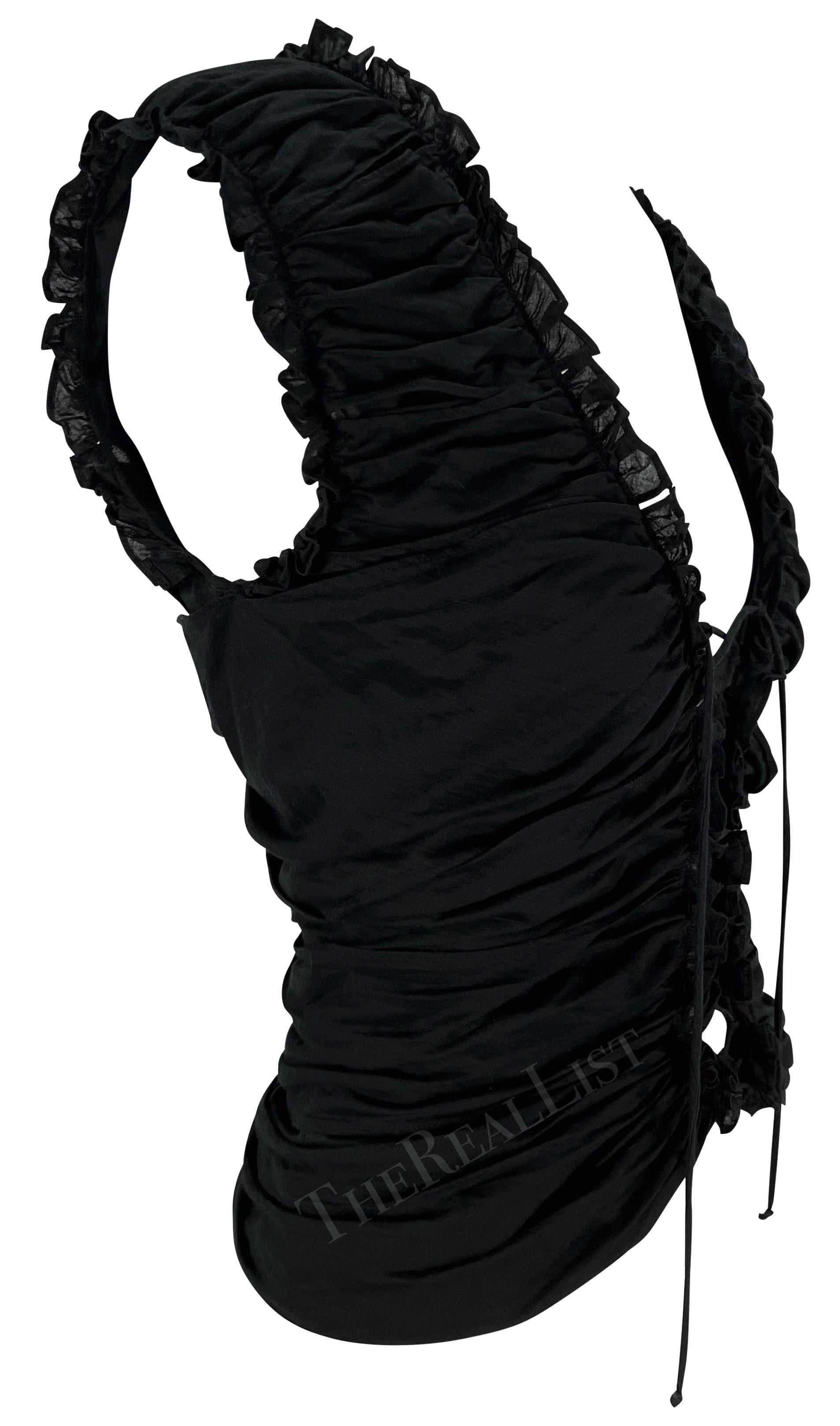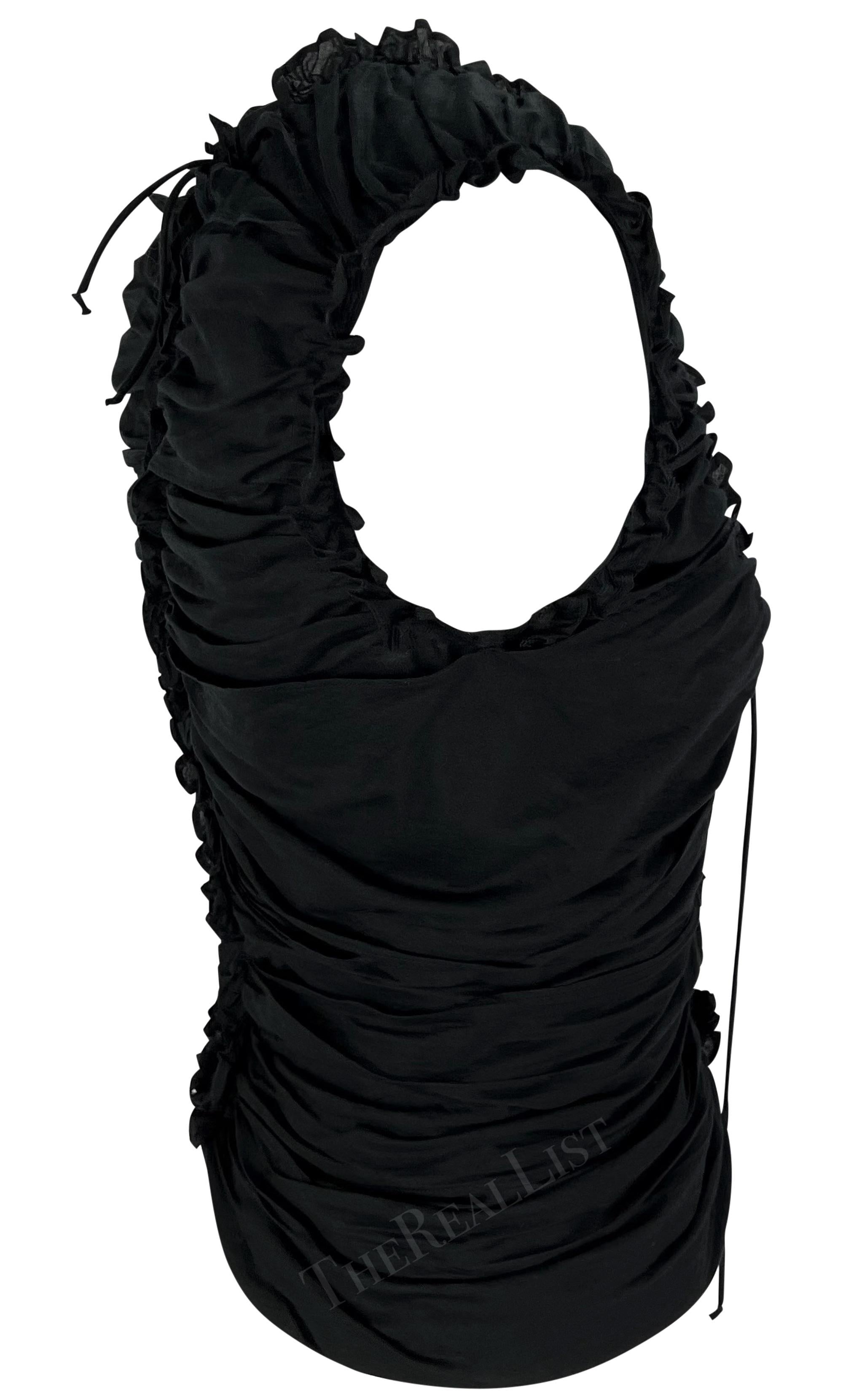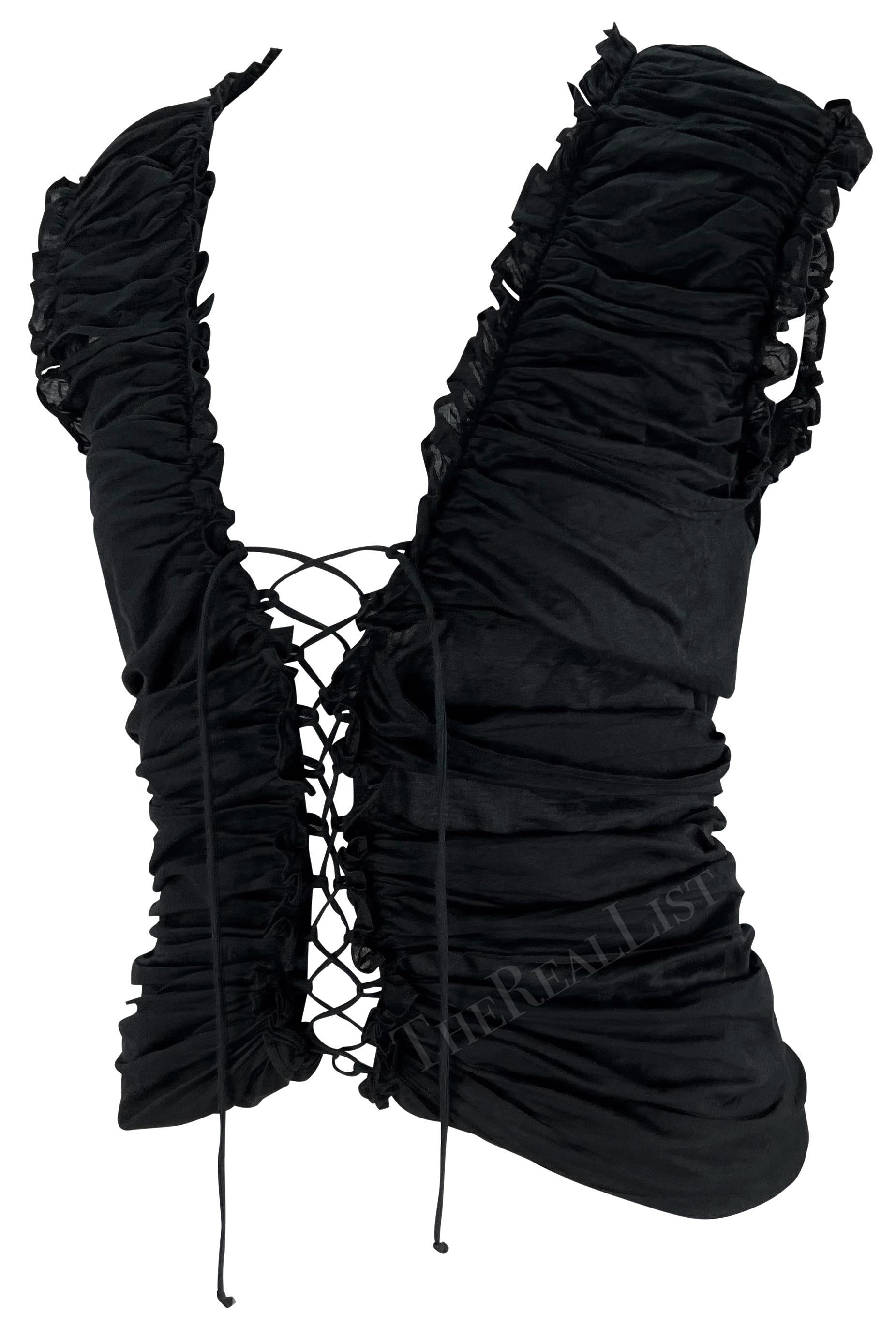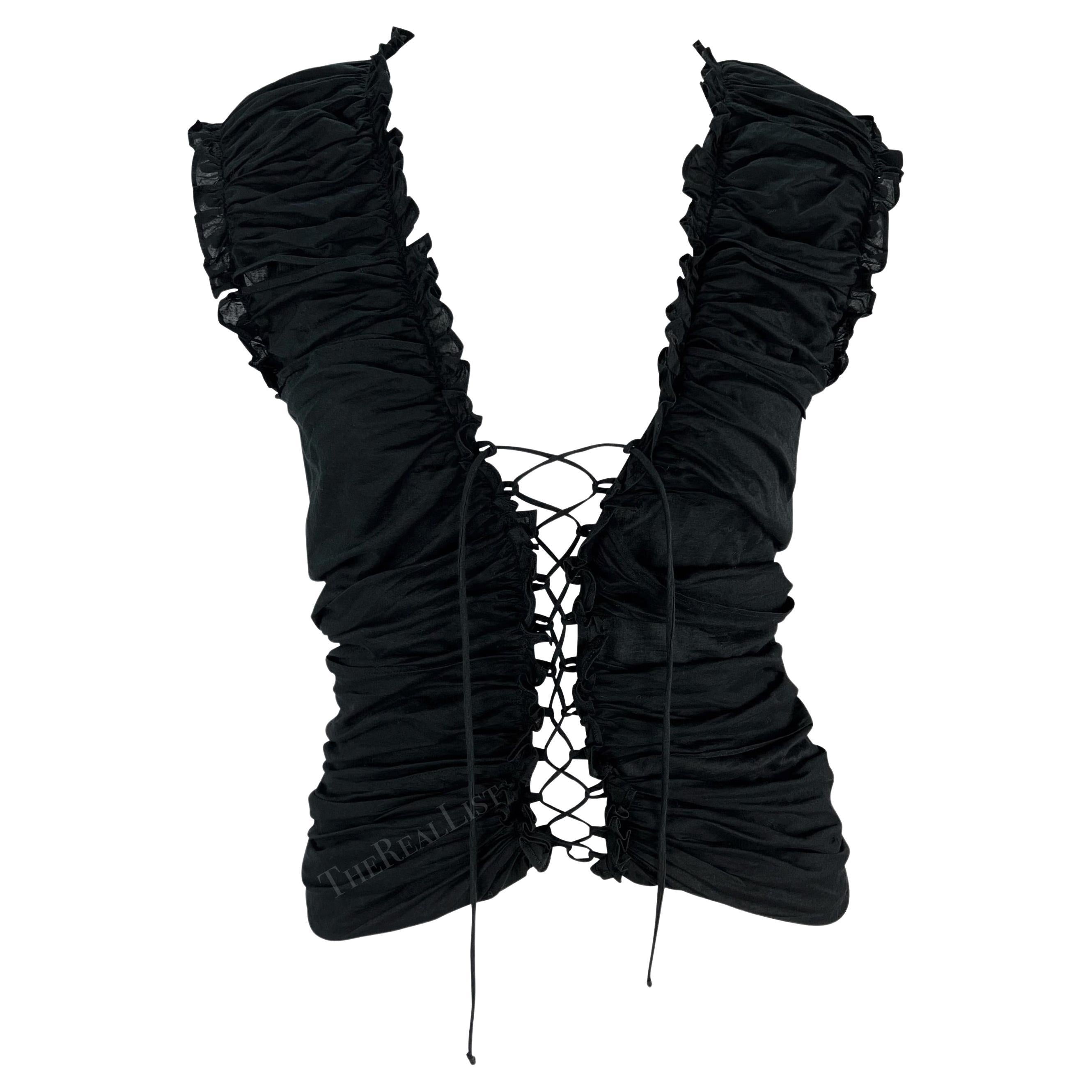 Presenting a fabulous black Yves Saint Laurent ruched top, designed by Tom Ford. From the Fall/Winter 2001 collection, the long-sleeved version of this top debuted on the season's runway as part of look 4, modeled by Liisa Winkler. The long-sleeved purple version of the top was also worn on the runway and was highlighted in the season's ad campaign, captured by Steven Meisel. This ruched sleeveless top features a plunging neckline with lace-up accents down the front and back of the top. Made complete with lightly ruffled hems, this YSL by Tom Ford top is the perfect chic and sexy addition to any wardrobe!