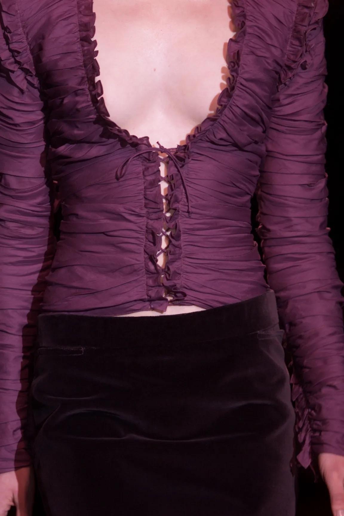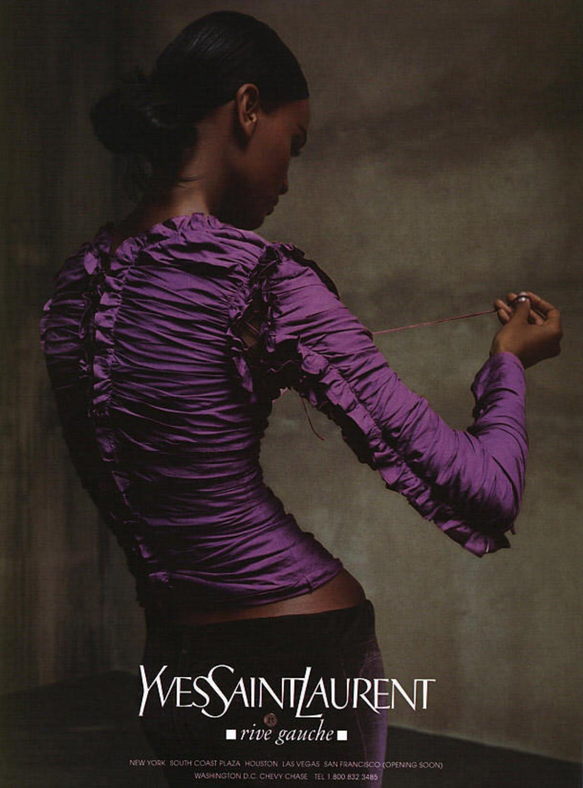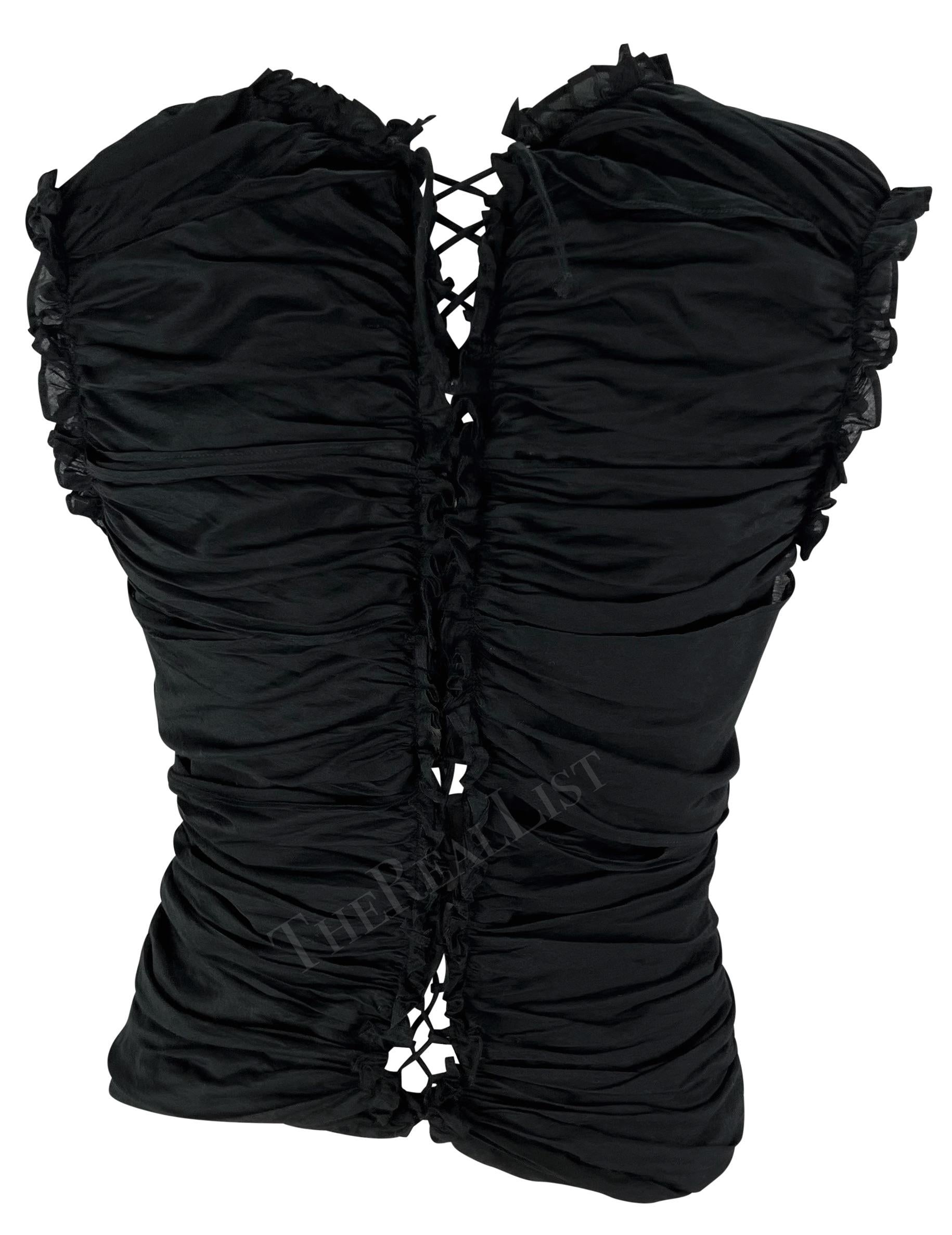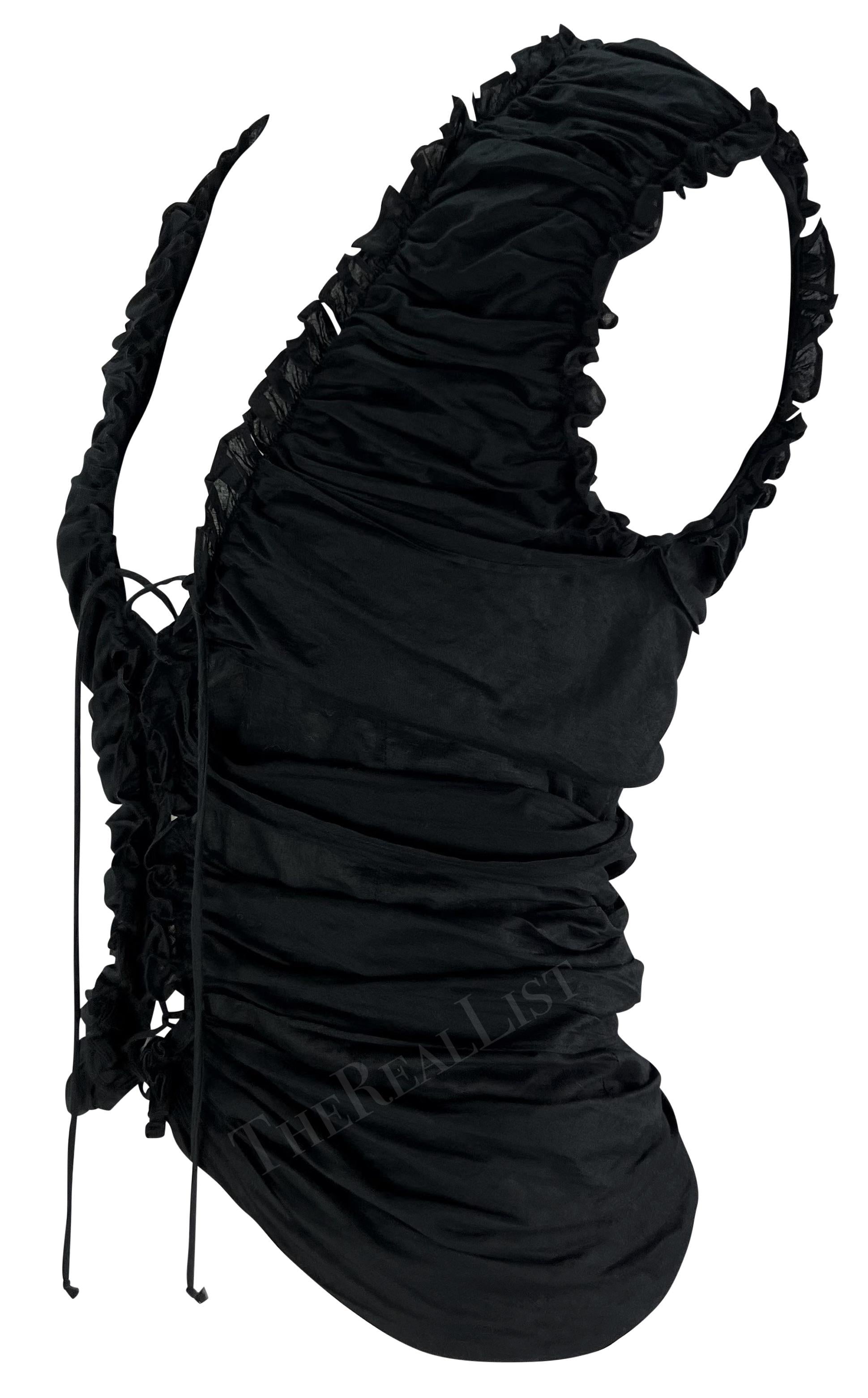 Presenting a fabulous black Yves Saint Laurent ruched top, designed by Tom Ford. From the Fall/Winter 2001 collection, the long-sleeved version of this top debuted on the season's runway as part of look 4, modeled by Liisa Winkler. The long-sleeved purple version of the top was also worn on the runway and was highlighted in the season's ad campaign, captured by Steven Meisel. This ruched sleeveless top features a plunging neckline with lace-up accents down the front and back of the top. Made complete with lightly ruffled hems, this YSL by Tom Ford top is the perfect chic and sexy addition to any wardrobe!