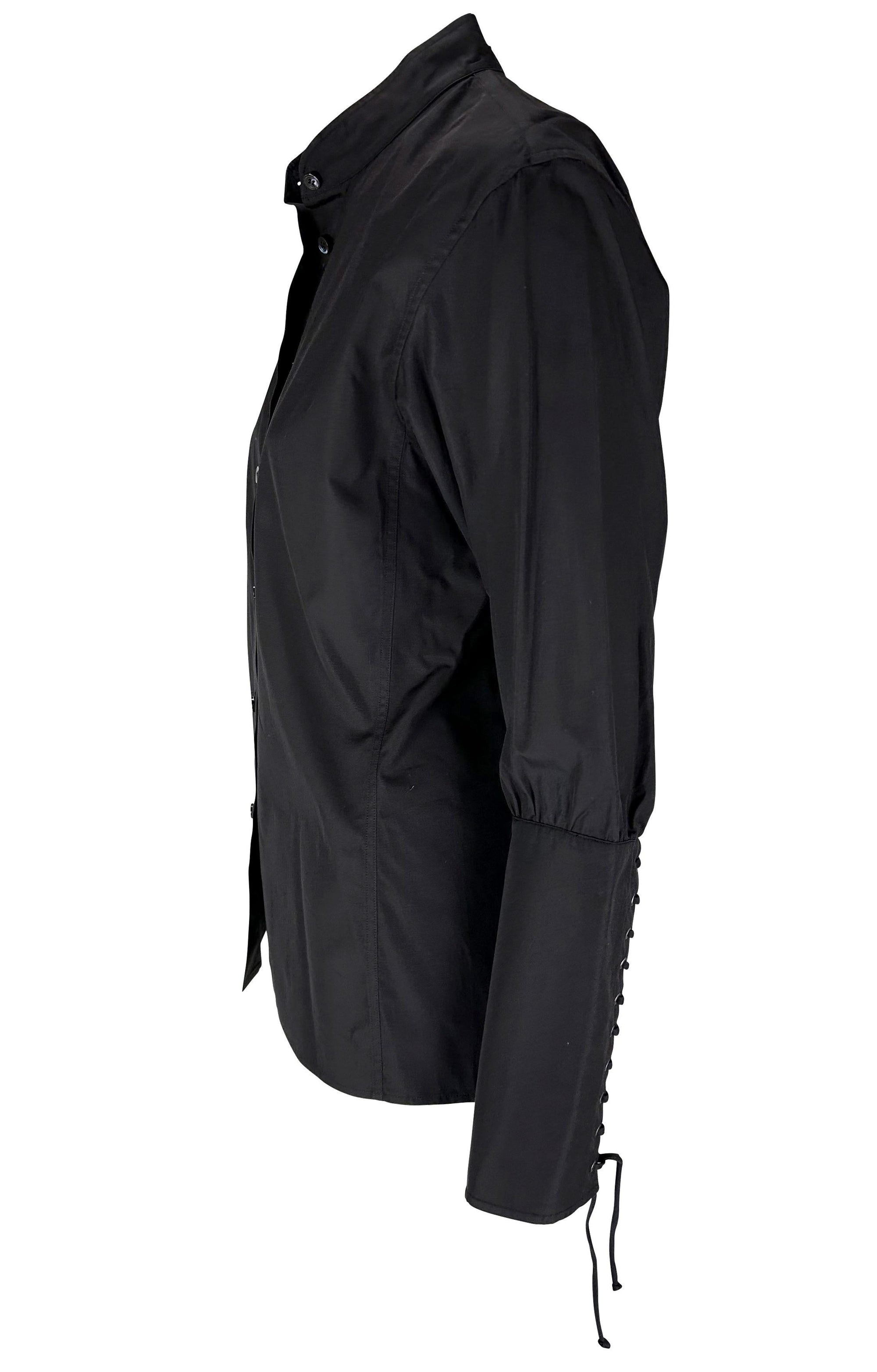 Presenting a beautiful black Yves Saint Laurent Rive Gauche top designed by Tom Ford. From the Fall/Winter 2001 collection, versions of this top debuted on the season's runway as part of looks 27, 28, 29, and 30. This fabulous button-up top features a standup collar and is complete with lace-up detail at the forearms. Add this effortlessly chic YSL by Tom Ford piece to your wardrobe!