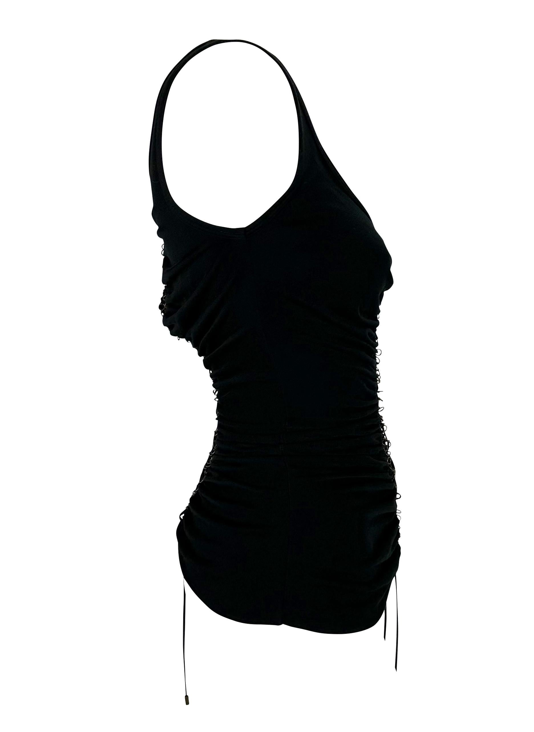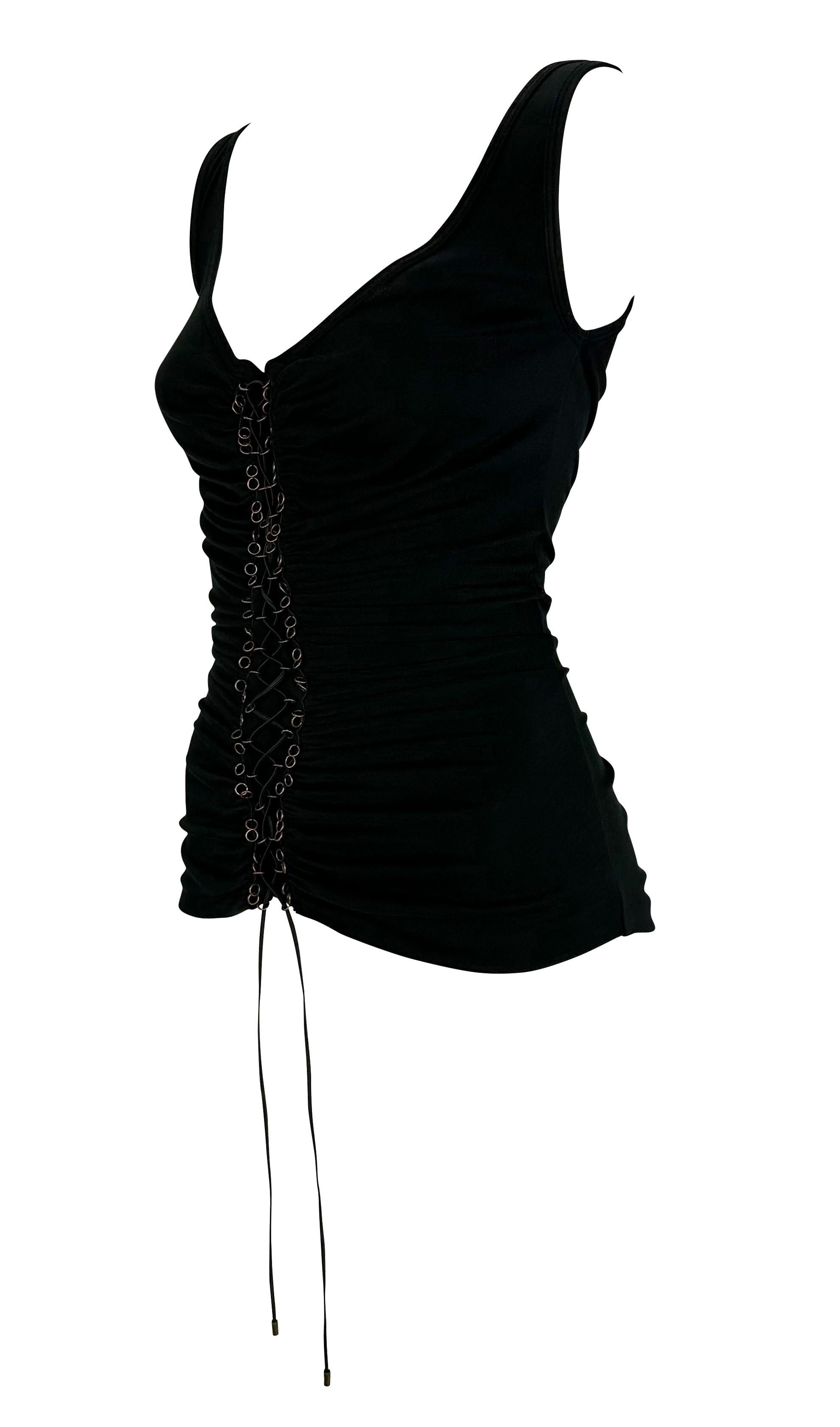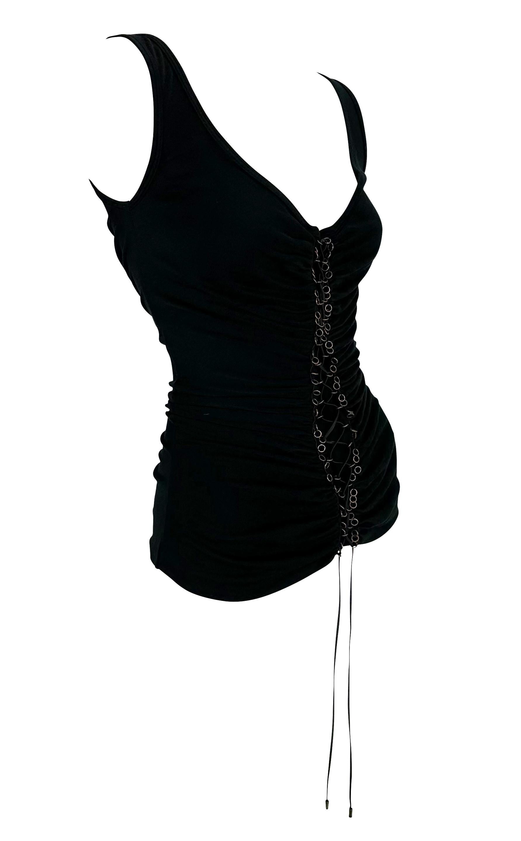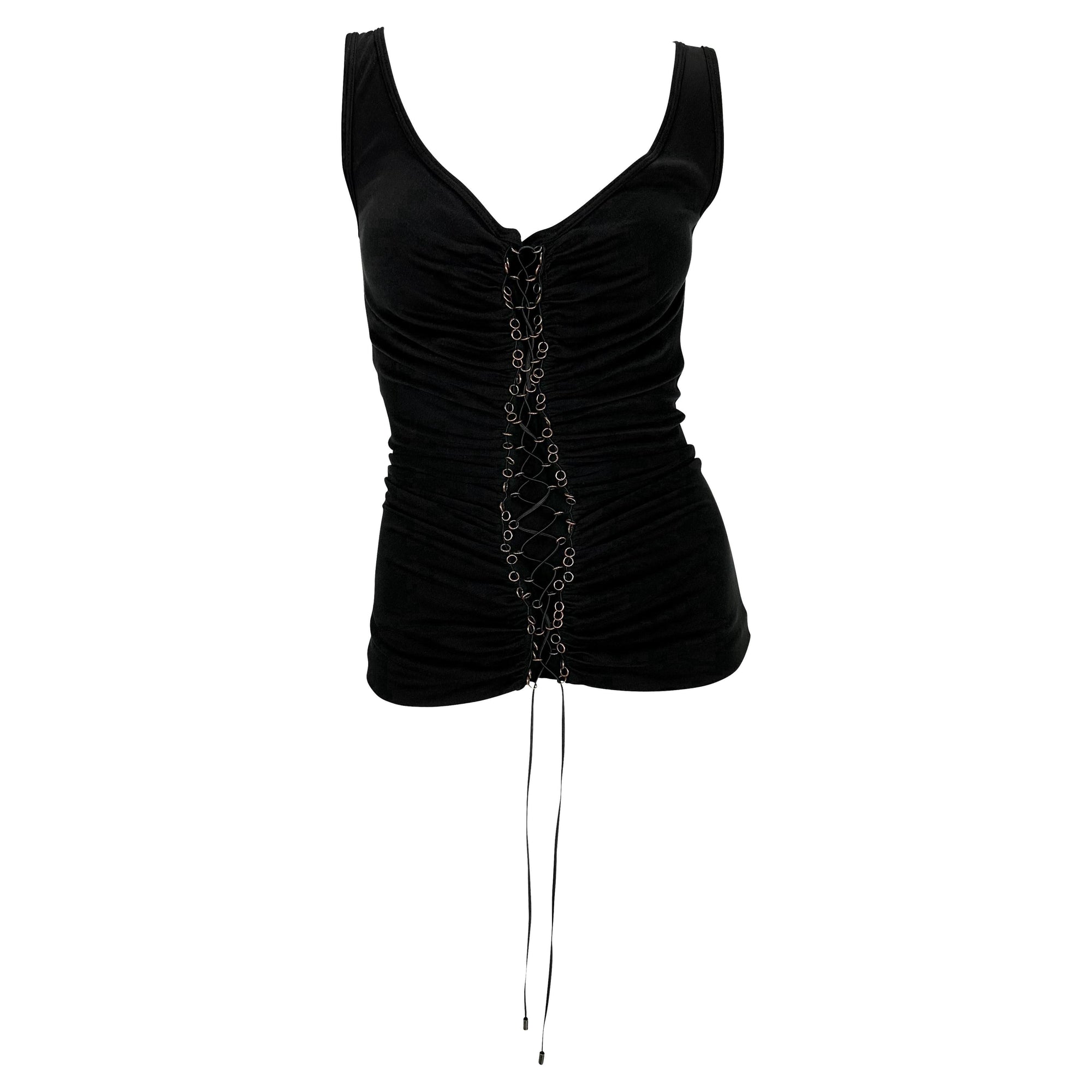 This black ruched Alexander McQueen tank top, from the Fall/Winter 2002 "Supercalifragilistic" collection, features a deep scoop neckline and ruching throughout. It is finished with copper metal ring accents at the front and back, connected by a leather lace.