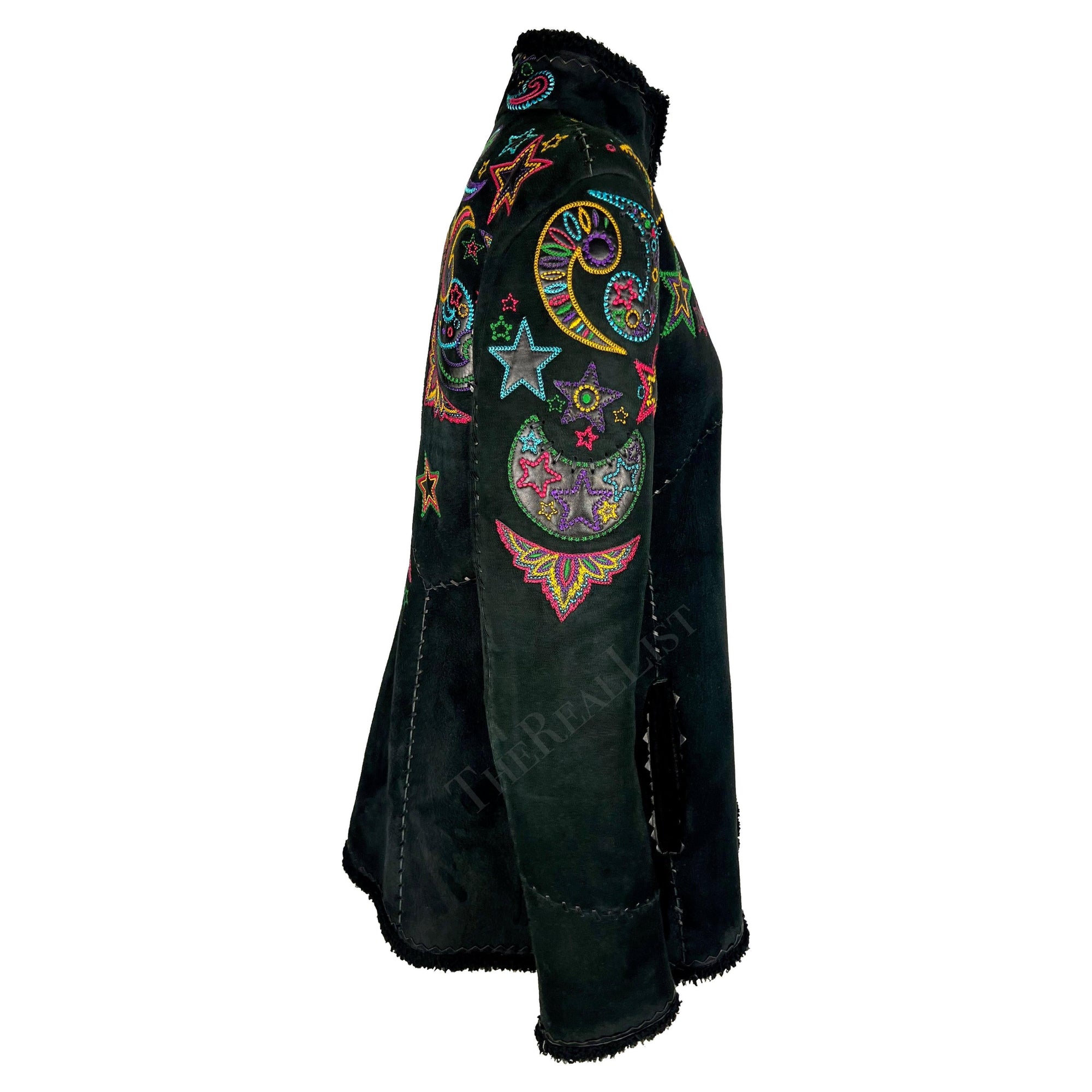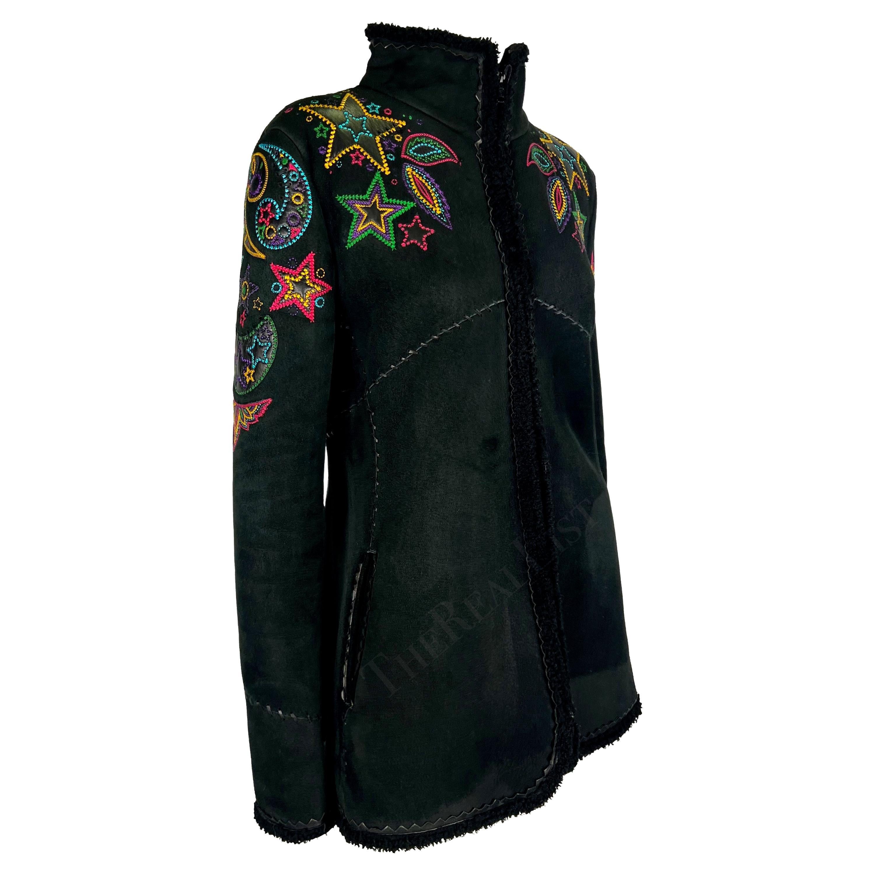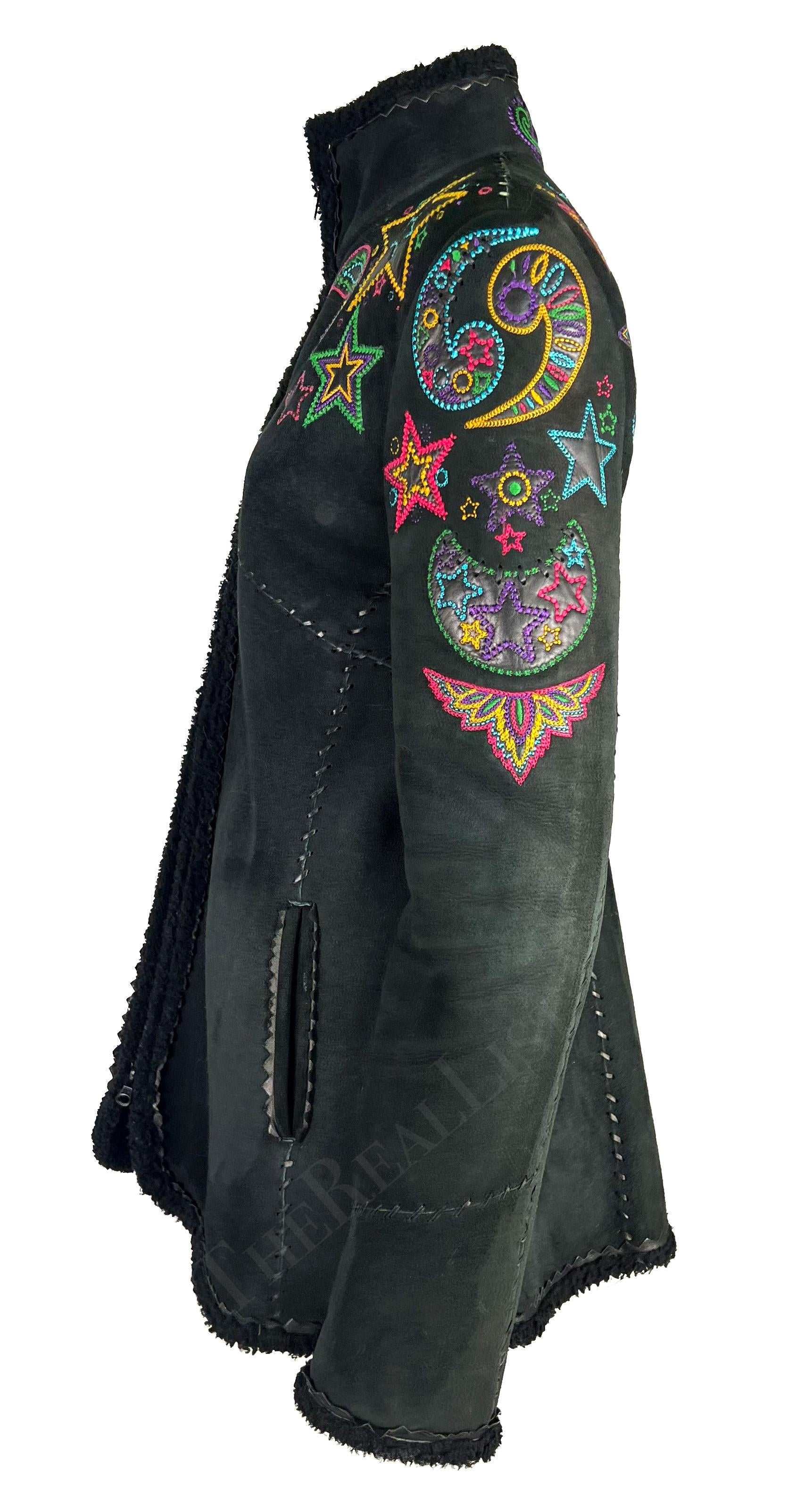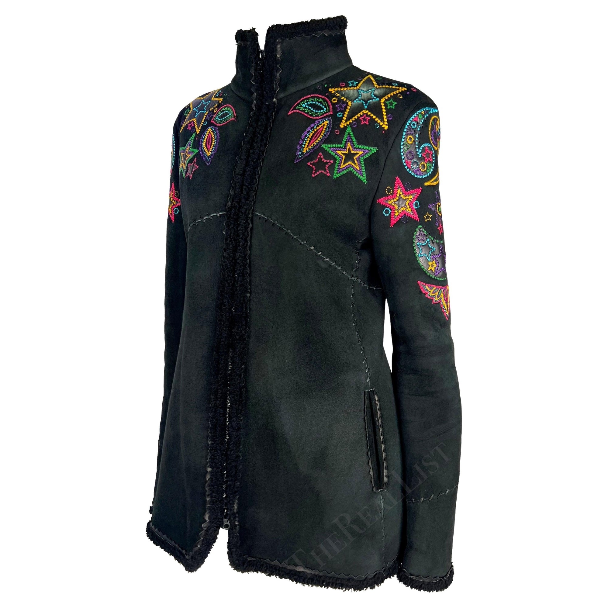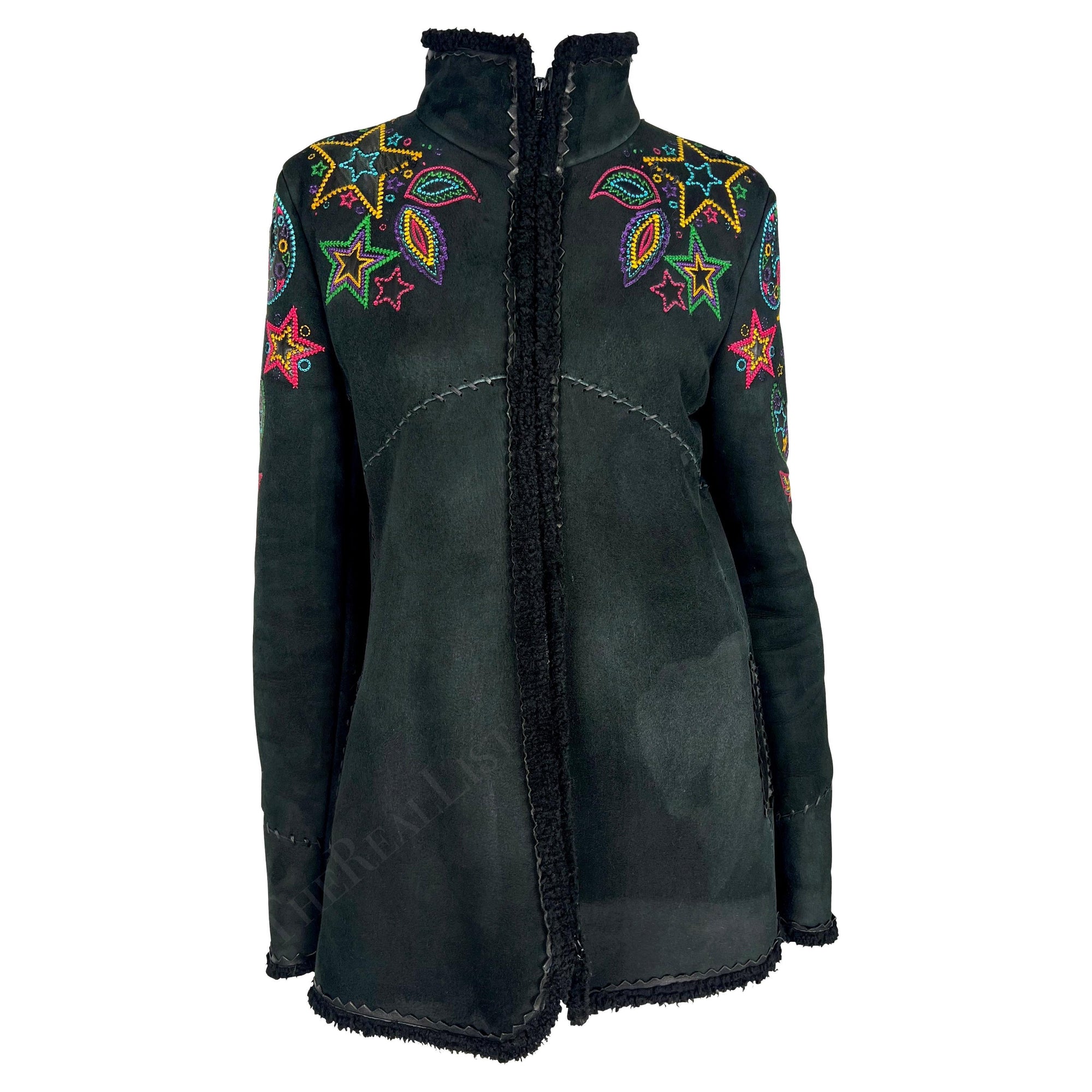 Presenting a fabulous black shearling Gianni Versace coat, designed by Donatella Versace. From the Fall/Winter 2002 collection, similar pieces featured commanding vibrant, and intricately embroidered floral motifs debuted on the season's runway. Impeccably crafted, this shearling fur delicately folds over at the cuffs, teasingly revealing shearling fur at the hem, neckline, and closure, lending an alluring touch to its silhouette. The jacket is adorned with woven leather details, multicolored psychedelic embroidery, and leather patches. Embrace the boldness of the Y2K era with this radiant creation by Donatella Versace.