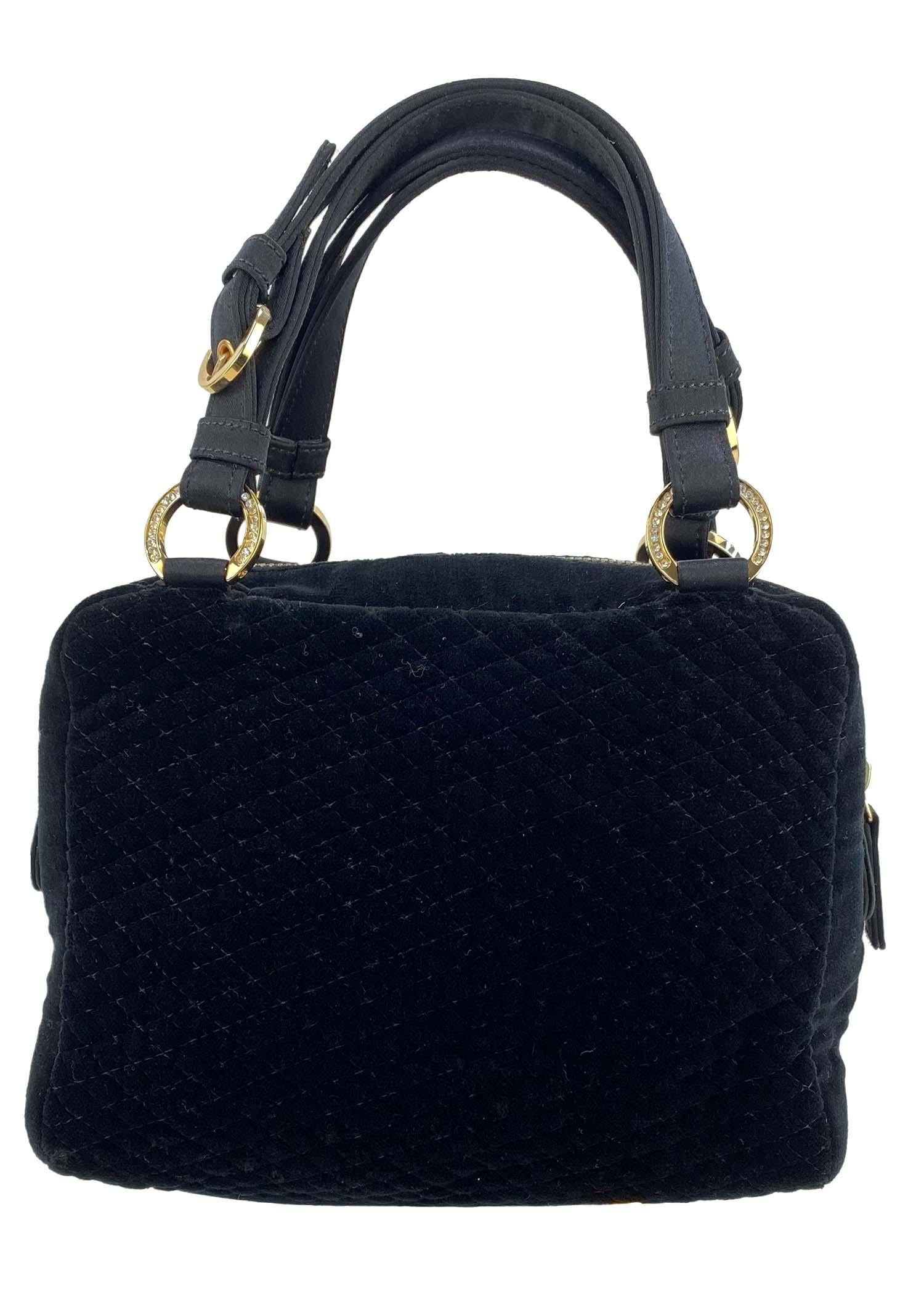 Presenting a quilted velvet rhinestoned and embroidered mini bag designed by Donatella for Gianni Versace. The handles are made of black silk satin that beautifully complements the gold-toned hardware, also covered in rhinestones. Part of the Fall/Winter 2002 collection, this piece features the season's signature colorful psychedelic detailing.