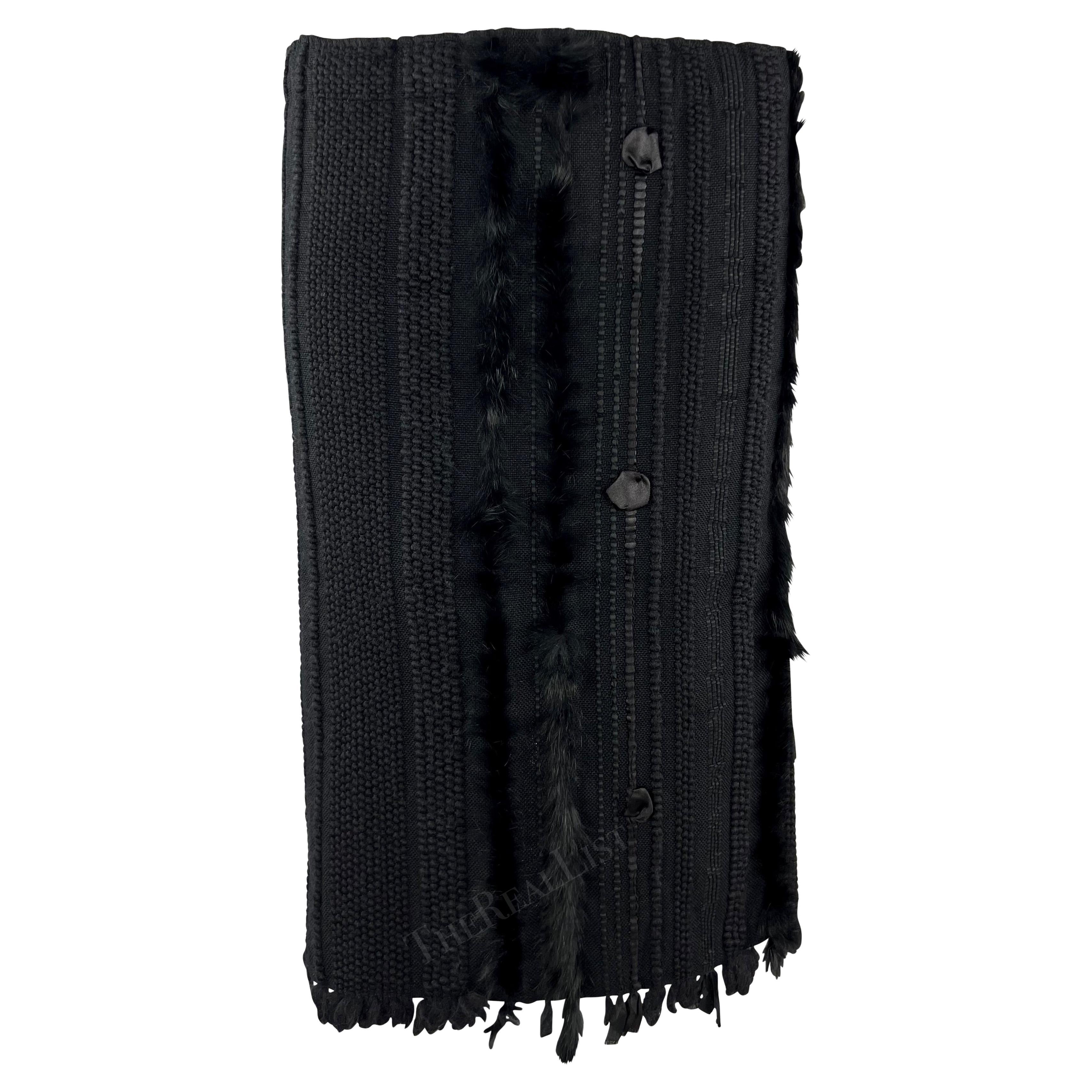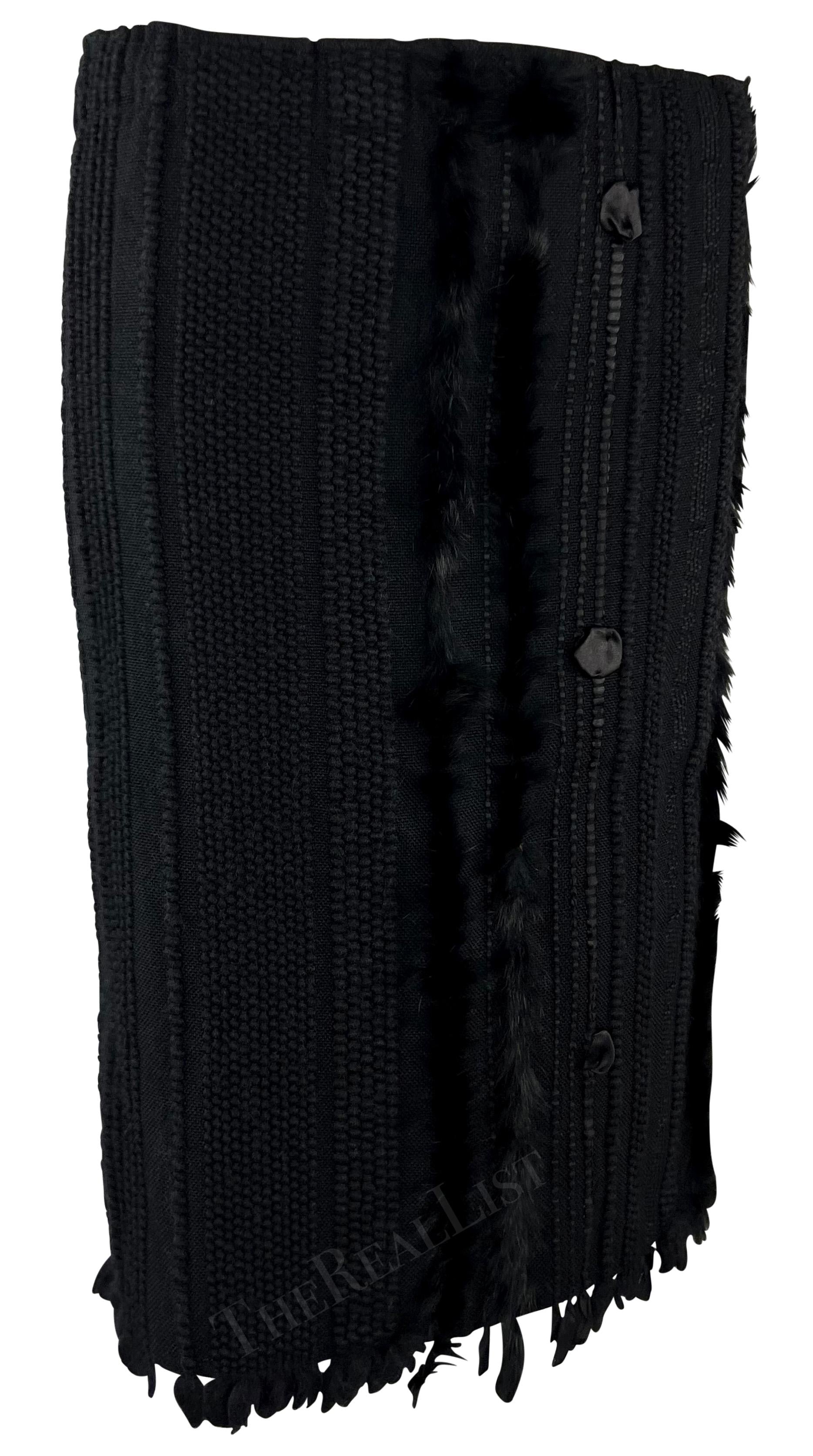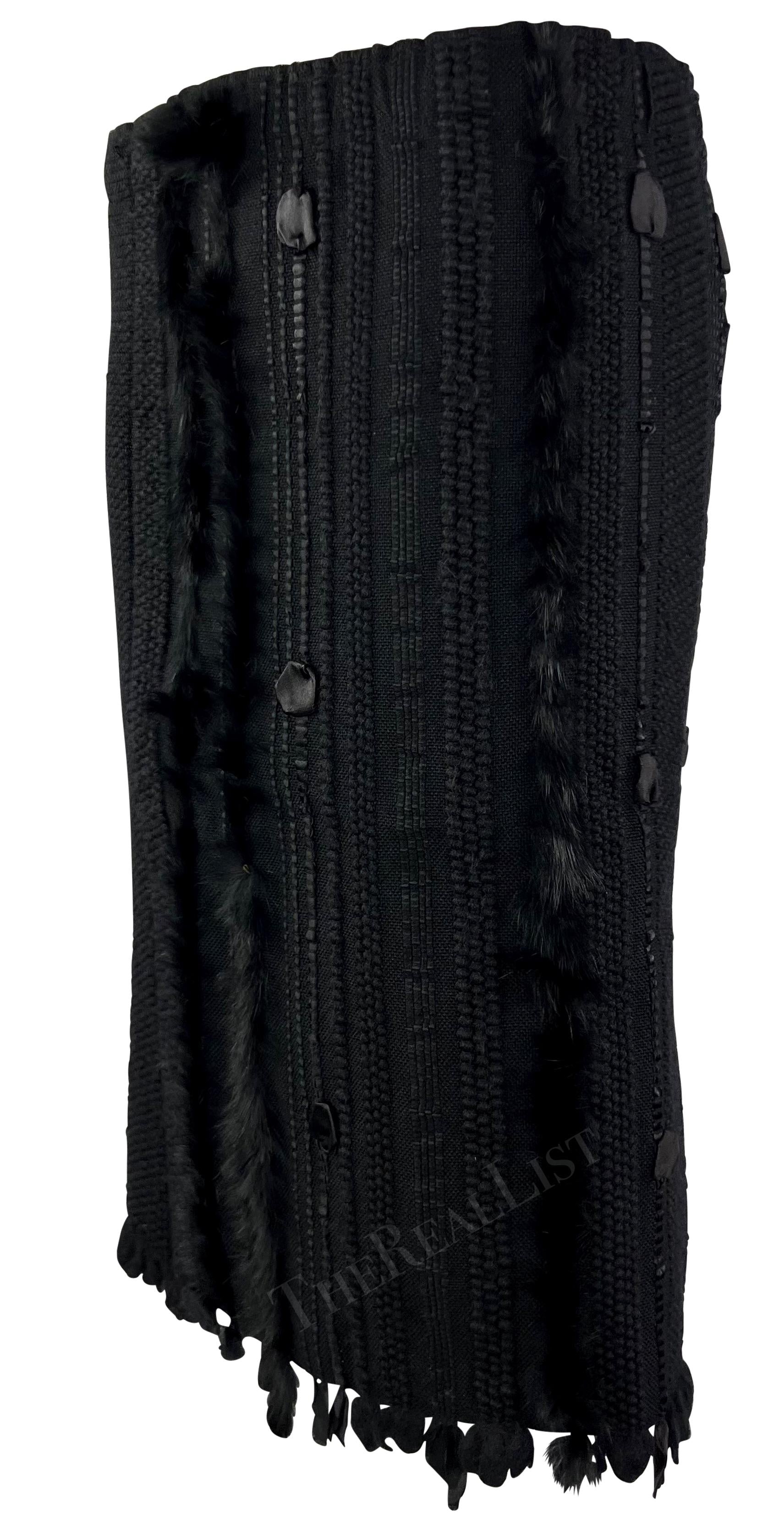 Presenting a beautiful black knit skirt by Gucci, designed by Tom Ford from the Fall/Winter 2002 collection. This skirt was featured on the season's runway as part of look 22, worn by model Liisa Winkler.. This knee-length skirt features varying vertical knit patterns and is highlighted with fur and satin ribbon accents. The skirt is made complete with a light fringe at the bottom and a small slit at the back.