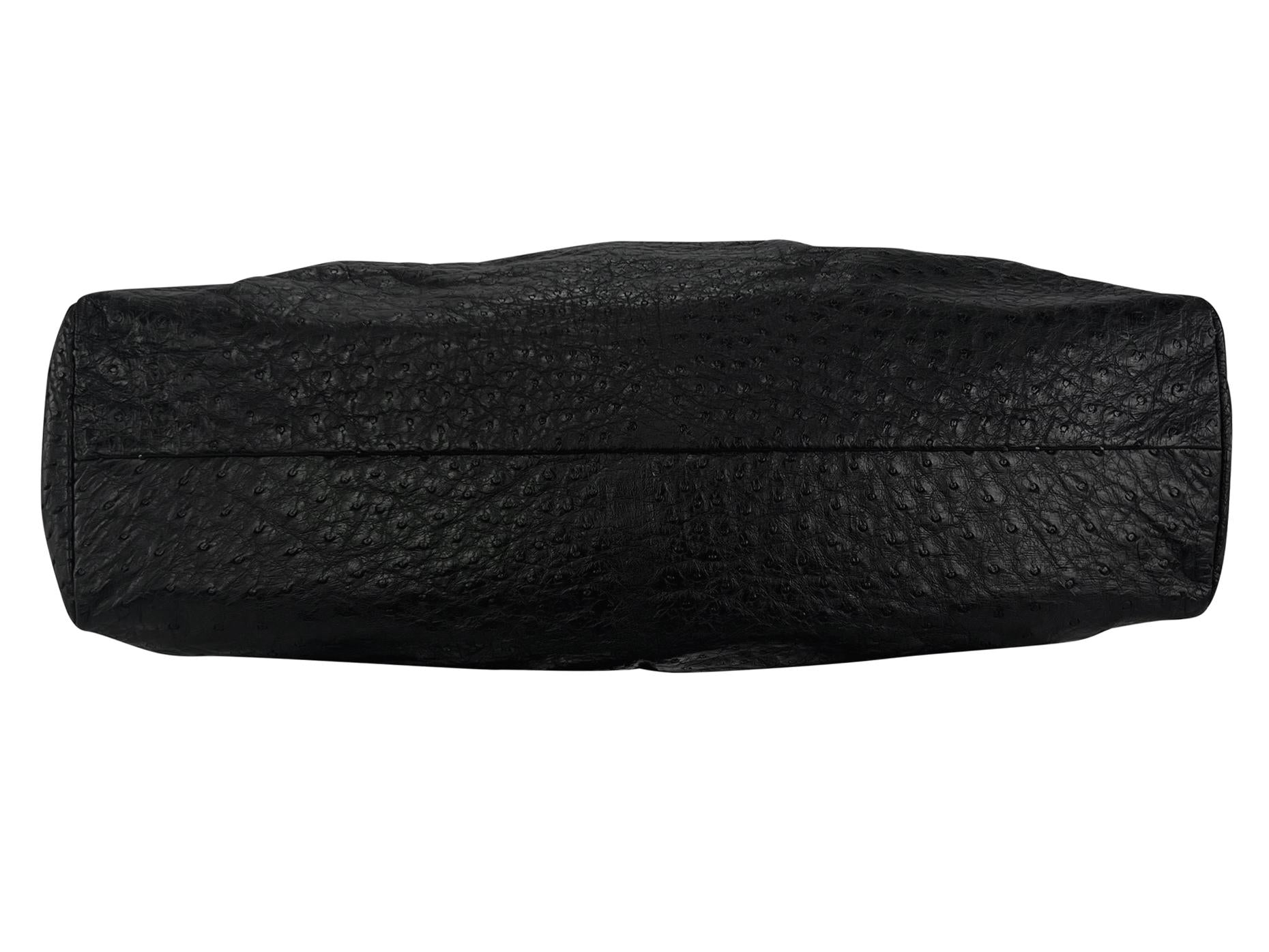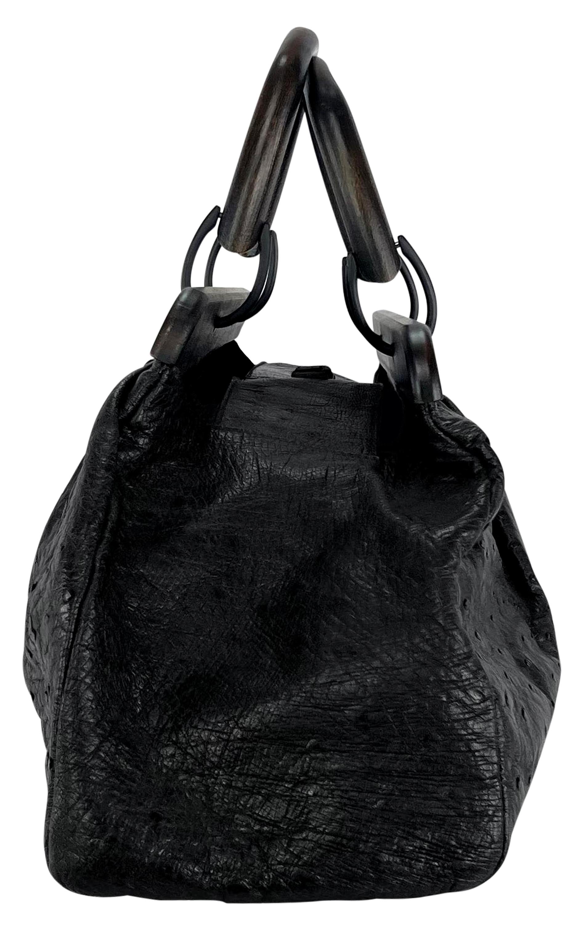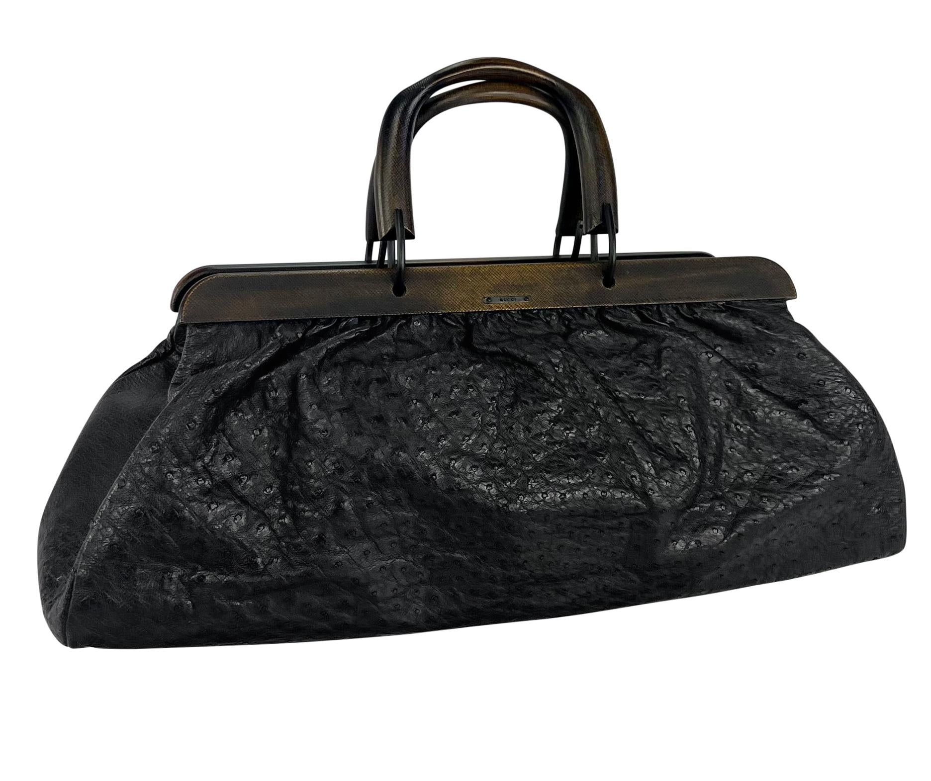 Tom Ford designed this black ostrich leather Gucci bag for his Fall/Winter 2002 collection. With the smaller versionas of the same style shown in multiple runway looks, this wood-accented tote bag is a fabulous and unique addition to any bag collection. This extra-large, pillowy tote is primarily constructed of black ostrich and is complete with textured wood handles and trim.