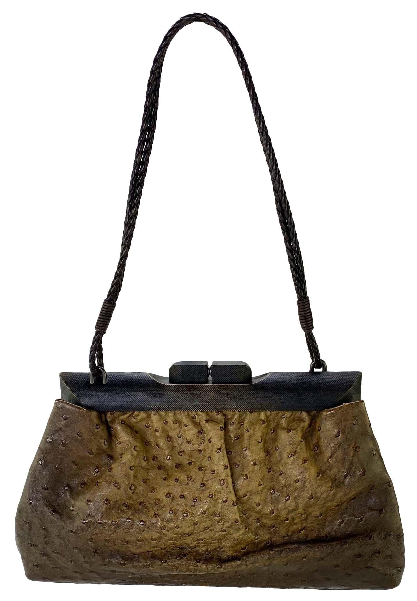 Presenting a wood frame genuine ostrich leather bag by Tom Ford for Gucci. This piece was designed for the Fall/Winter 2002 collection and features the same braided leather and distressed wood accents that were prominently featured on the runway. The magnetic kiss-lock closure is constructed of woodblock and opens to GG woven cloth lining with matching ostrich trim at the interior zip pocket.