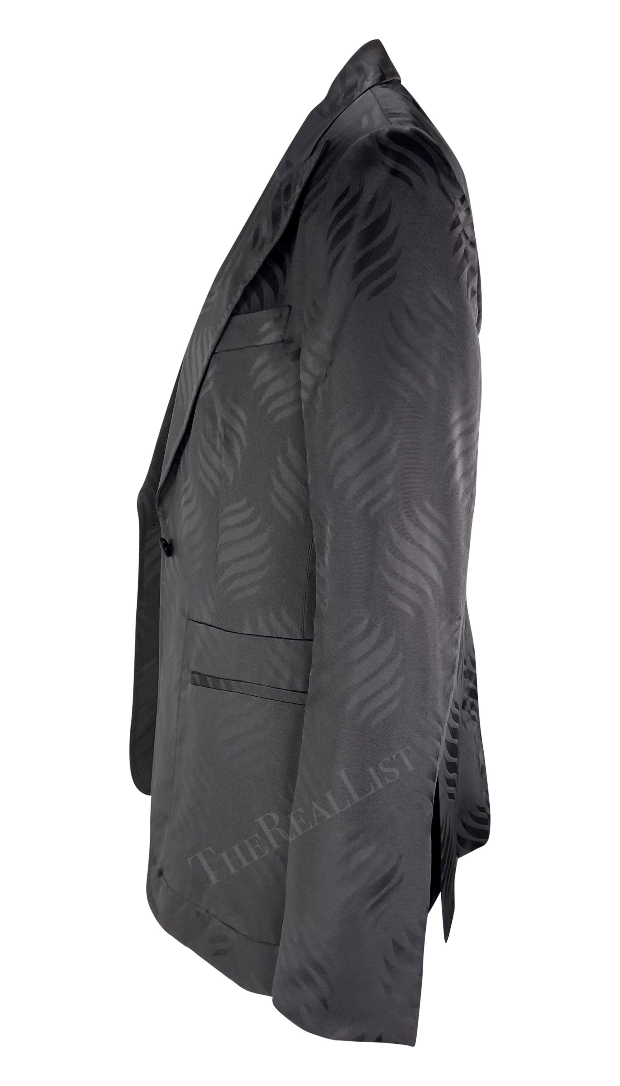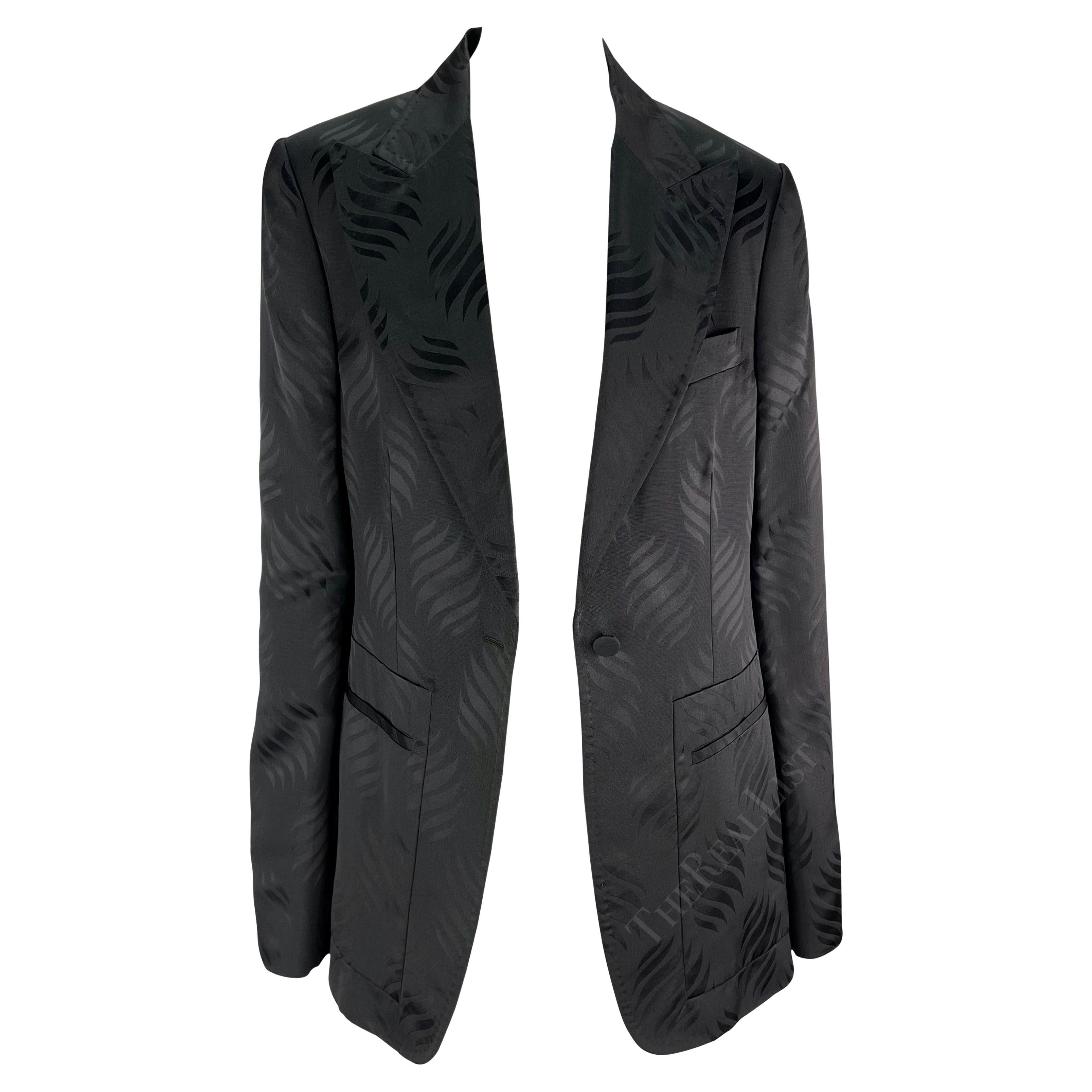 Presenting a fabulous deep purple silk Gucci blazer, designed by Tom Ford. From the Fall/Winter 2002 collection, this blazer debuted as part of look 18, modeled by Valery Prince. Constructed of lightly shiny silk with a leaf-like print, this open blazer features a fold-over collar, lapel, non-functioning single-button closure, and pockets on either side. The matching obi belt and other treasures from this dark punk-influenced collection collection are available.