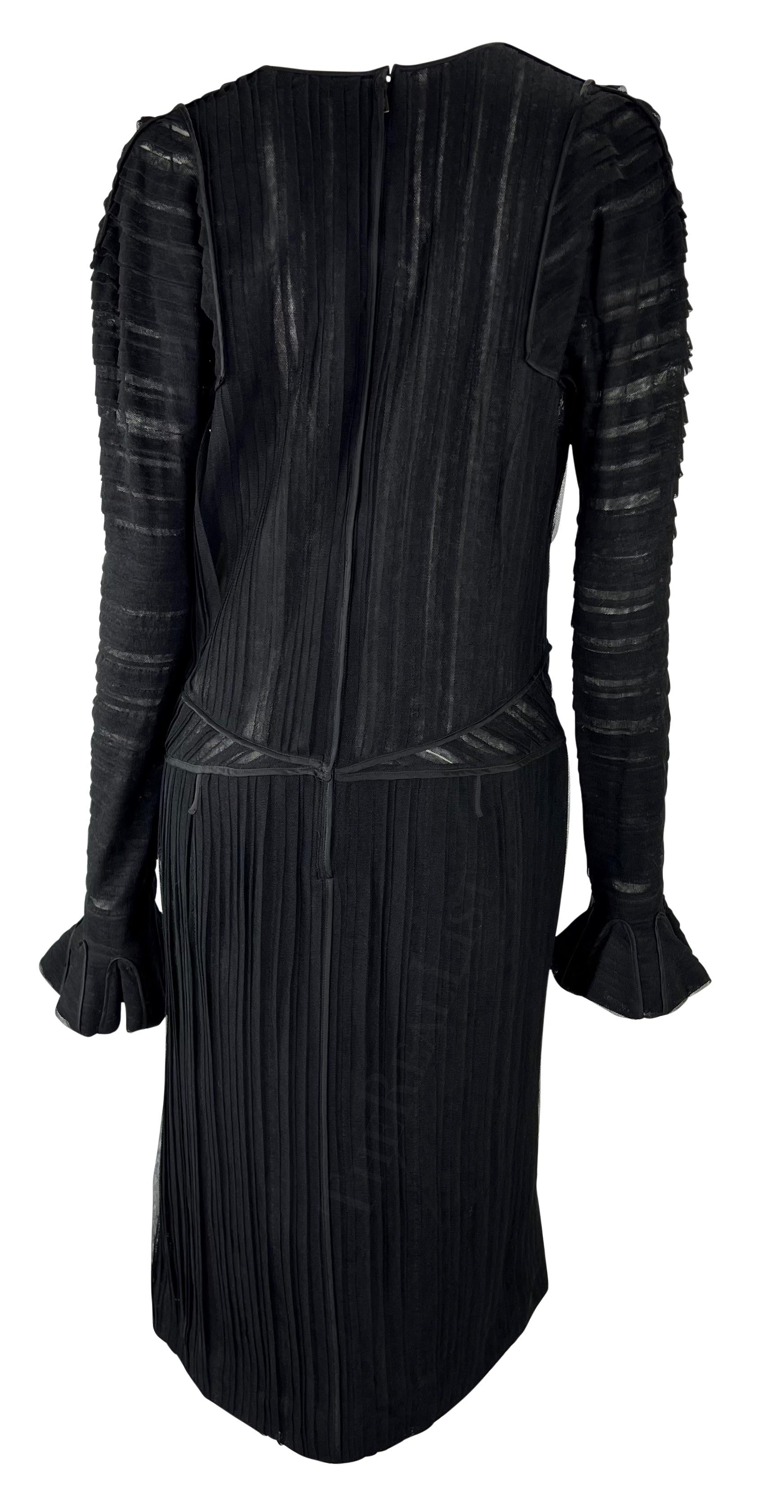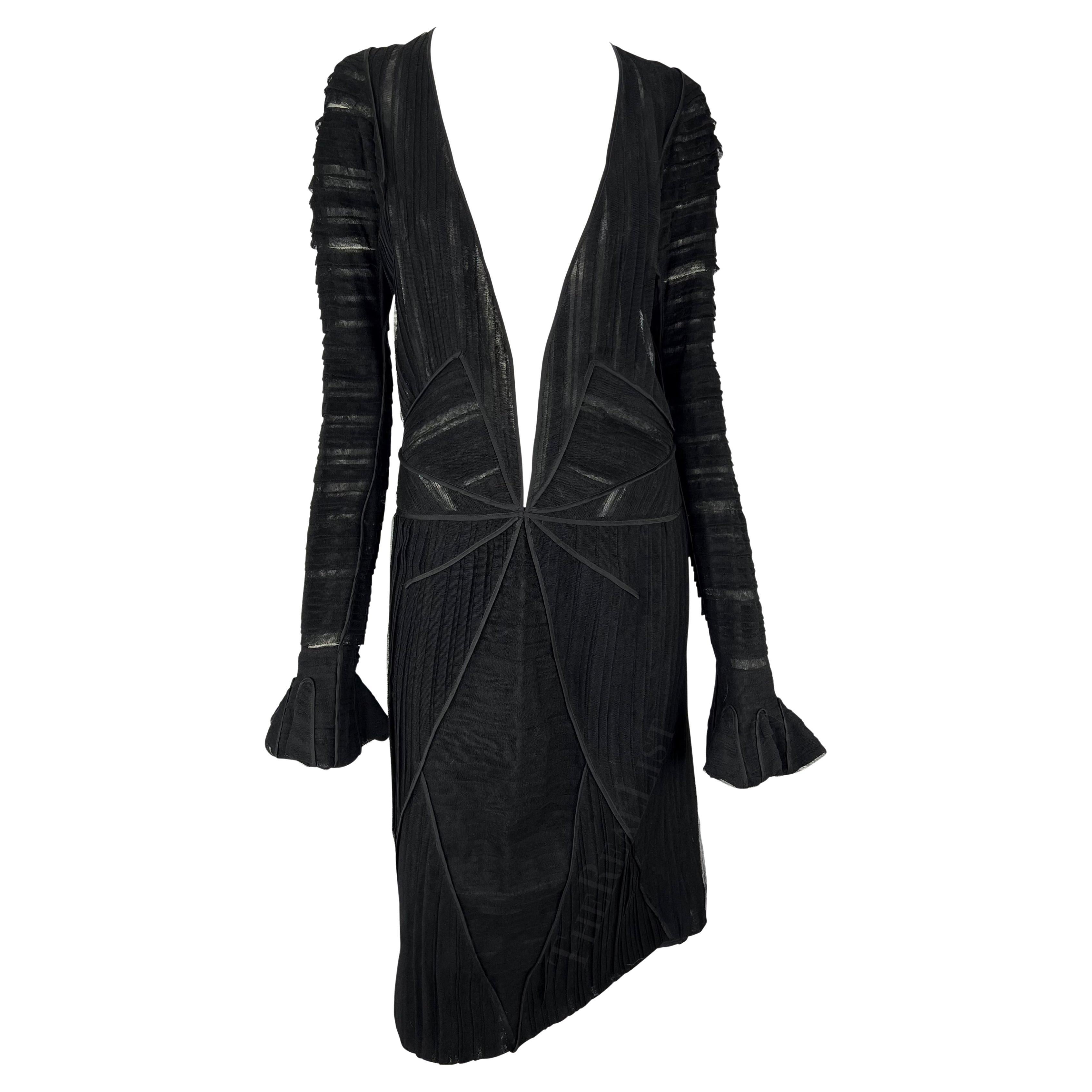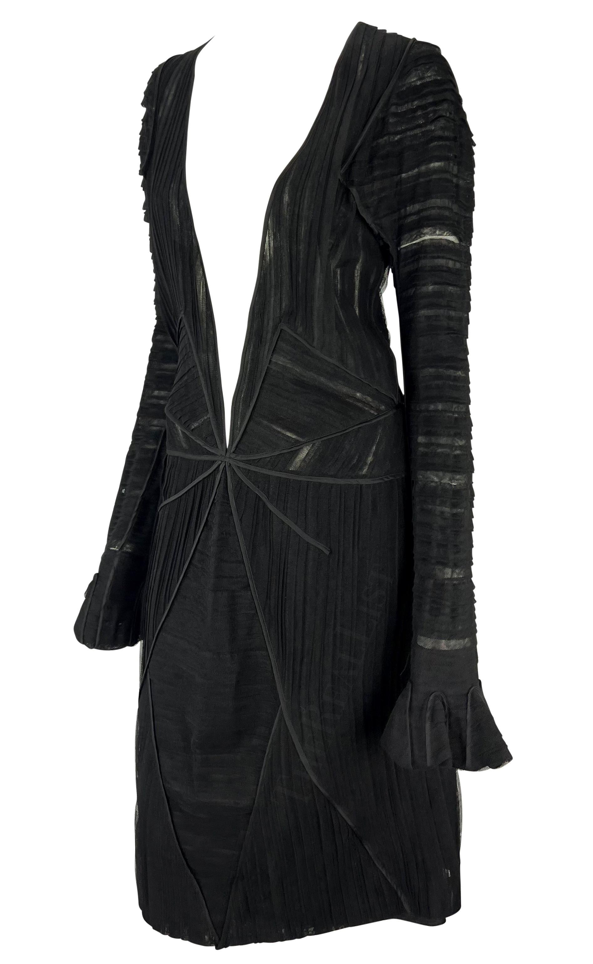Presenting a fabulous black pleated Yves Saint Laurent Rive Gauche dress, designed by Tom Ford. From the Fall/Winter 2002 collection, this dress is constructed of semi-sheer layered fabric, this ultra-sexy dress features a plunging neckline and bell cuffs. A variation of the dress debuted as look number 8 on the season's runway, modeled by Caroline Ribeiro. Add this sensual YSL by Tom Ford dress to your wardrobe or collection!
