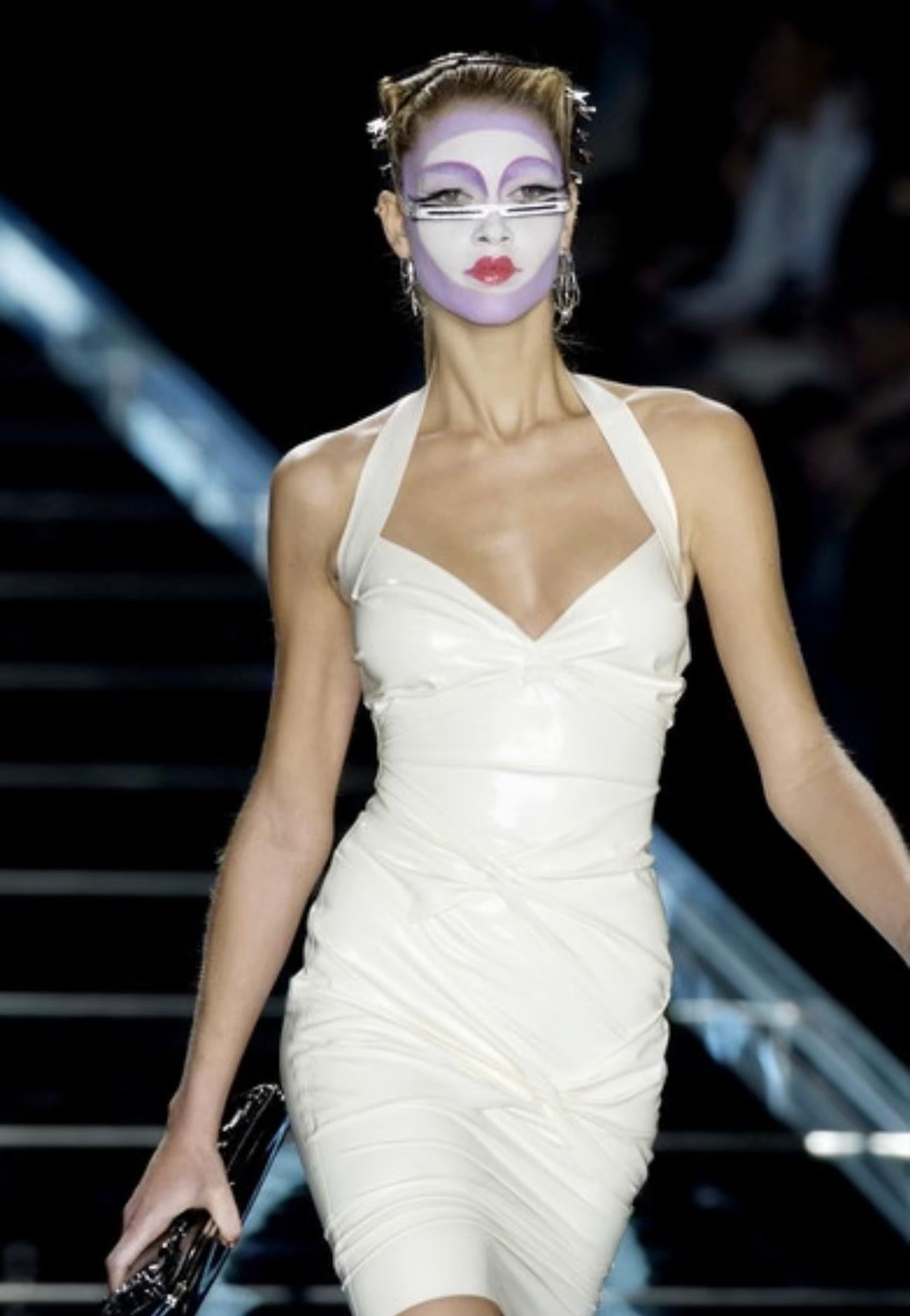 This Christian Dior halterneck dress from the Fall/Winter 2003 collection by John Galliano is features a stretch bodycon fit with ruching throughout. The form-fitting silhouette features a low-cut neckline, a front slit, and a ruched construction that accentuates the body. A version of this design appeared in white as look 14 on the Fall 2003 runway, modeled by Ana Beatriz Barros, while the red iteration was featured in the season’s ad campaign with Angela Lindvall.