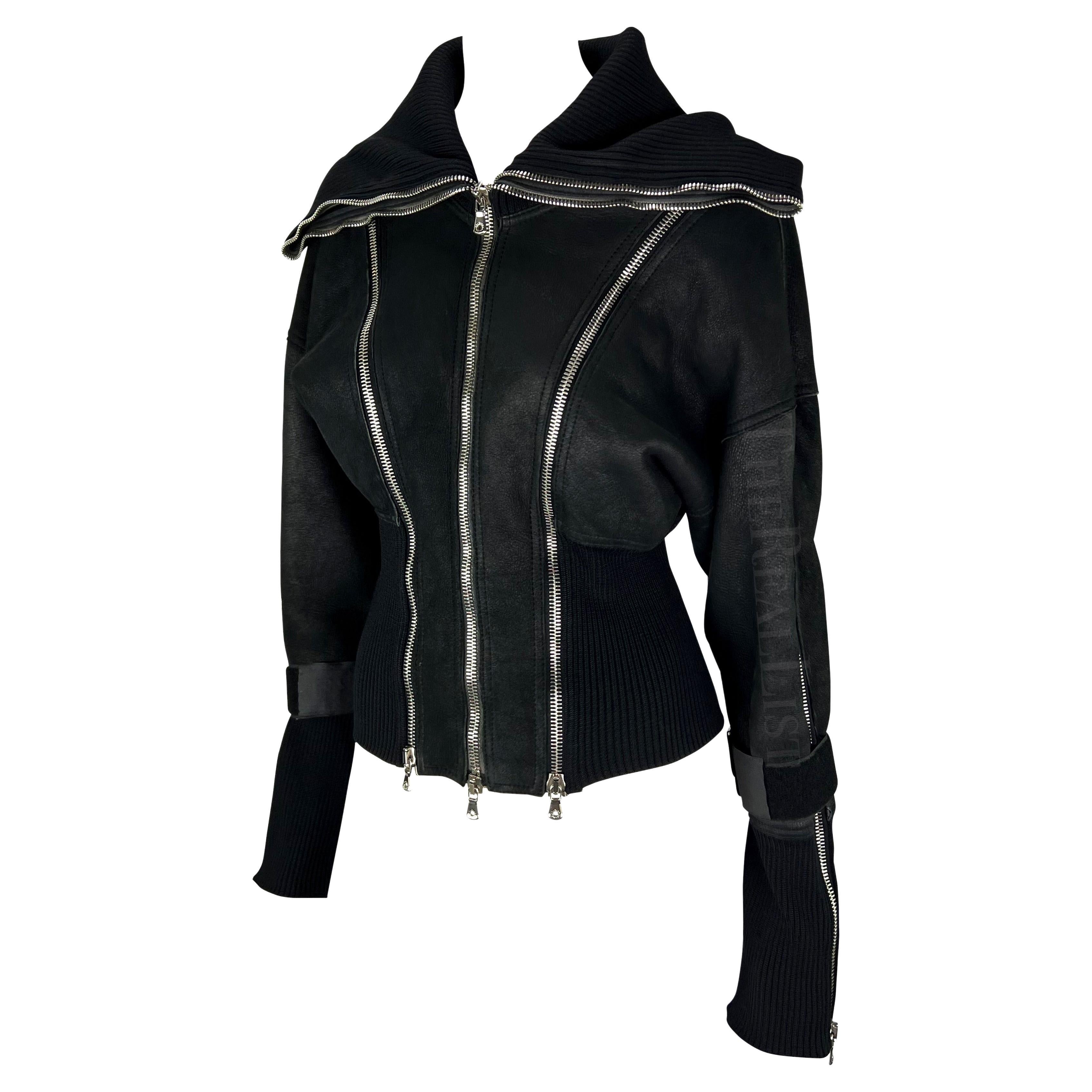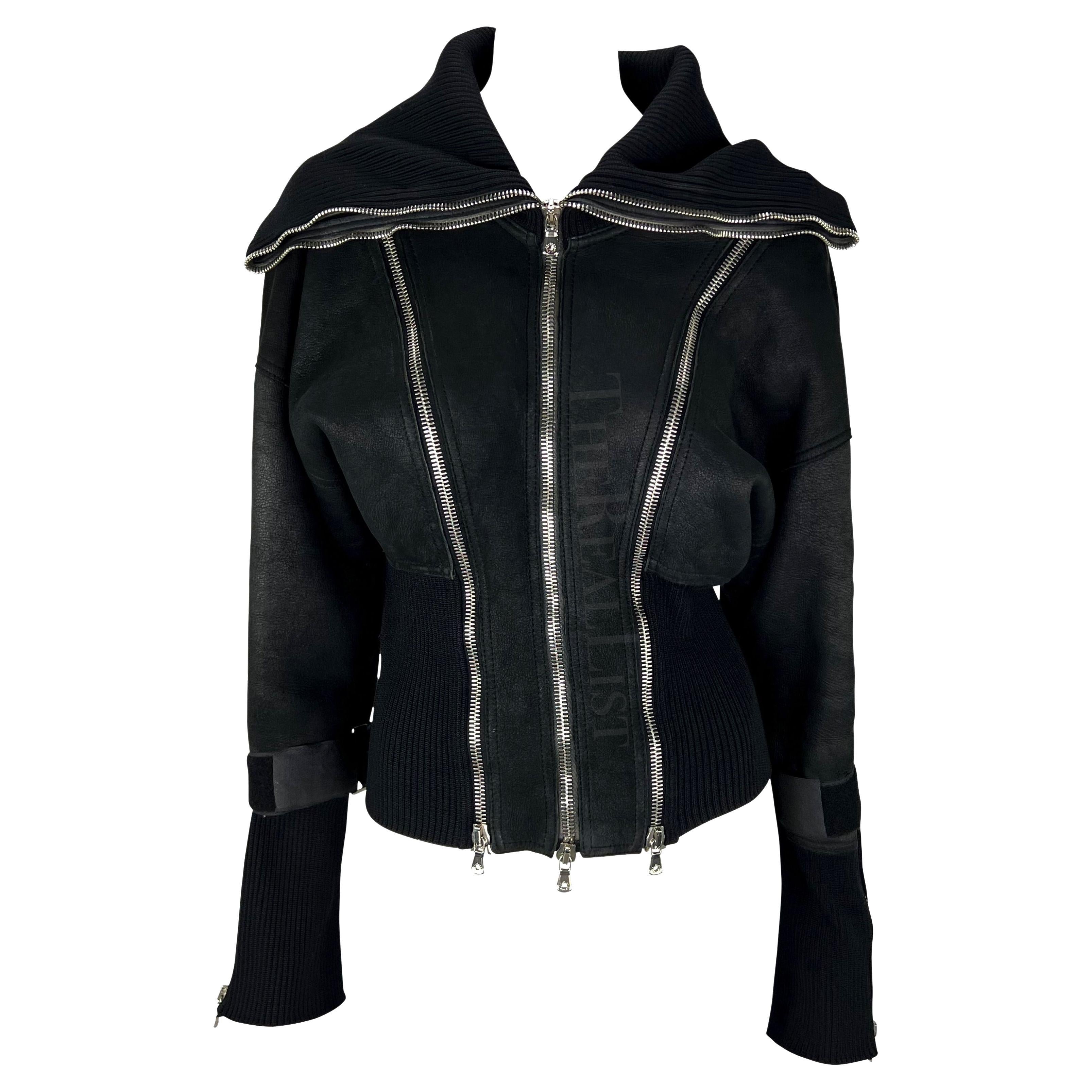 Presenting a fabulous black shearling Dolce & Gabbana jacket. From the Fall/Winter 2003 collection, this jacket is constructed of a suede exterior and shearling interior. Covered in large silver-tone zippers, this jacket features velcro straps at each arm, knit details at the cuff and body, and a fold-over collar. Add this vintage Dolce & Gabbana moto chic jacket to your wardrobe!