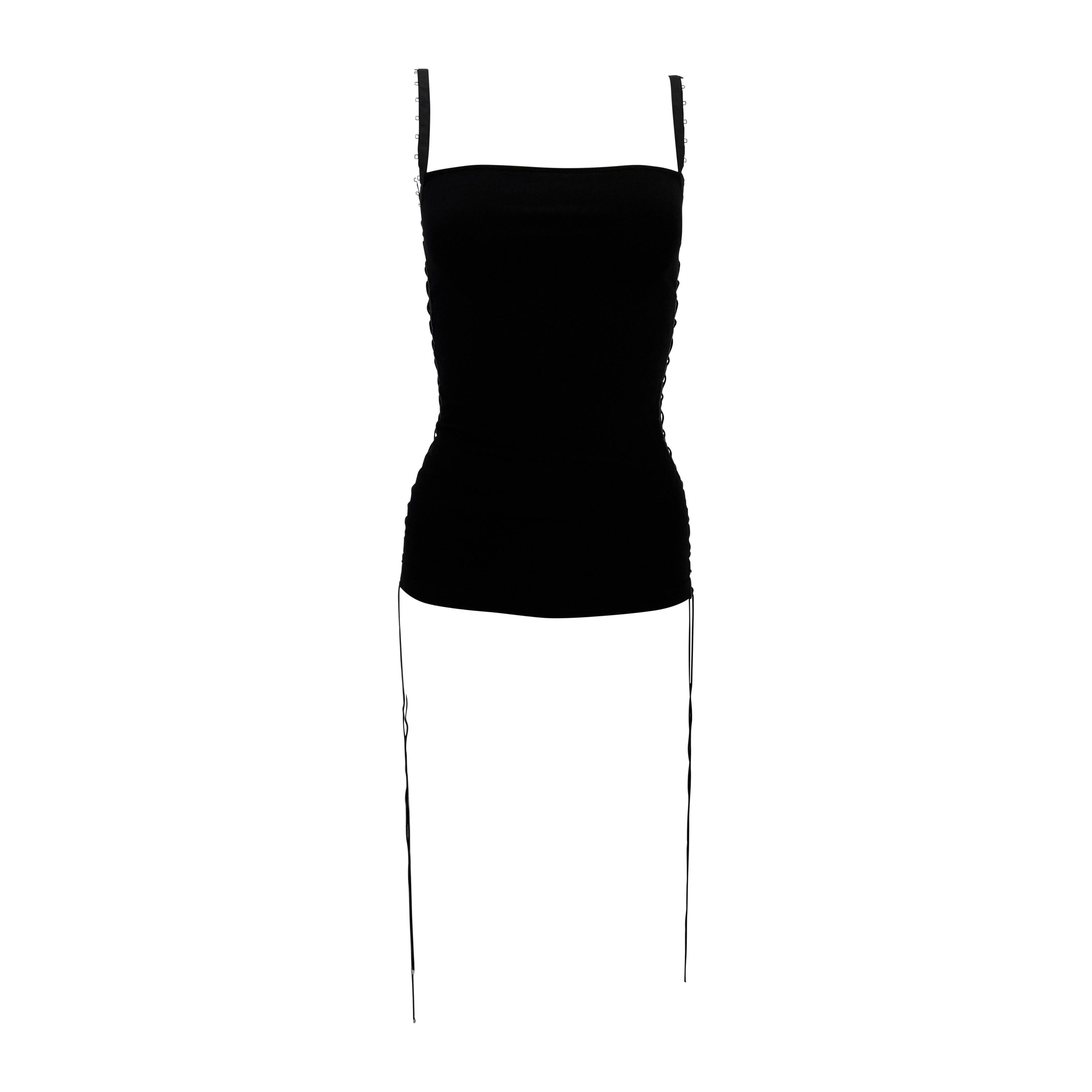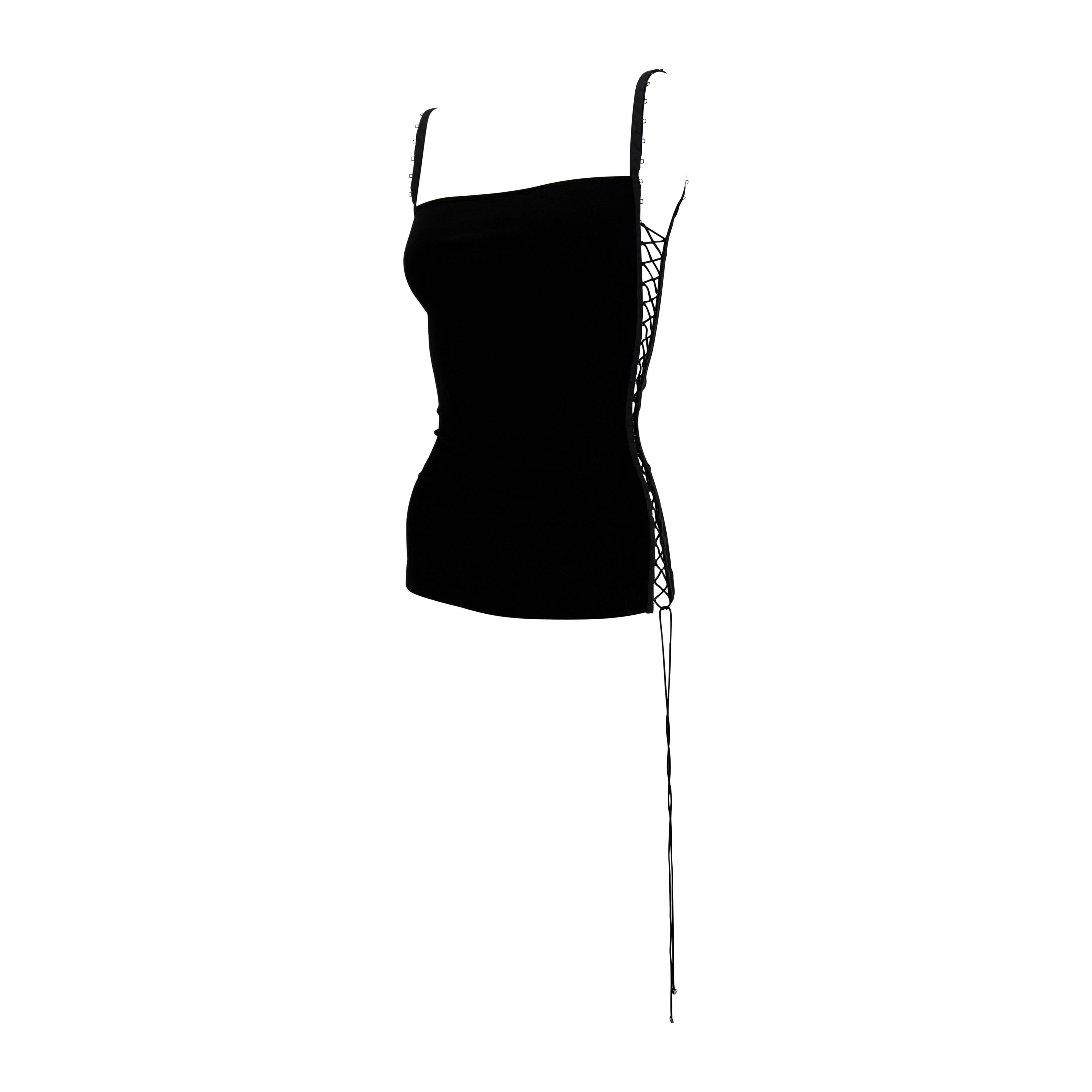 From Dolce & Gabbana’s Fall/Winter 2003 collection, this black stretch tank top features a sleek, body-hugging silhouette with dramatic lace-up sides.