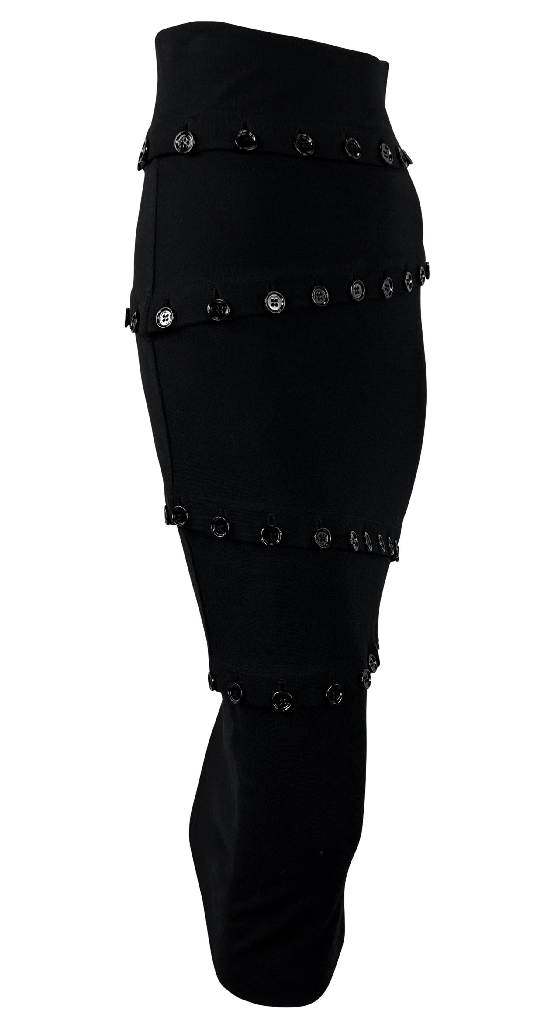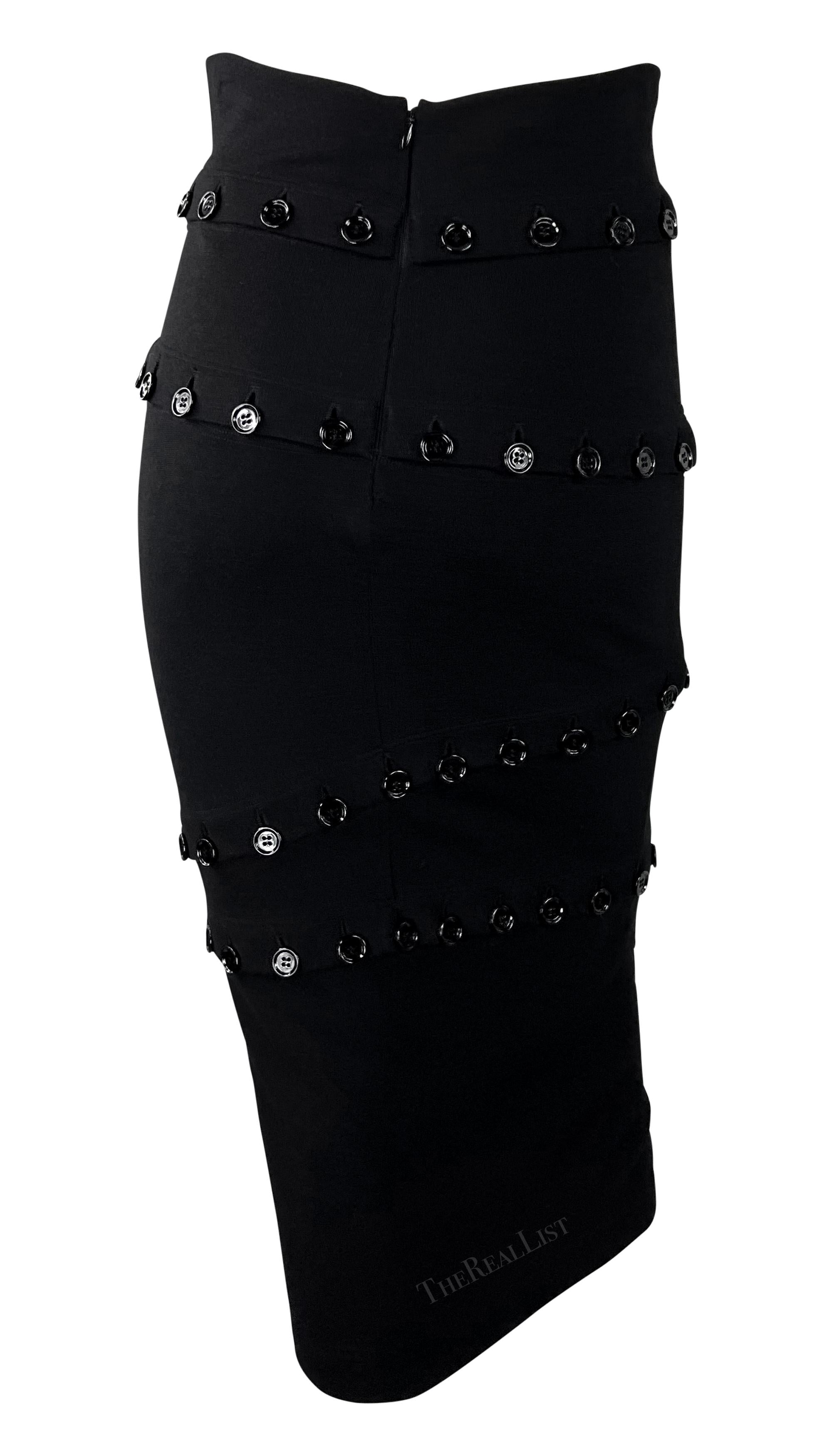 This fabulous black high-waisted skirt by Dolce & Gabbana is from the Fall/Winter 2003 collection and was showcased on the runway as part of look #35, modeled by Amber Valletta. The form-fitting, calf-length skirt is adorned with large black button accents, allowing it to be styled in various ways to suit the wearer's preference. We also have the crocodile bag from the runway look available for purchase on our storefront!