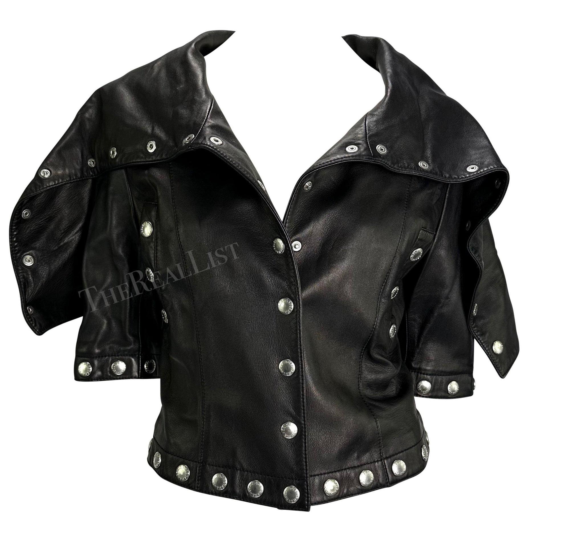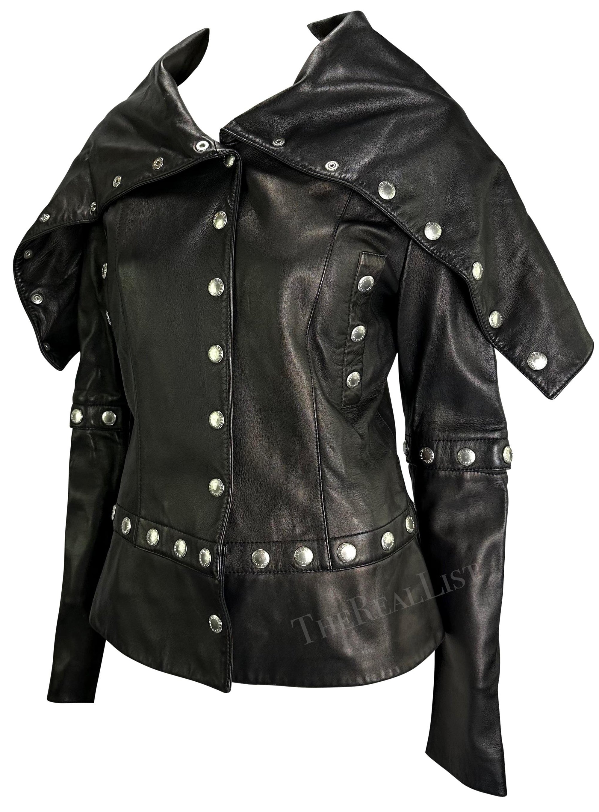 Presenting a stunning black leather Dolce and Gabbana snap jacket. From the Fall/Winter 2003 collection, many designs with these same snaps were used on the runway. This versatile jacket can be fashioned in several ways, as each snap is fully functional and allows both the sleeves and body to be shortened. A nearly identical coat was seen on Lil Kim at a 2003 Dolce and Gabbana party. Add this ultra-rare leather jacket to your collection!