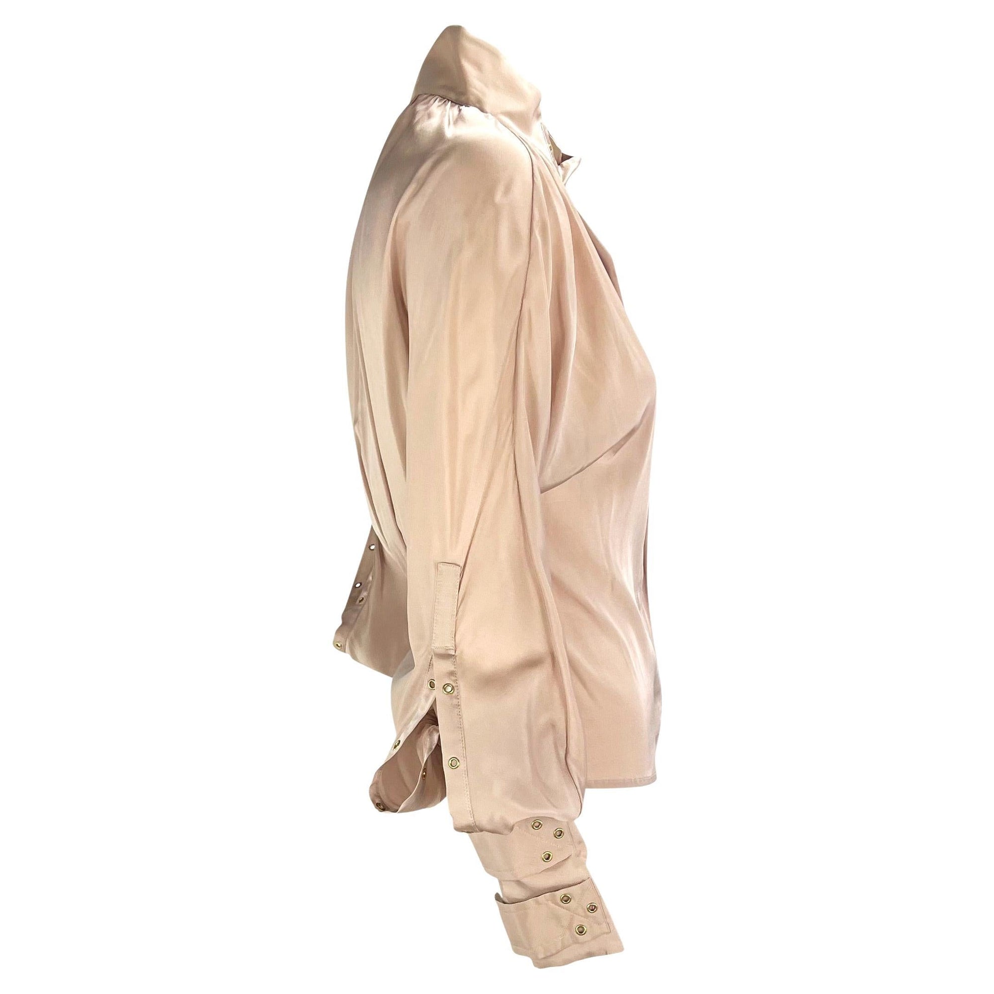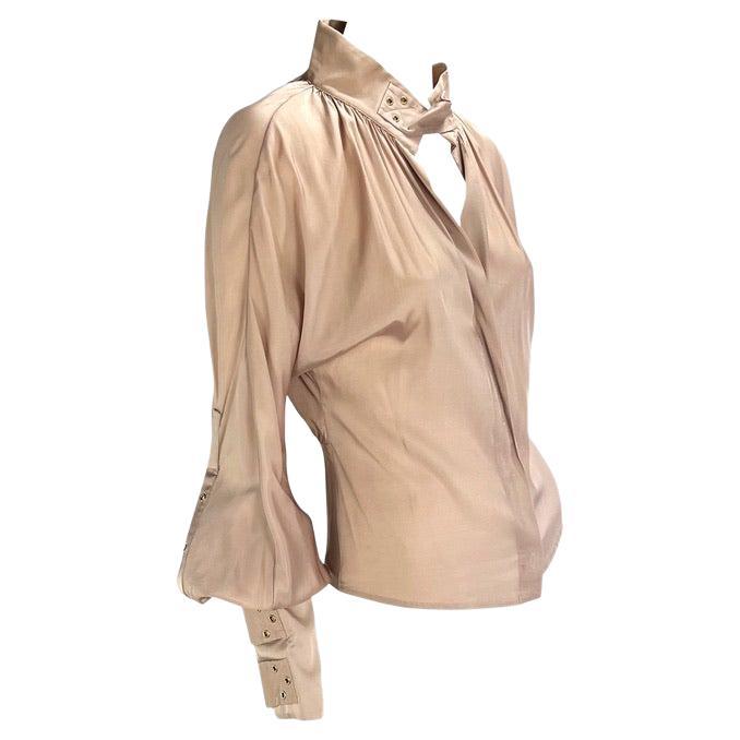 This beige silk long-sleeve Gucci shirt, designed by Tom Ford for the Fall/Winter 2003 collection, features luxurious silk with grommet and strap accents. The top has long cuffs with strap closures leading to voluminous sleeves. A matching strap is present at the neck, which can be worn open or closed. The blouse is finished with a stand-up collar and a deep neckline.
