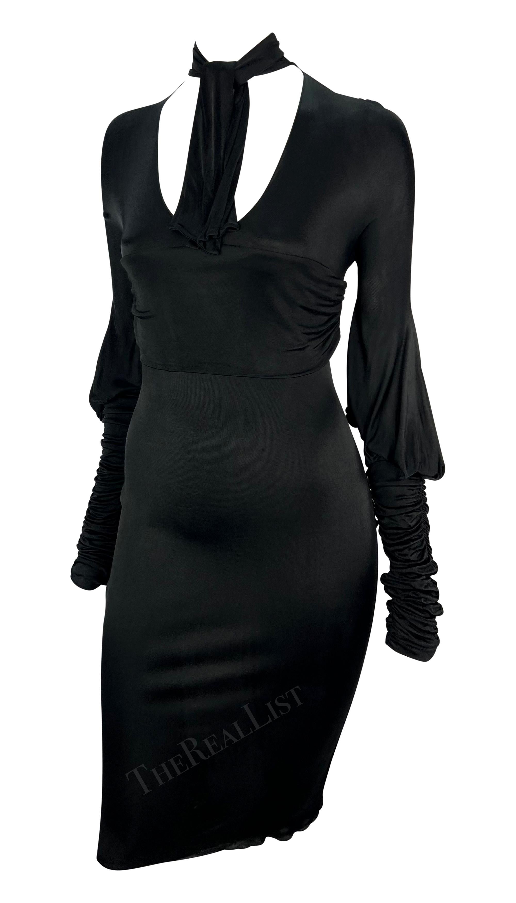 This black Gucci mini dress, designed by Tom Ford, is from the Fall/Winter 2003 collection. Made of stretch fabric, it features a deep v-neckline and a pussy cat bow. The long sleeves are ruched and fitted at the forearm, with fabric billowing at the elbow. This dress adds a touch of sophistication to any wardrobe as a versatile LBD.