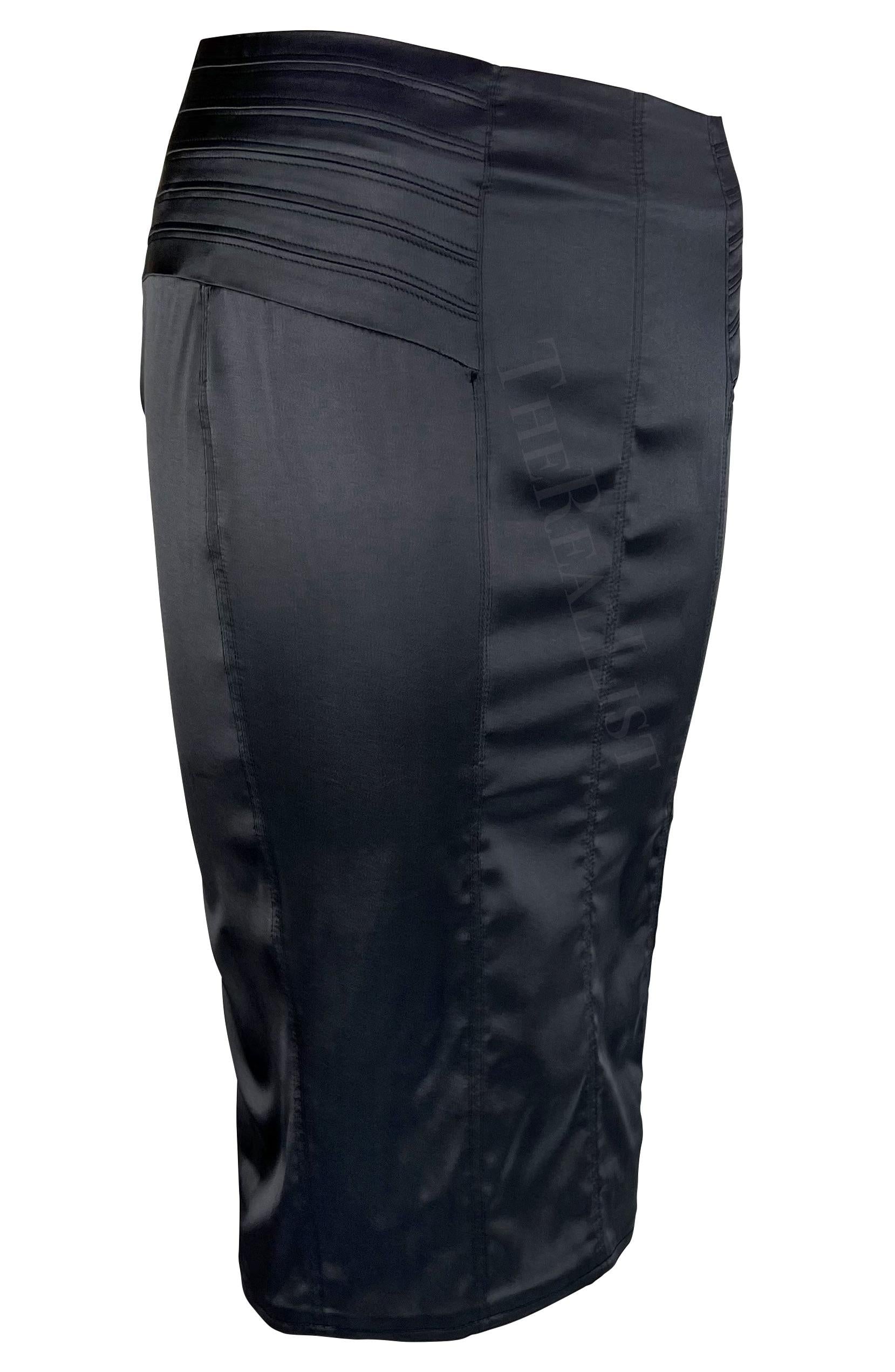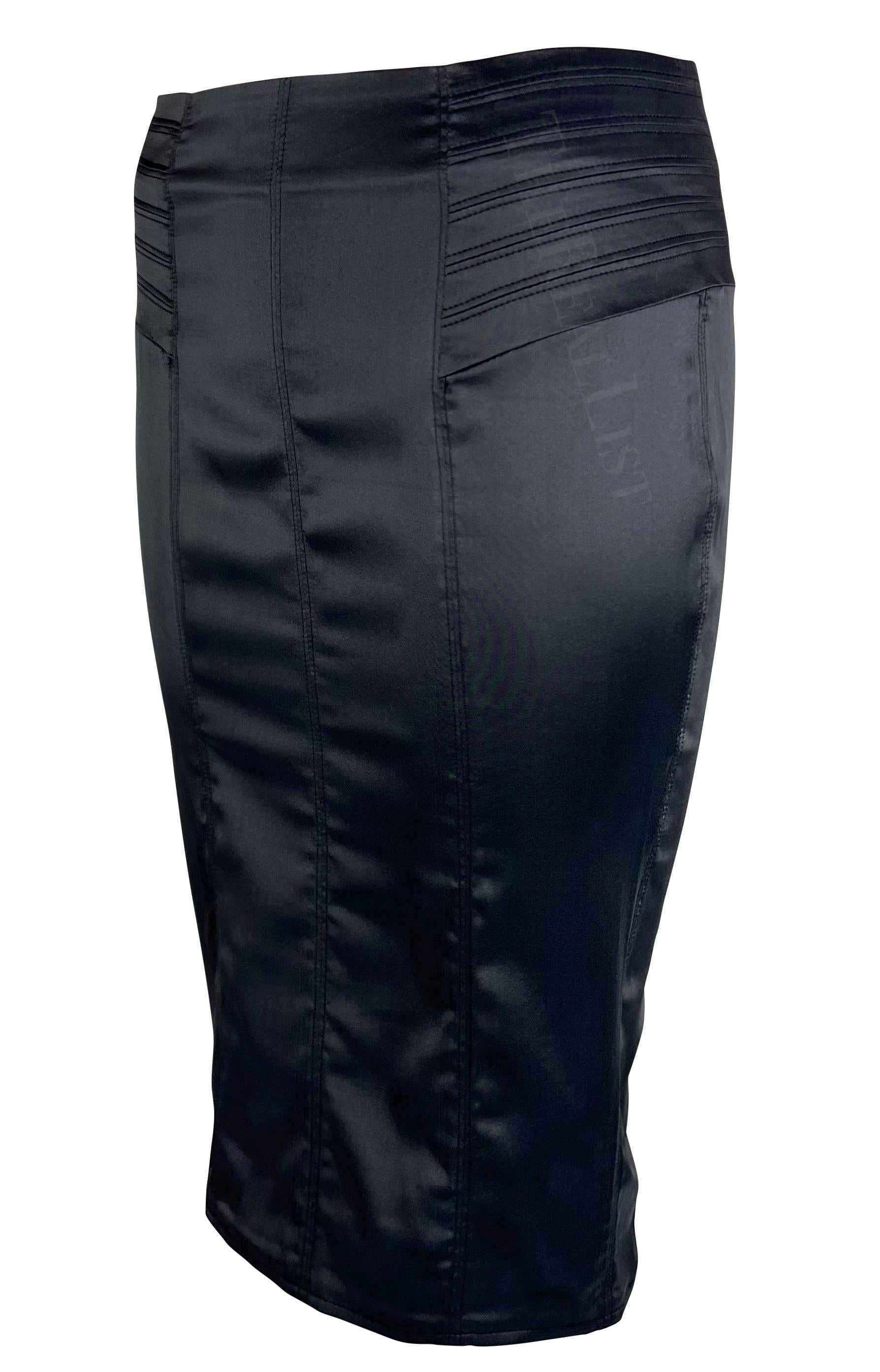 Presenting a fabulous black silk satin Gucci pencil skirt designed by Tom Ford. From the Fall/Winter 2003 collection, this skirt features large panels and a slit at the back and is made complete with quilted details on either side.