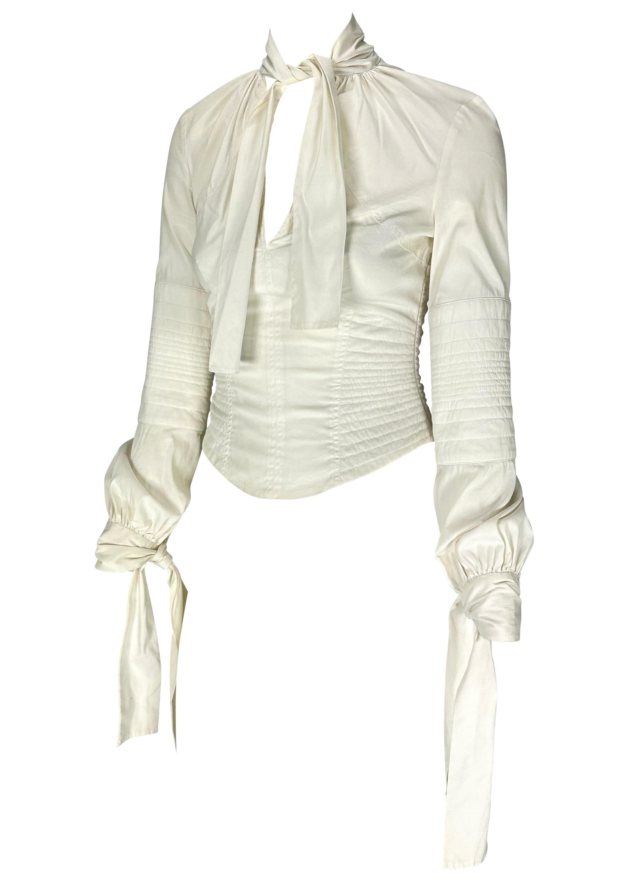 Presenting a white cotton Gucci blouse designed by Tom Ford. From the Fall/Winter 2003 collection, this beautiful top features quilted details on the body, creating a corset silhouette. With a plunging neckline, this top has ties that wrap around the neck and wrists.