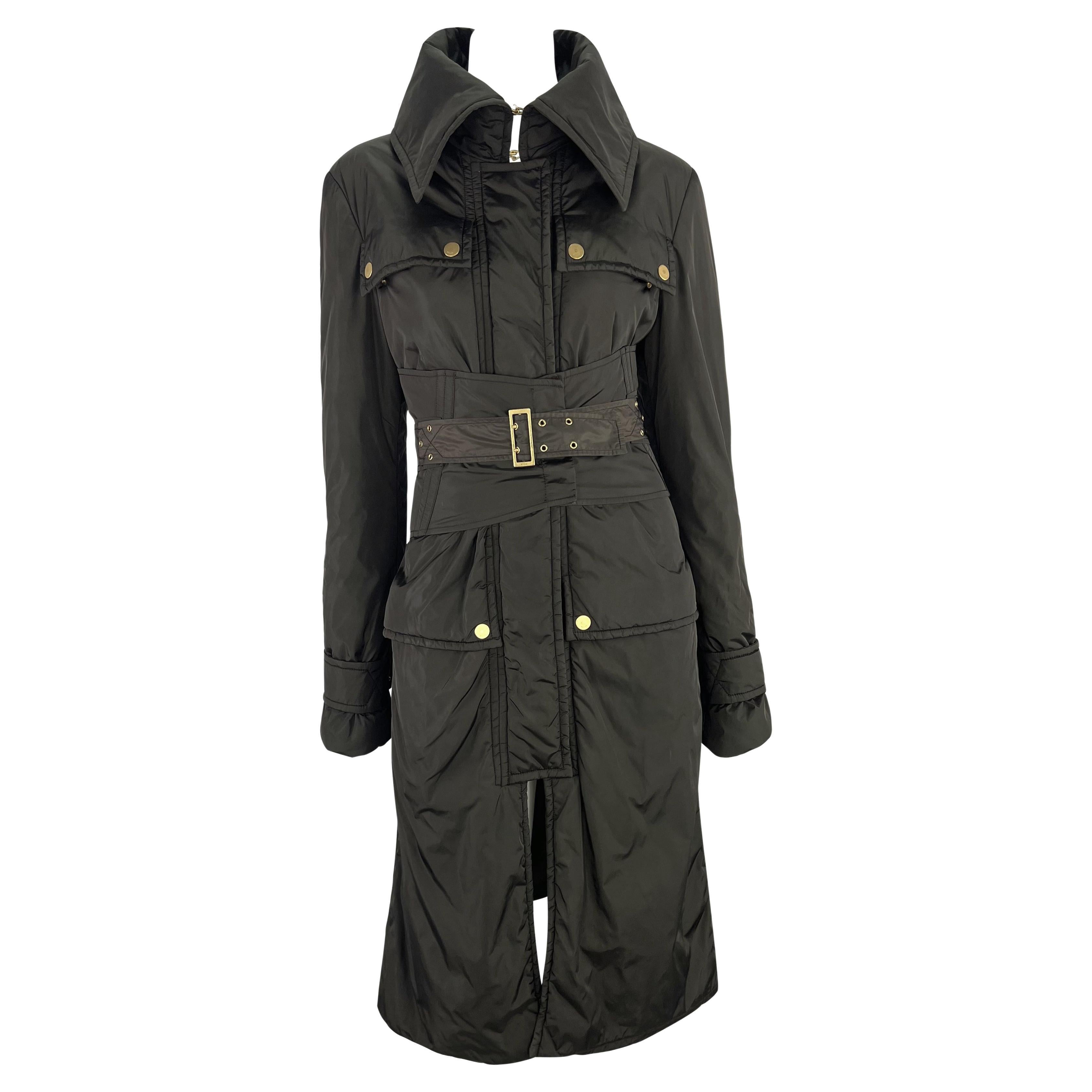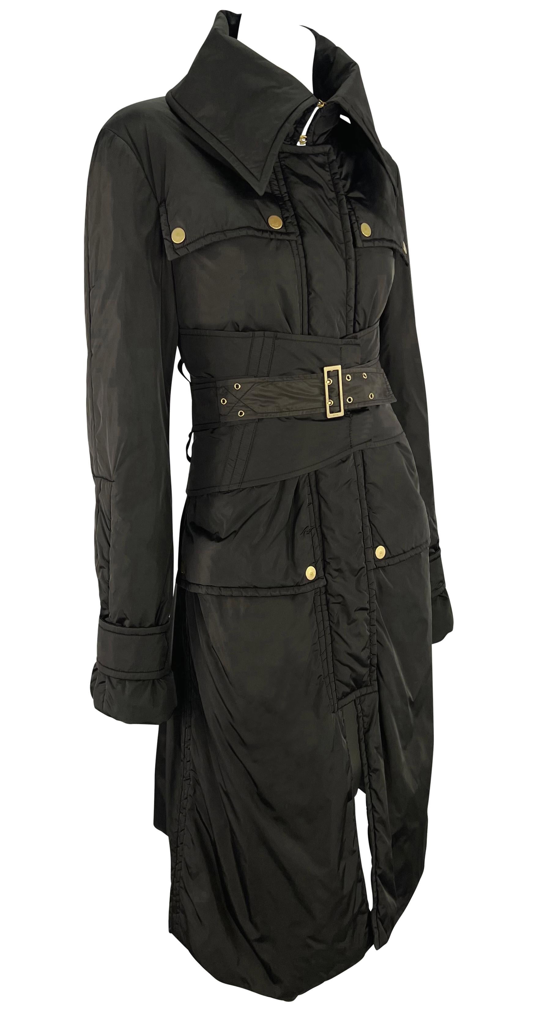 Tom Ford designed this olive green puffer jacket for Gucci's Fall/Winter 2003 collection. This sophisticated winter essential made its debut as Look 2 on the season's runway, modeled by Adina Fohlin. The down-filled puffer jacket falls below the knee and features a dramatic fold-over collar, gold-tone metal accents, and pockets at the bust and hips. It is complemented by a removable corset waist belt that creates a defined waist. Whether worn together or separately, this Gucci by Tom Ford puffer jacket is a stylish and warm addition to any wardrobe.