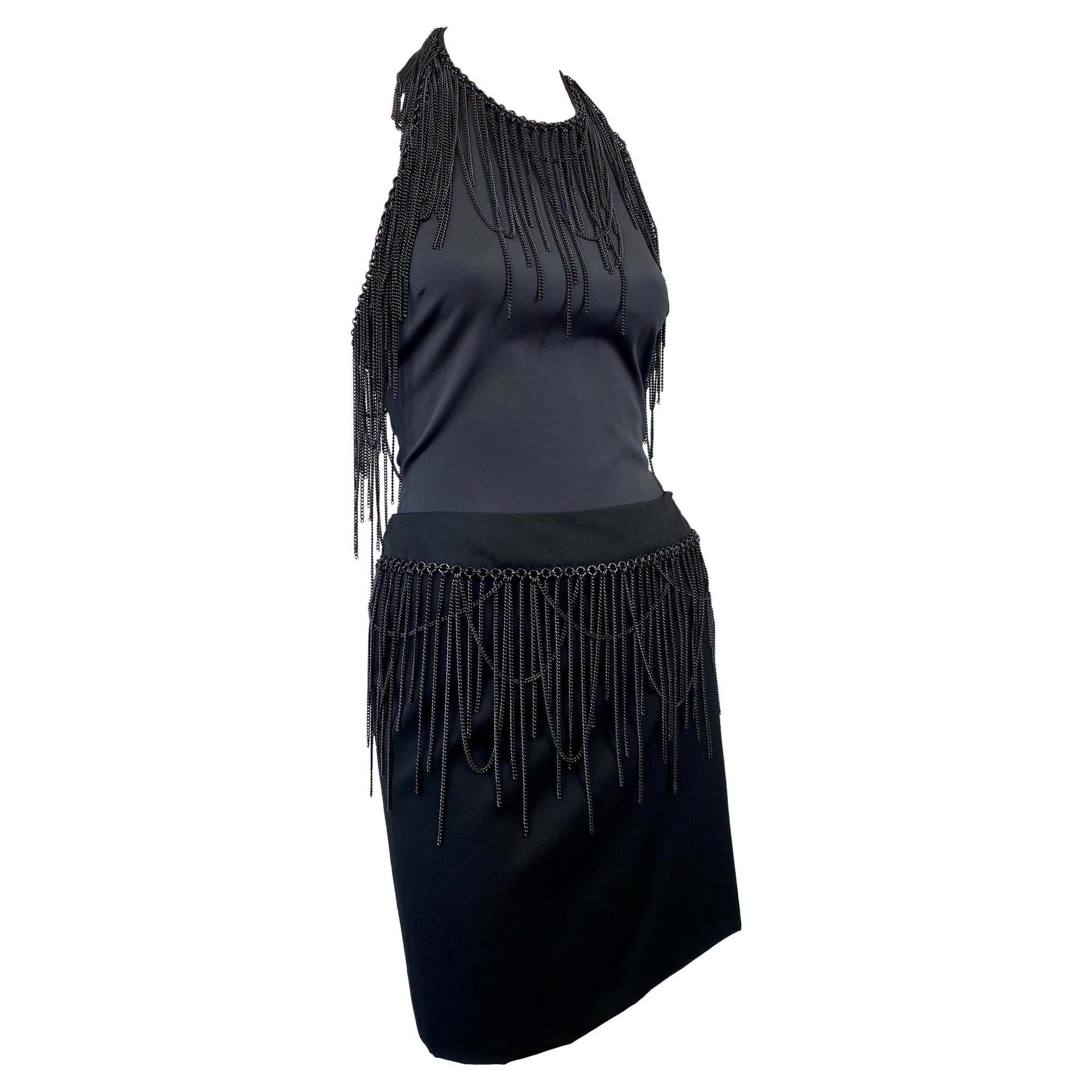 F/W 2003 Versace by Donatella Black Halter Tank Top Fringe Chain Skirt Set
