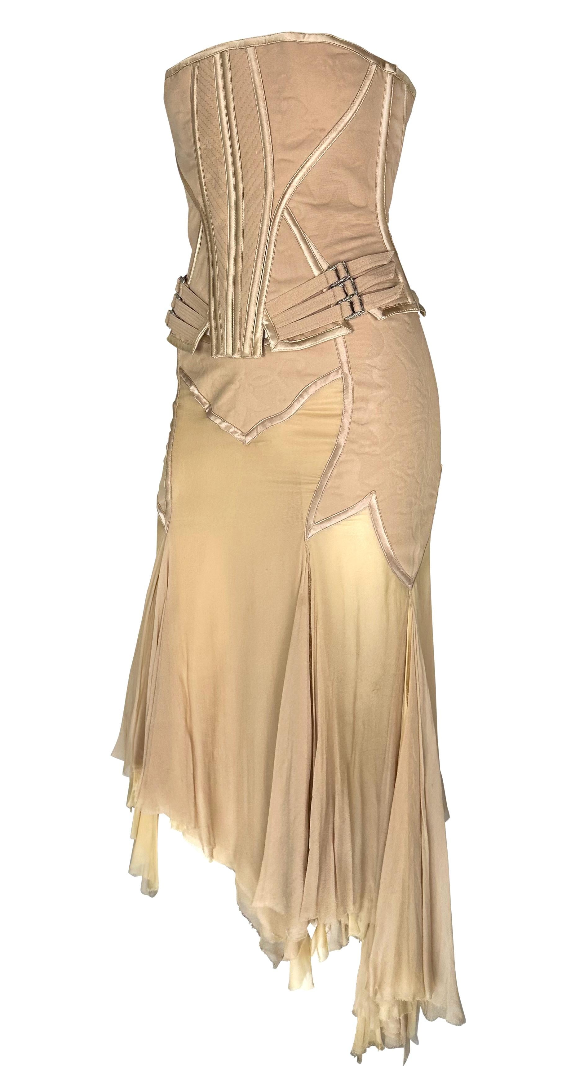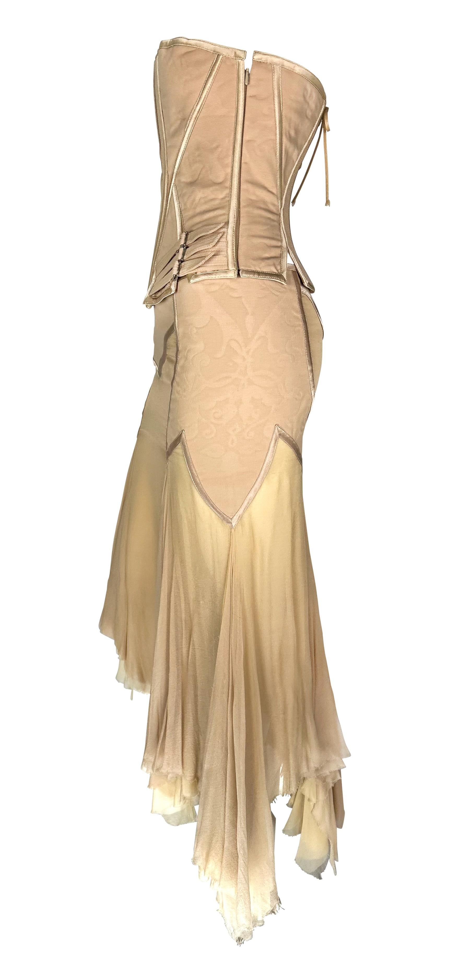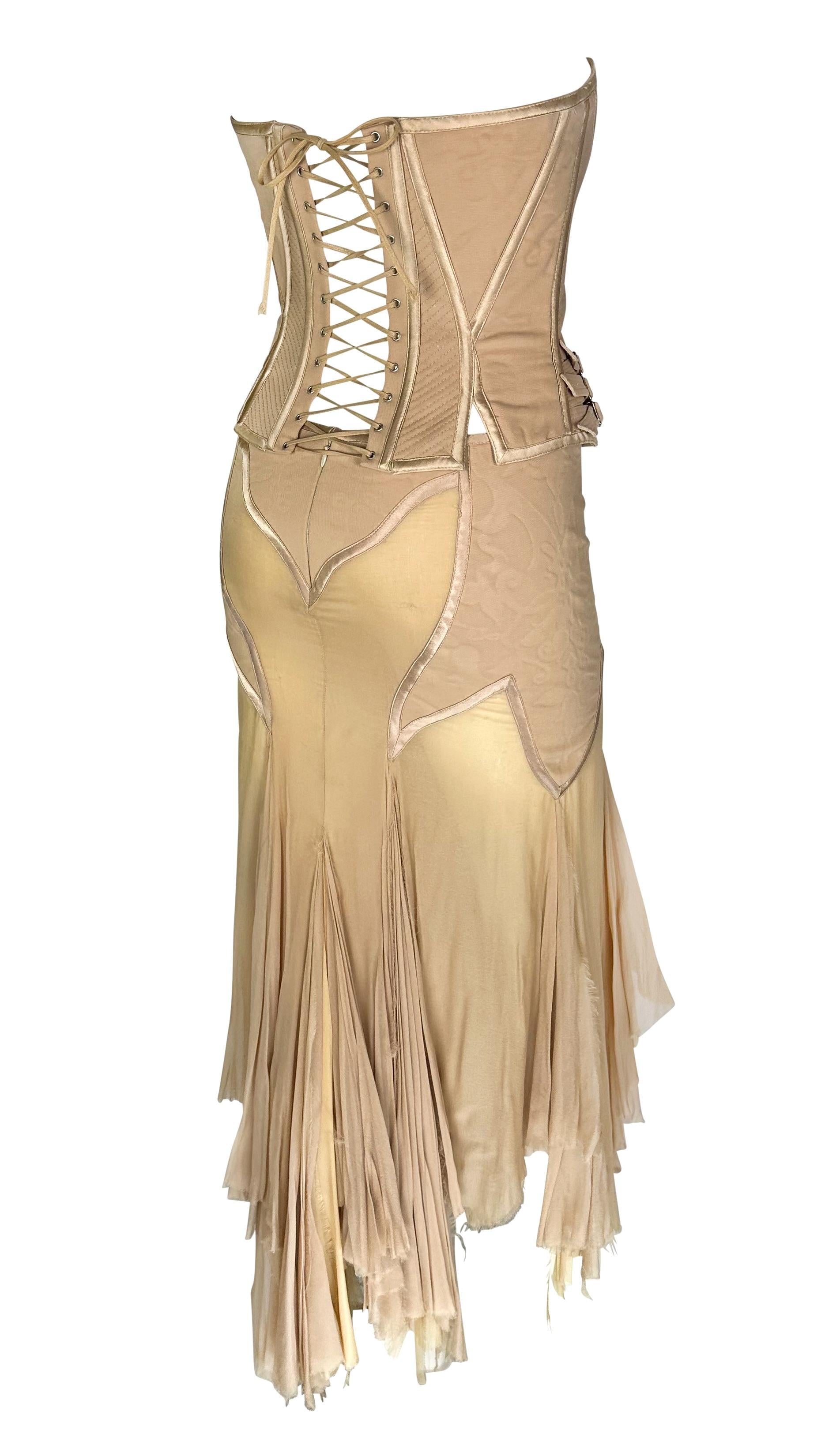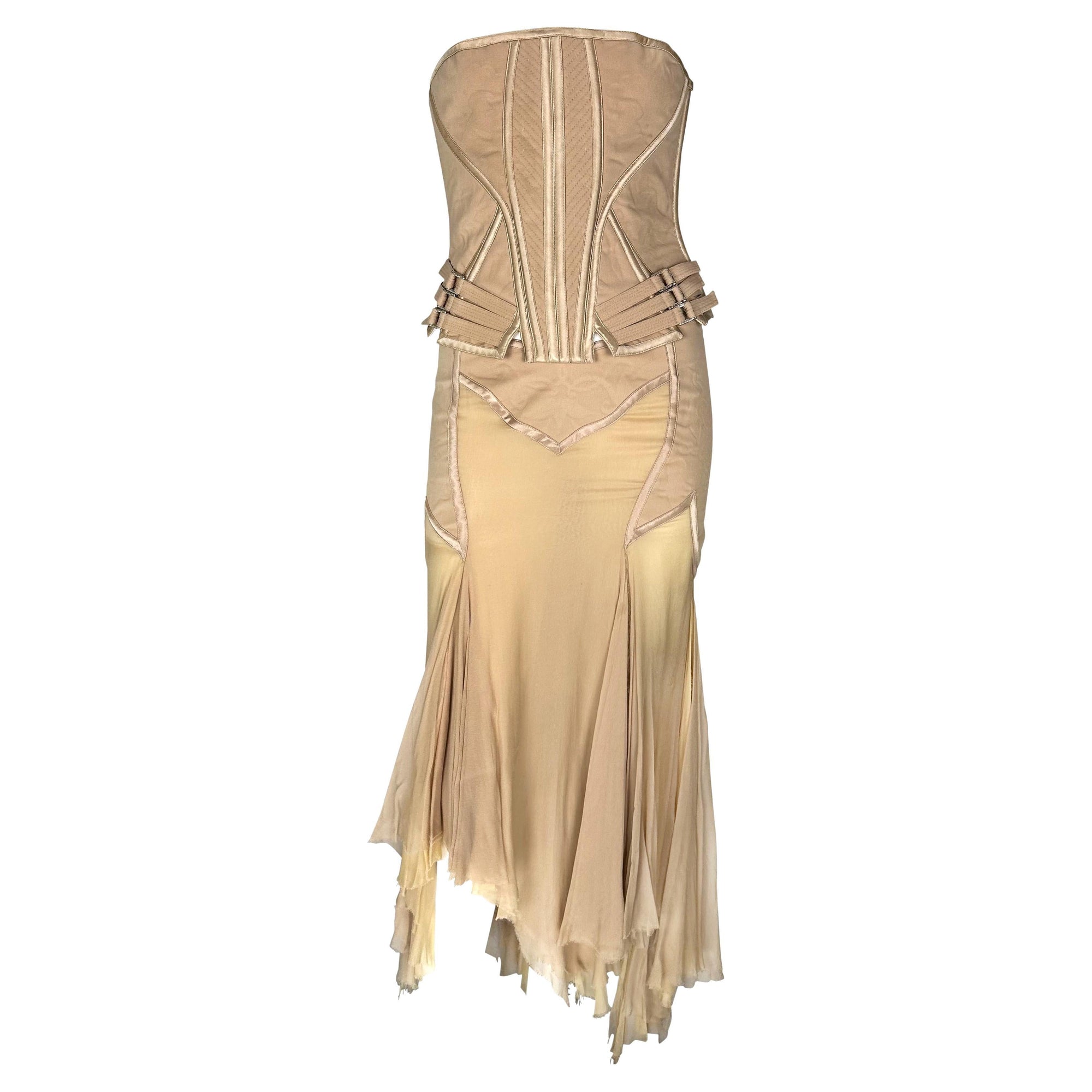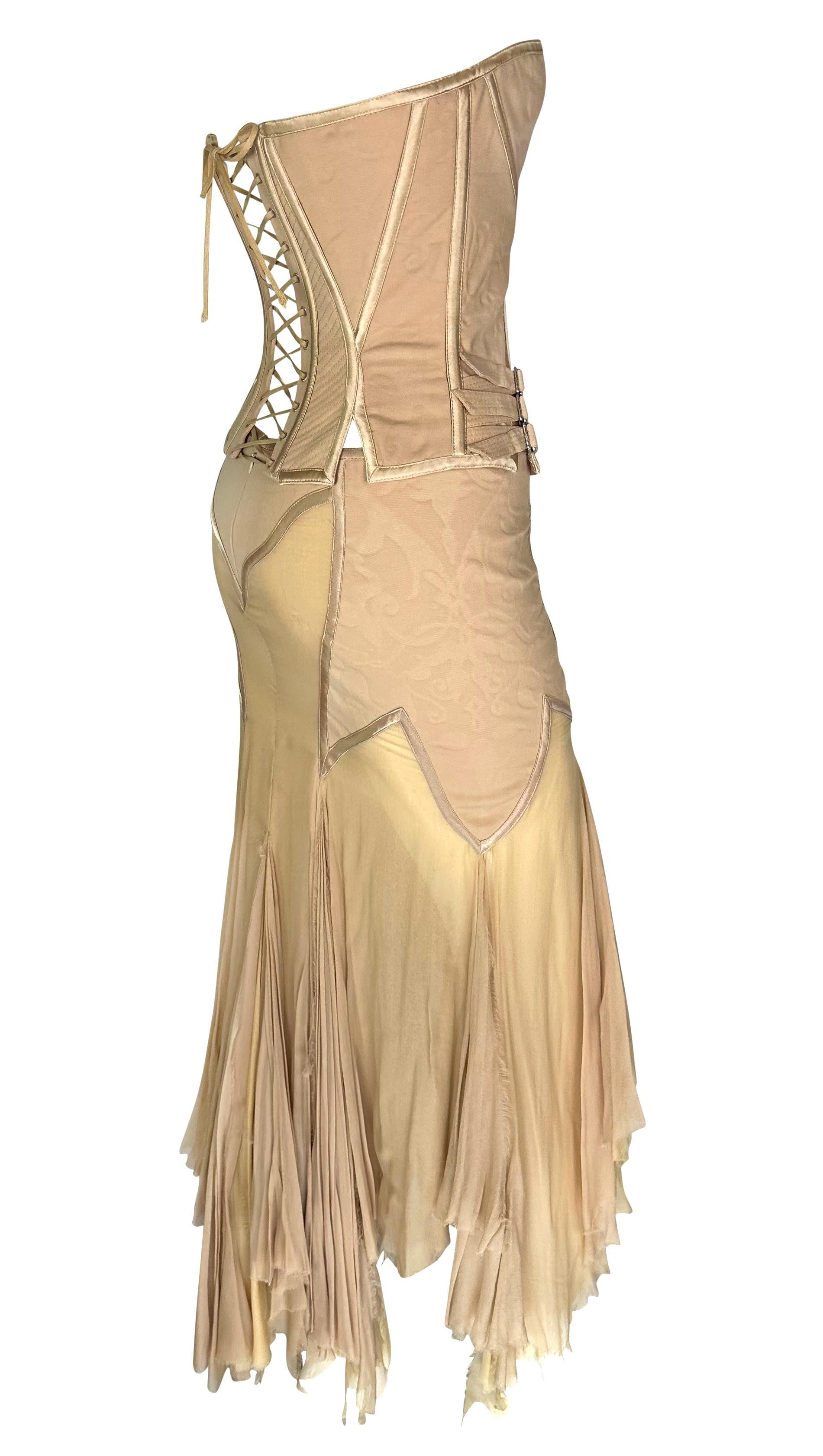Presenting an incredible beige Gianni Versace skirt set designed by Donatella Versace. From the Spring/Summer 2003 collection, this skirt set debuted on the season's runway as Look 48, modeled by Michelle Alves. This beautiful set comprises a strapless corset and a matching midi skirt. The boned corset features shiny satin trim and fasteners at the hips. The matching handkerchief-style skirt is fitted at the hips and juts off into unhemmed. Whether worn together or separately, this rare sample Versace set by Donatella set is a must-have addition to any wardrobe!