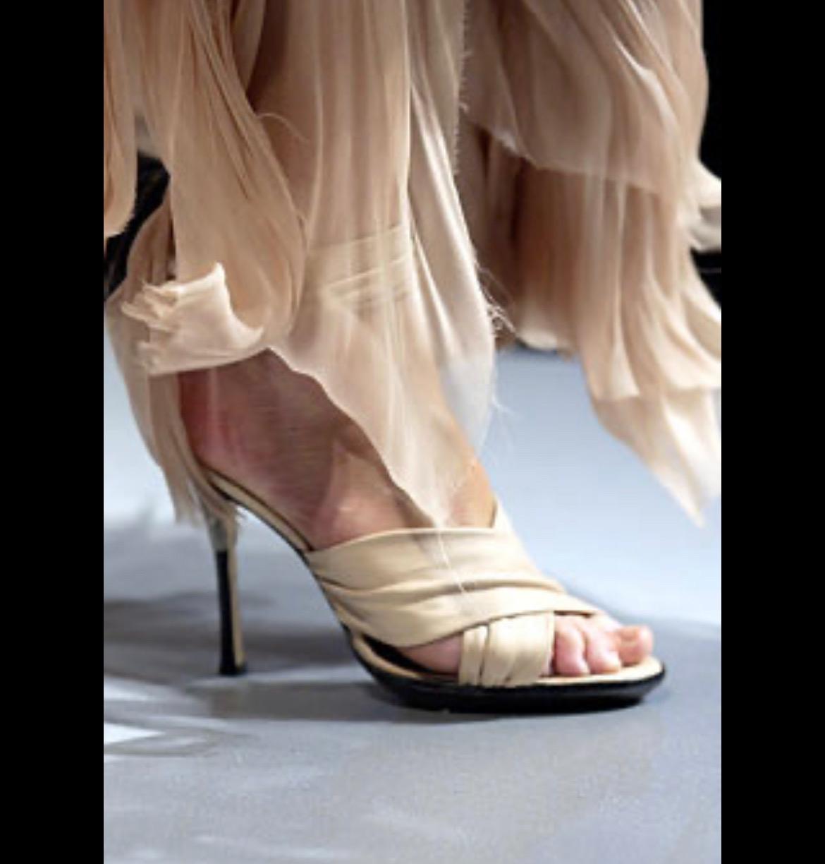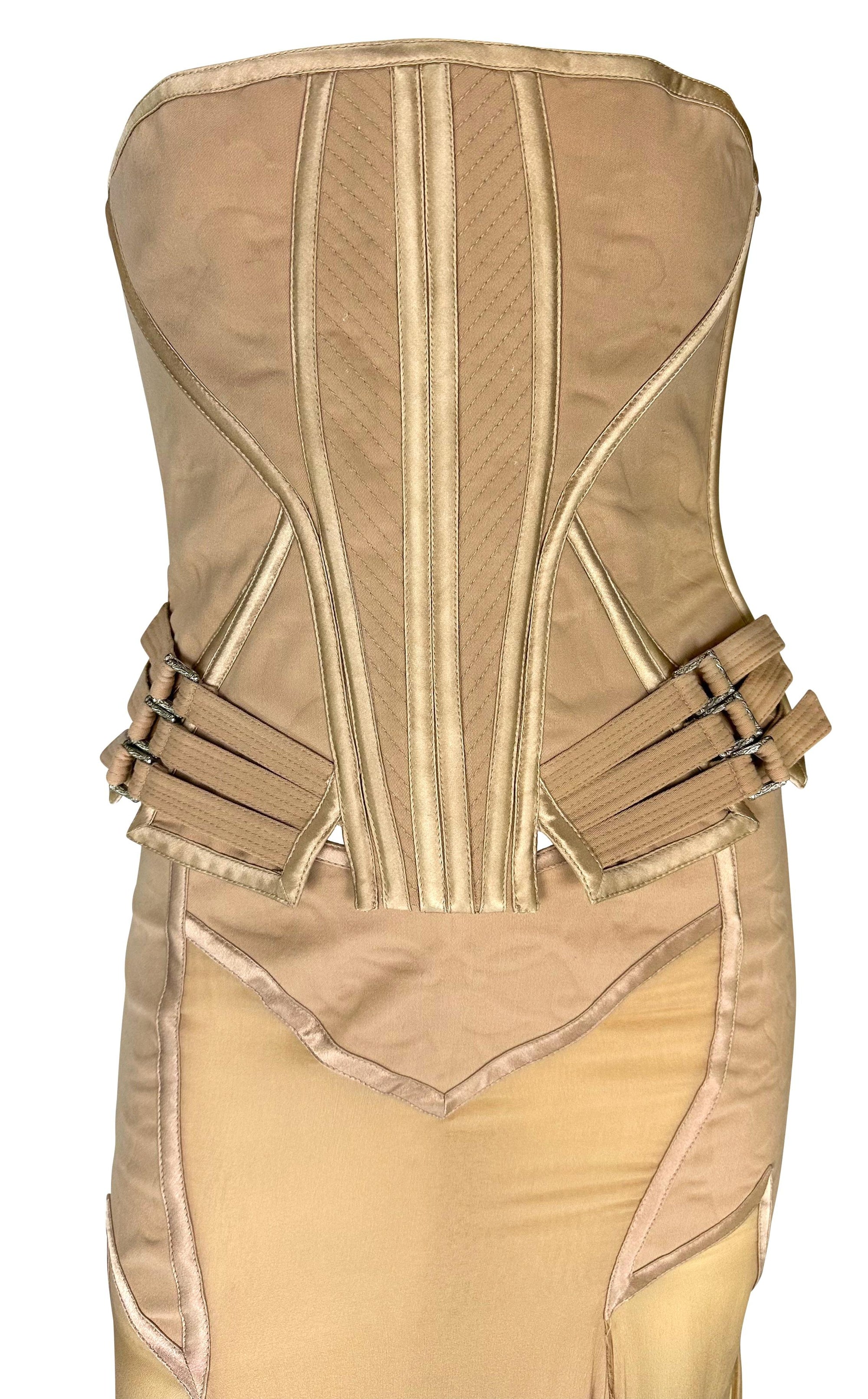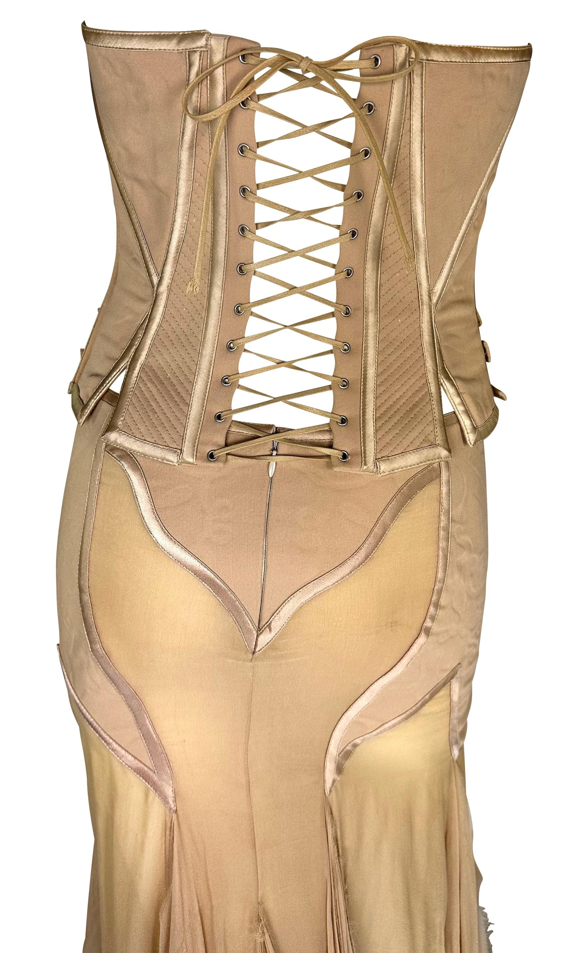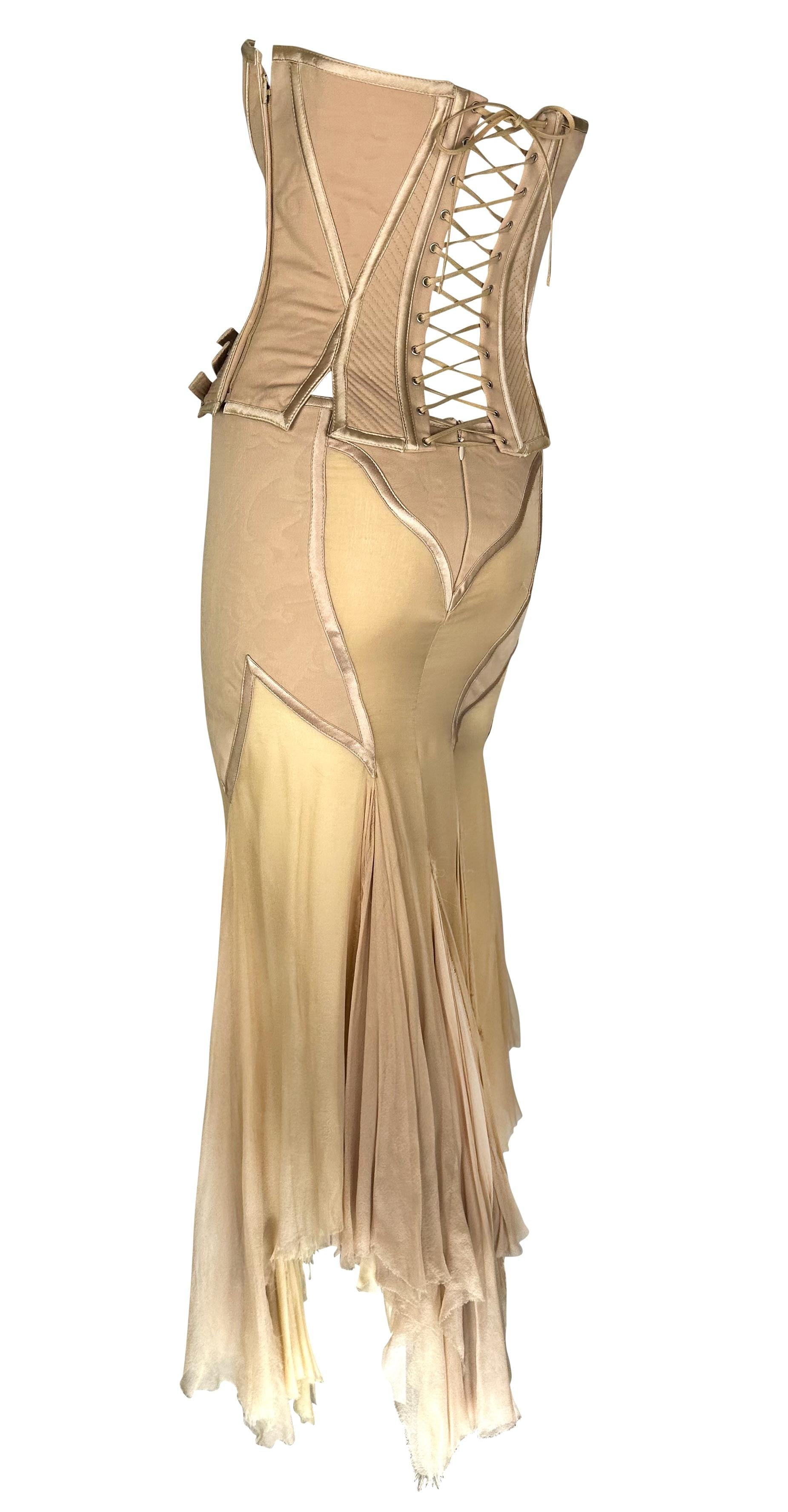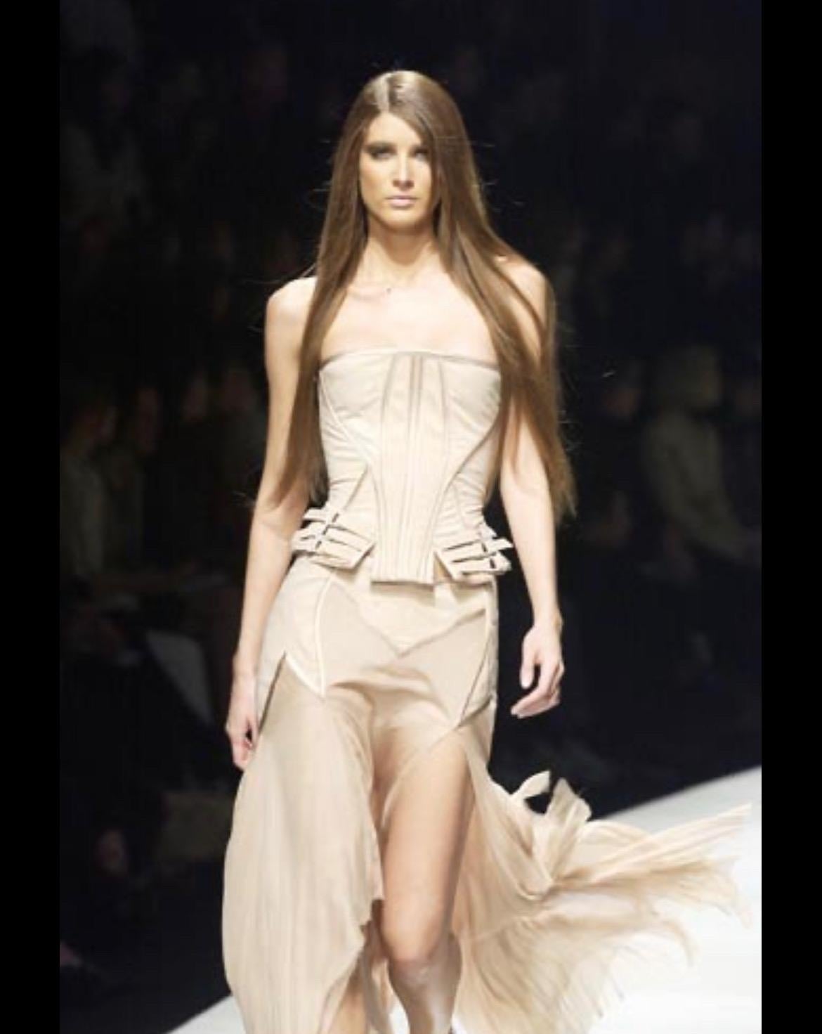 Presenting an incredible beige Gianni Versace skirt set designed by Donatella Versace. From the Spring/Summer 2003 collection, this skirt set debuted on the season's runway as Look 48, modeled by Michelle Alves. This beautiful set comprises a strapless corset and a matching midi skirt. The boned corset features shiny satin trim and fasteners at the hips. The matching handkerchief-style skirt is fitted at the hips and juts off into unhemmed. Whether worn together or separately, this rare sample Versace set by Donatella set is a must-have addition to any wardrobe!