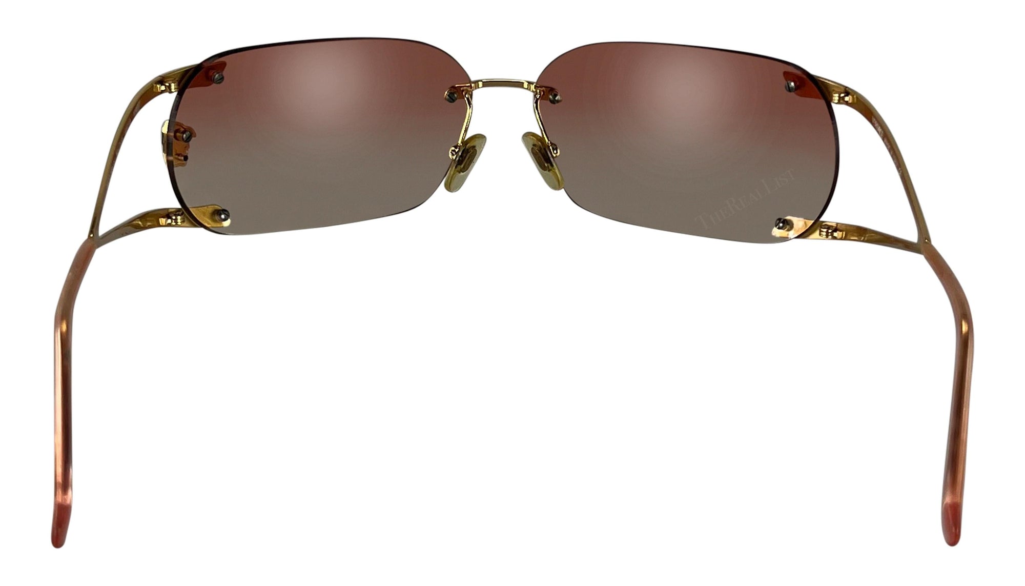 From the Fall/Winter 2003 collection, these oversized Versace rimless sunglasses were worn with multiple looks on the season's runway. Designed by Donatella Versace, these sunnies feature pink ombre lenses and rhinestone accented gold-tone arms and are made complete with a Versace Medusa logo on one lens. Add these fabulous Y2K sunglasses to your wardrobe!