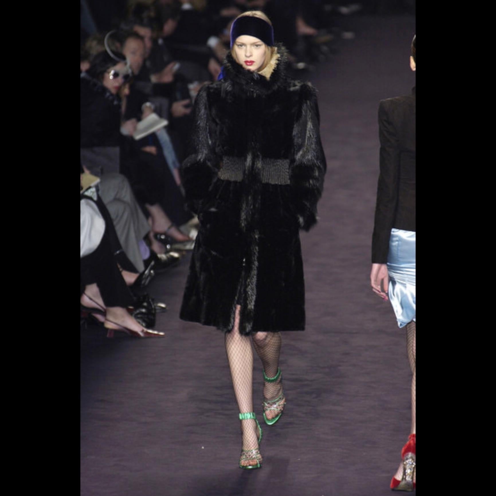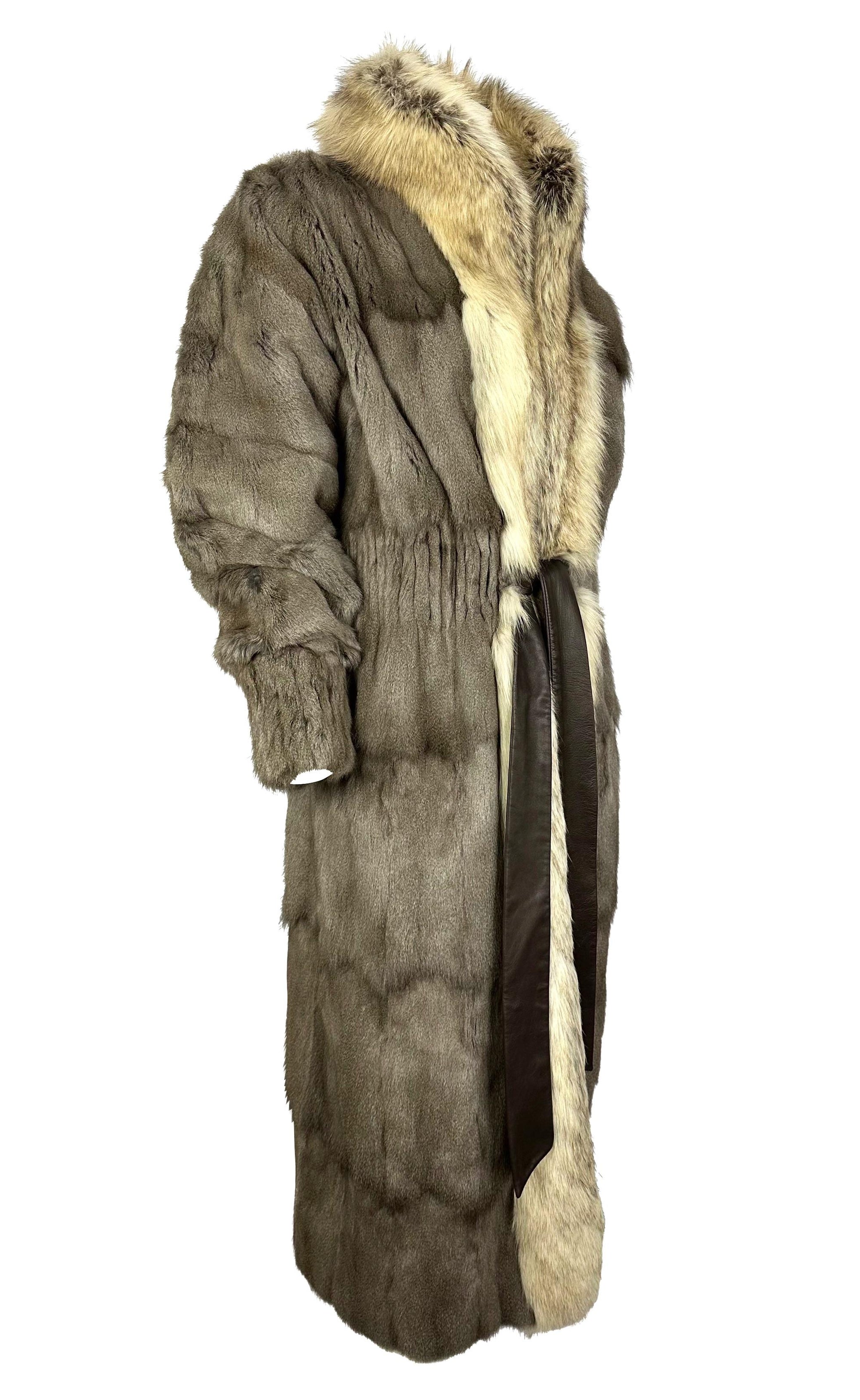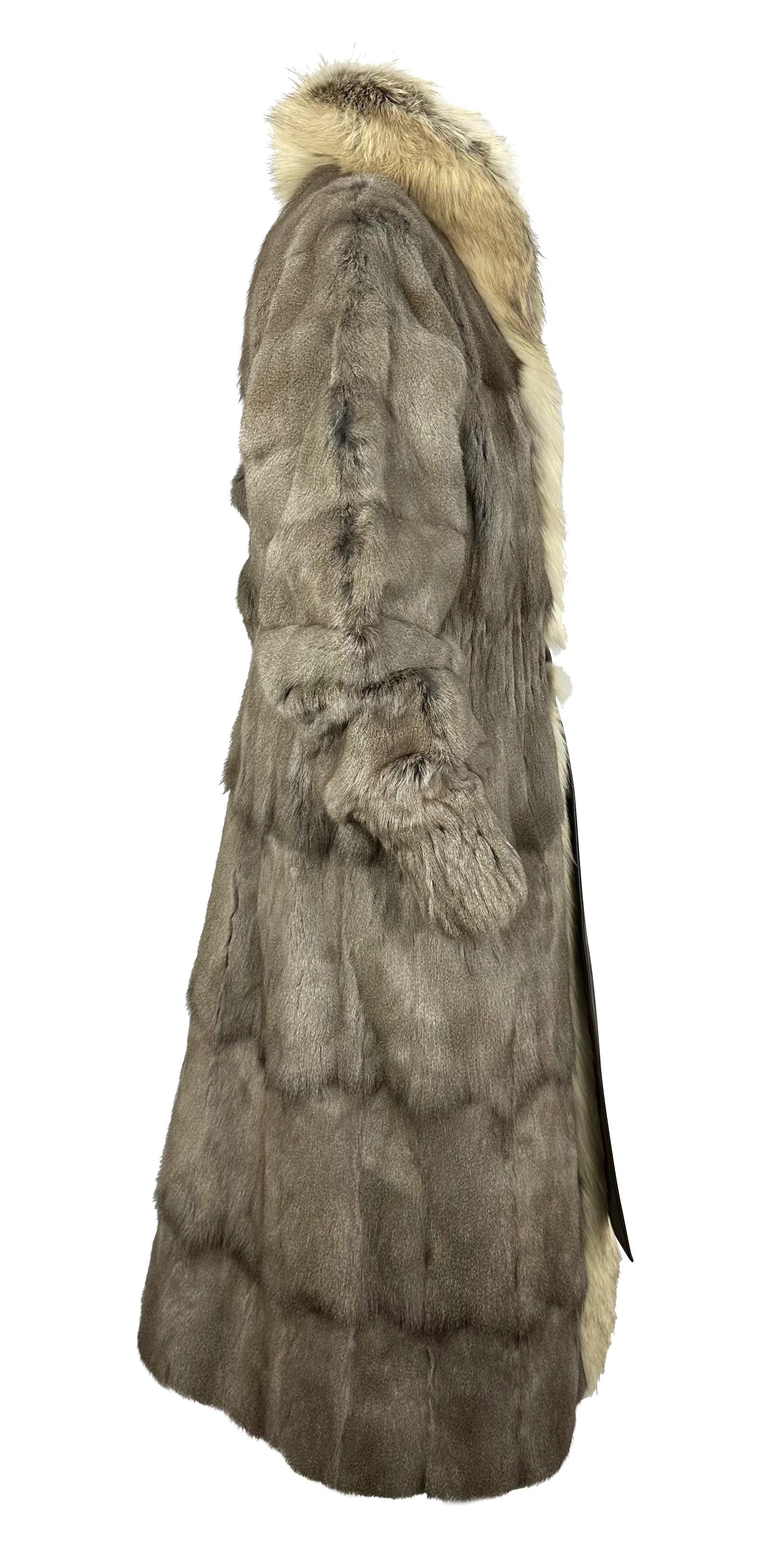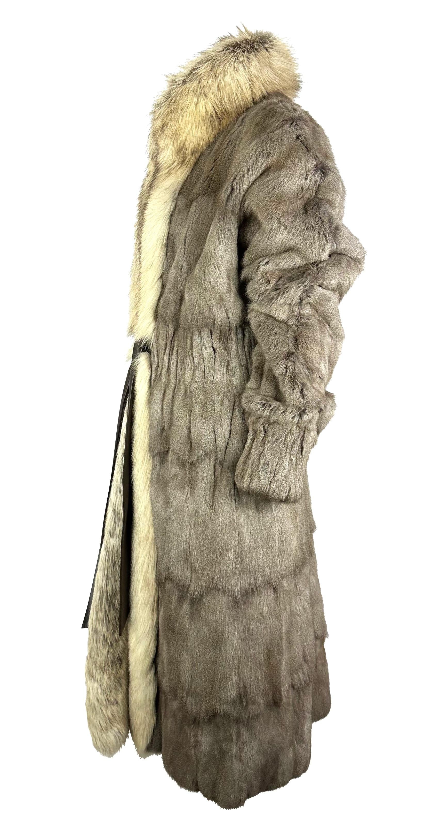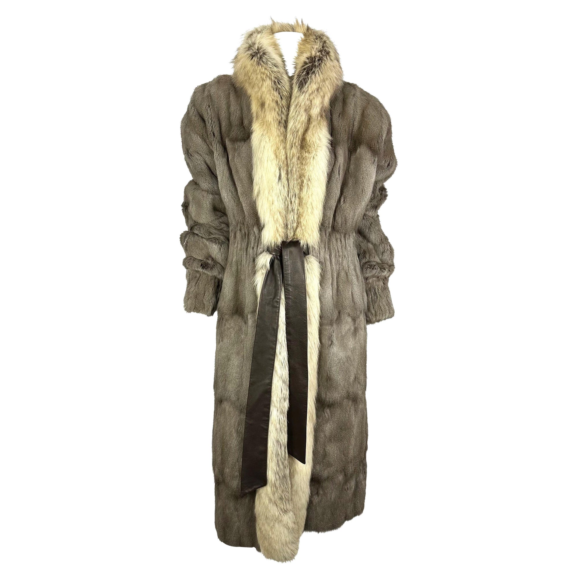 This grey Yves Saint Laurent Rive Gauche fur coat was designed by Tom Ford for the Fall/Winter 2003 collection. A version in black fox fur debuted on the runway as Look 5, modeled by Elise Crombez. This example is crafted from petit gris fur with fox fur accents and fastens at the waist with a brown leather tie. A cinched elastic waist and cuffs complete the design, emphasizing the refined silhouette characteristic of Ford’s tenure at YSL.