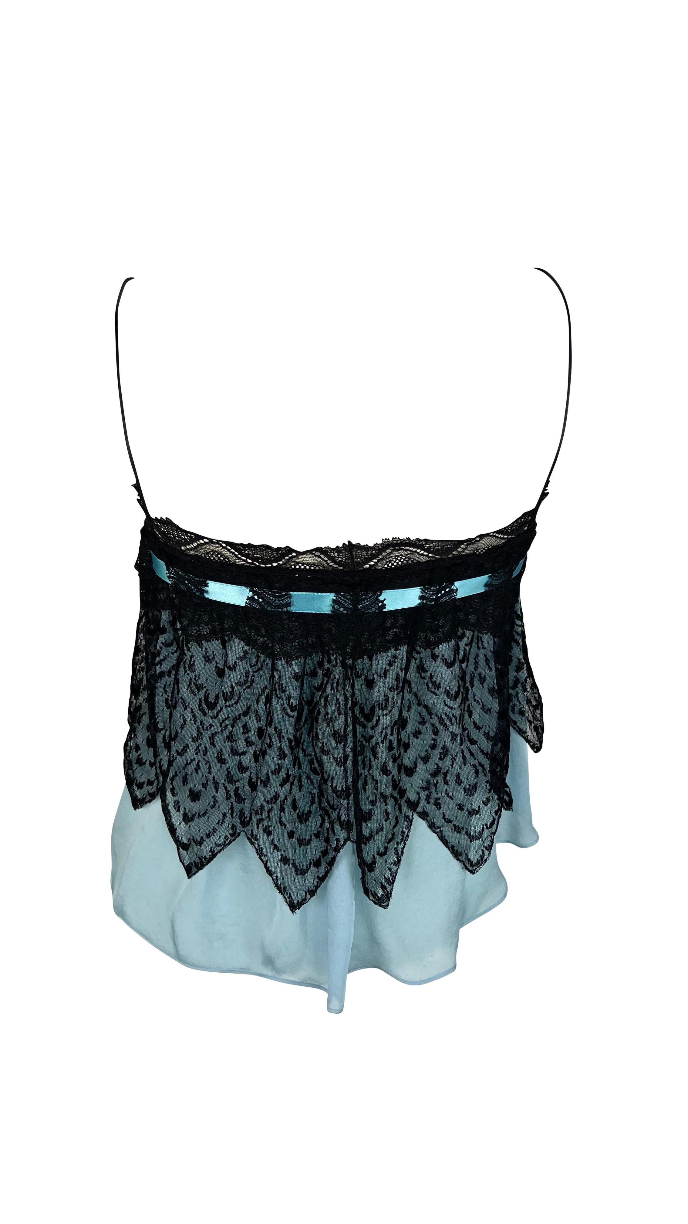 Presenting a fabulous light blue and black lace Yves Saint Laurent Rive Gauche tank top, designed by Tom Ford. From the Fall/Winter 2003 collection, this top debuted on the season's runway in pink as part of look 18. Constructed with sheer light blue chiffon, this top features a lace overlay, spaghetti straps, and a blue satin ribbon around the bust. The perfect Tom Ford for YSL Y2K piece to add to your wardrobe, this light and sexy top is sure to amp up any look. Check out our storefront for other iconic Tom Ford for YSL pieces!