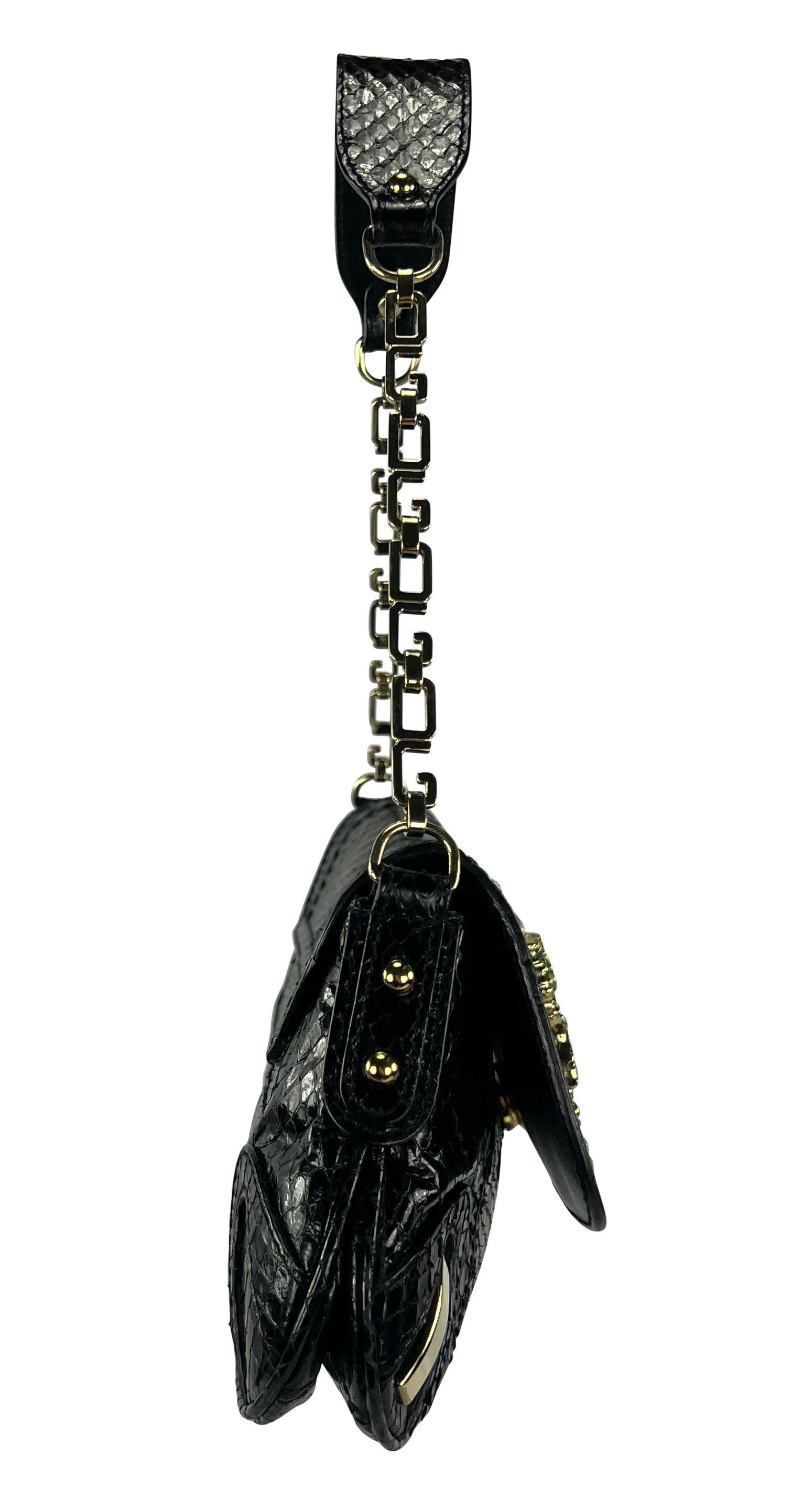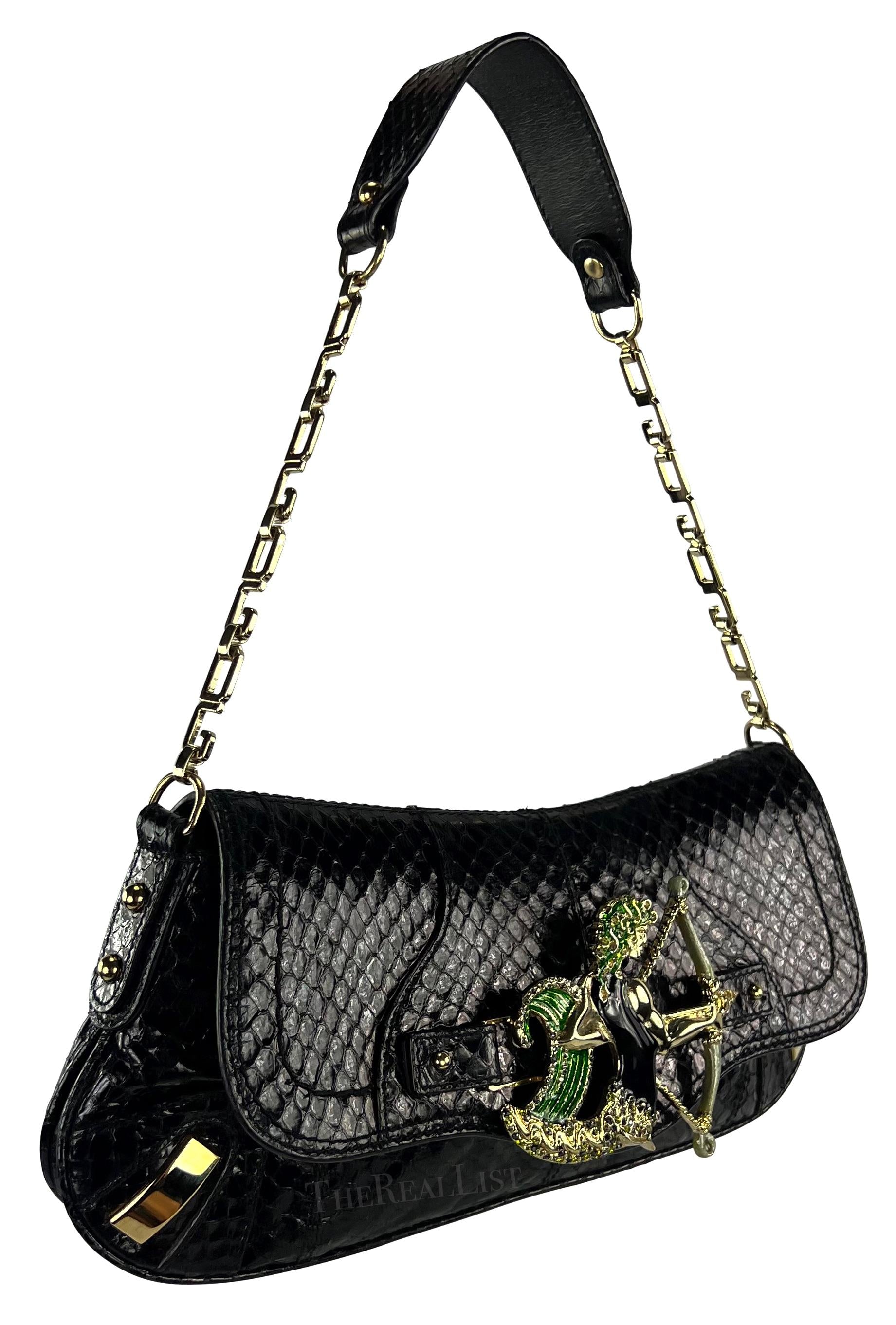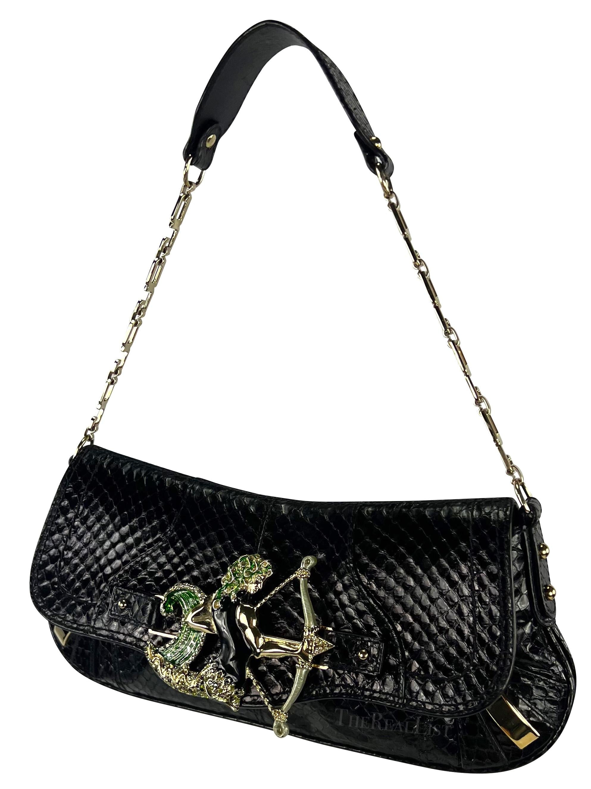 Presenting an incredible black snakeskin Dolce & Gabbana horoscope shoulder bag. Elevate your style with this exceptional black snakeskin Dolce & Gabbana horoscope shoulder bag, a coveted piece from the Fall/Winter 2004 collection. Meticulously crafted from black python skin, this flap bag is a testament to the brand's dedication to quality and sophistication. Embellished with a mesmerizing enamel and rhinestone covered Sagittarius symbol buckle, complemented by gold-tone hardware and a 'D' and 'G' link strap, it's a rare gem that will make a bold statement in your wardrobe.