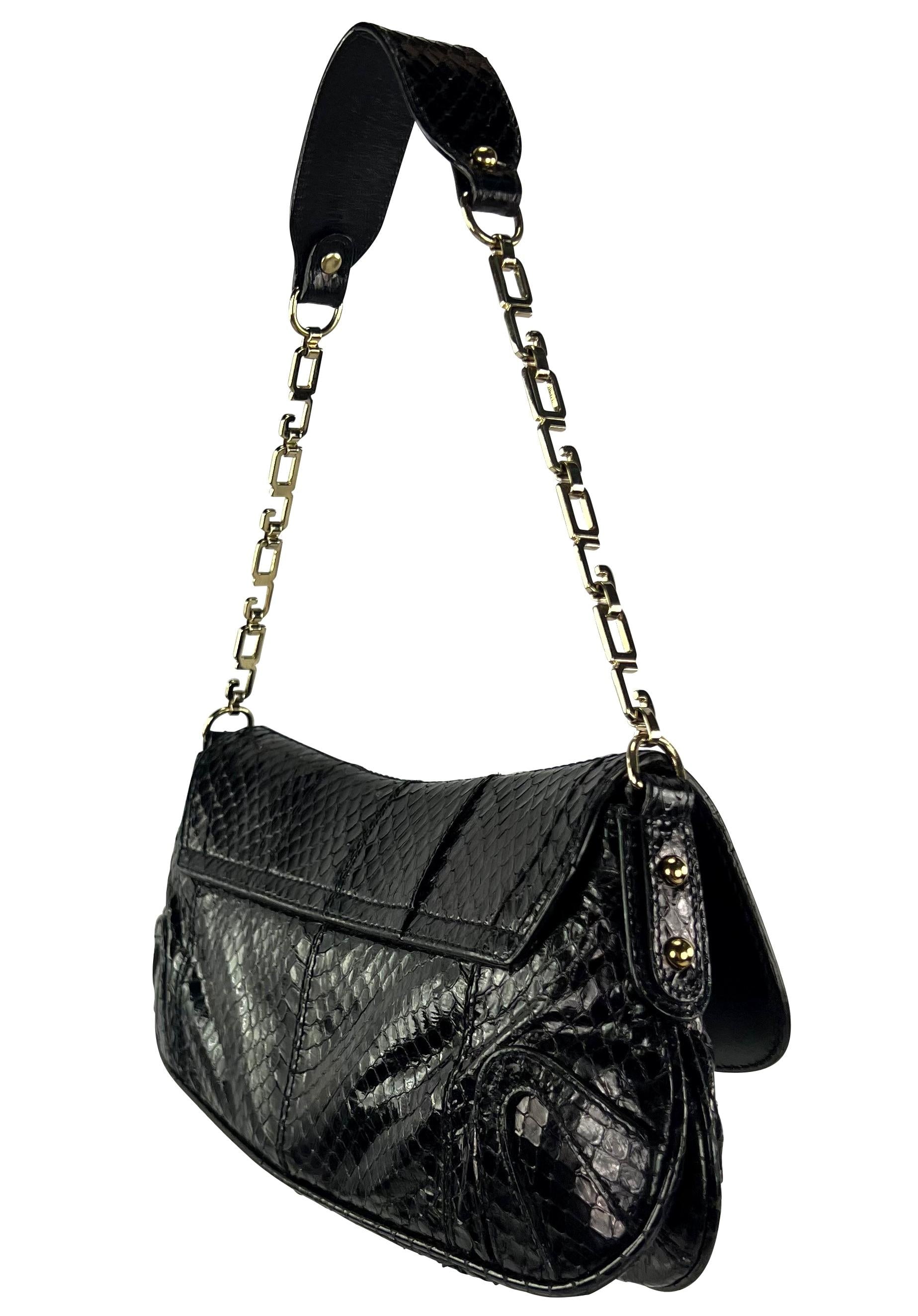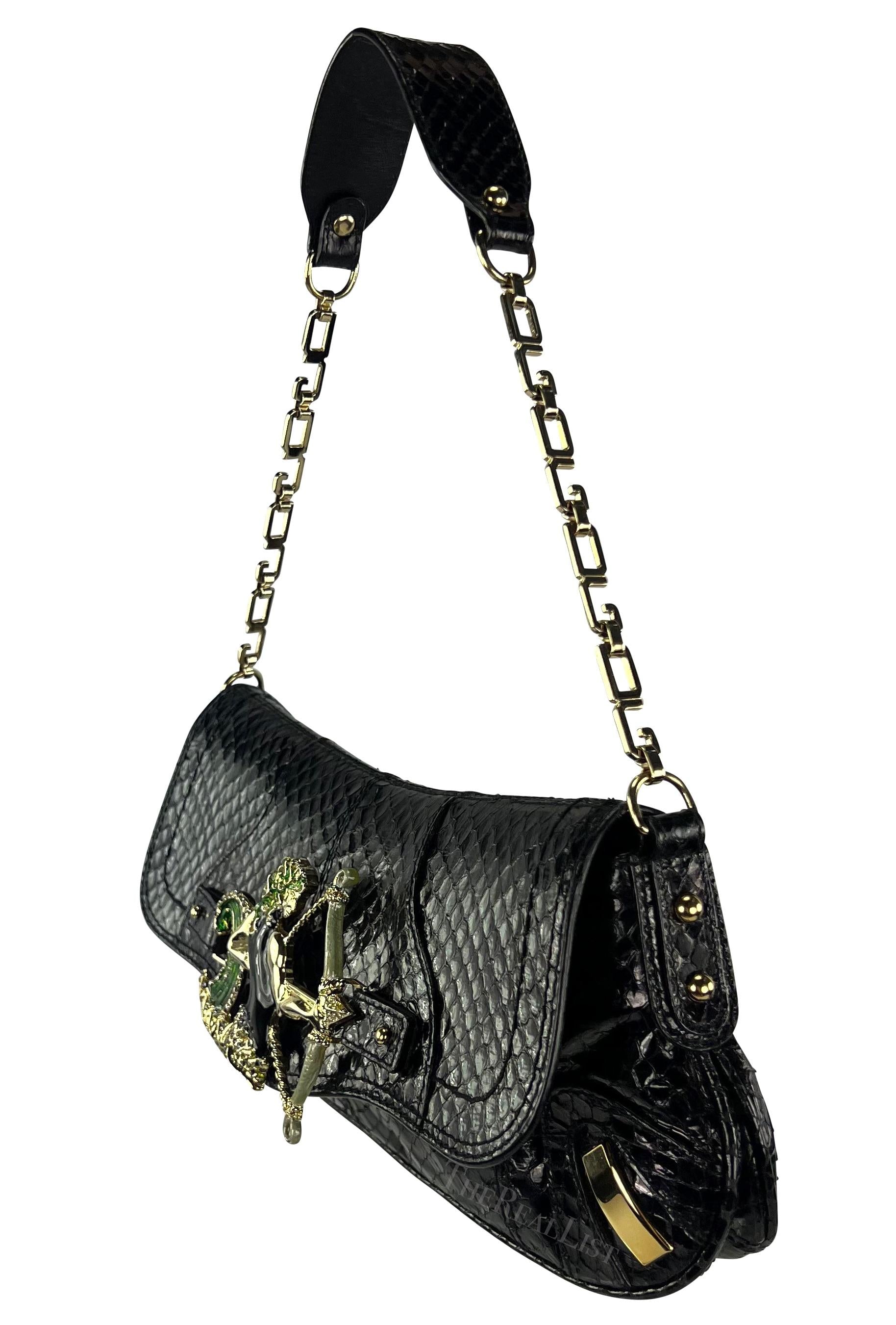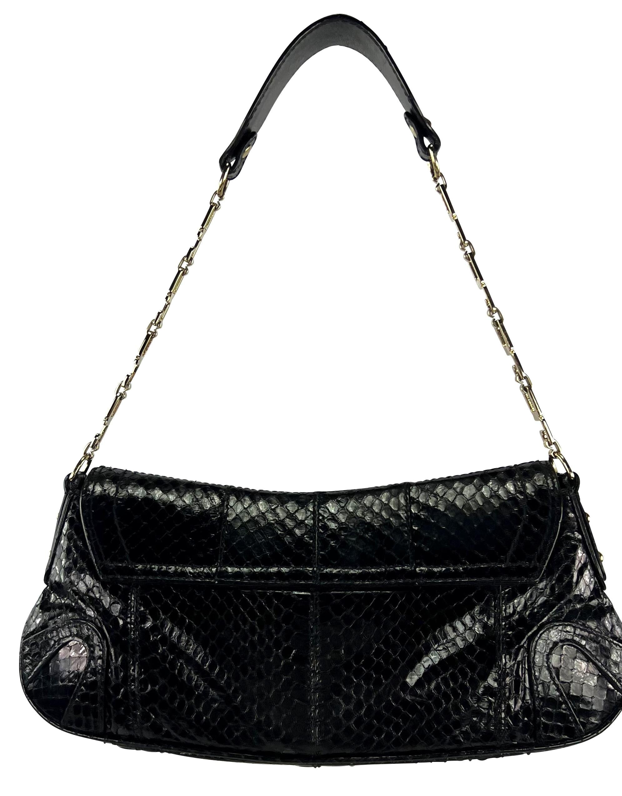Presenting an incredible black snakeskin Dolce & Gabbana horoscope shoulder bag. Elevate your style with this exceptional black snakeskin Dolce & Gabbana horoscope shoulder bag, a coveted piece from the Fall/Winter 2004 collection. Meticulously crafted from black python skin, this flap bag is a testament to the brand's dedication to quality and sophistication. Embellished with a mesmerizing enamel and rhinestone covered Sagittarius symbol buckle, complemented by gold-tone hardware and a 'D' and 'G' link strap, it's a rare gem that will make a bold statement in your wardrobe.