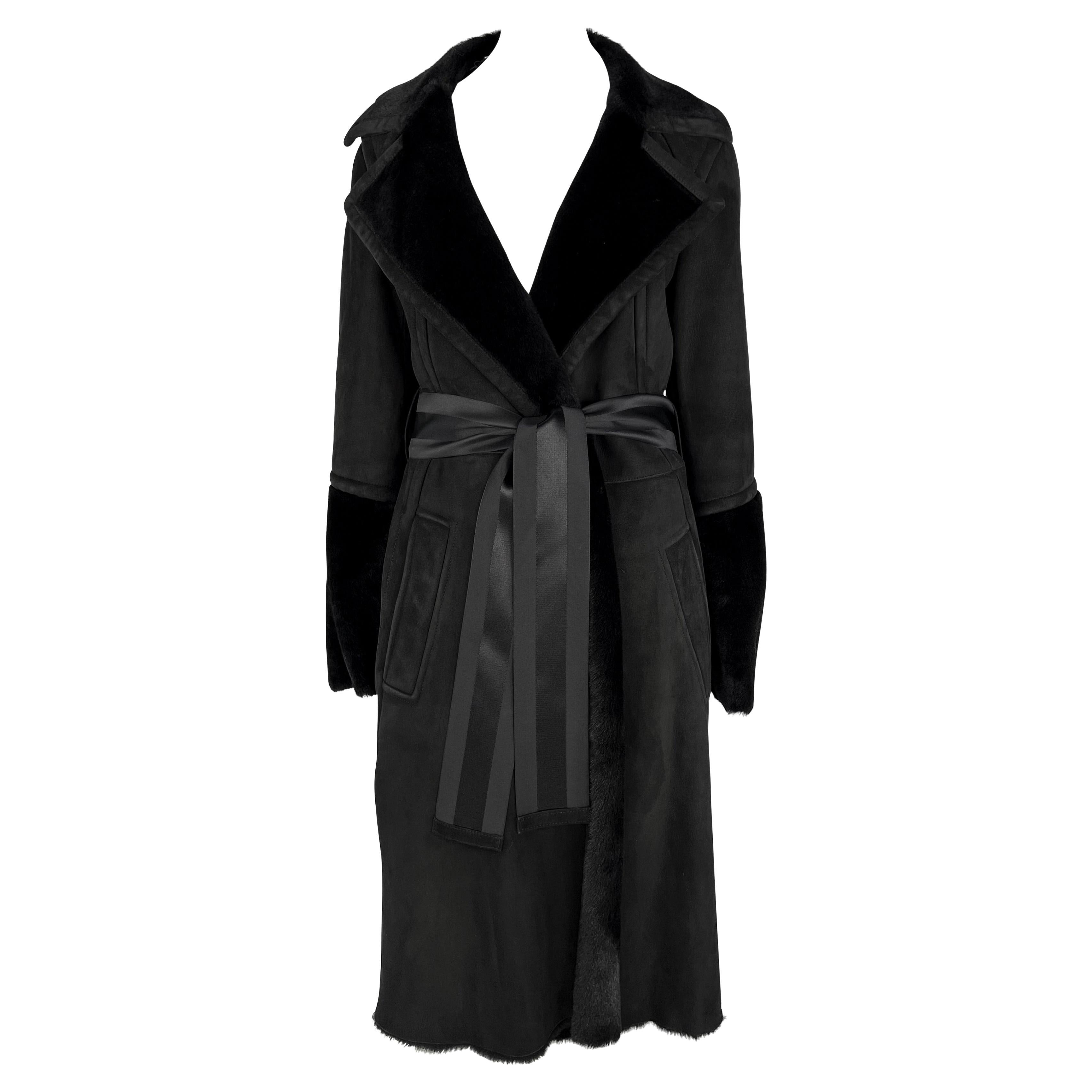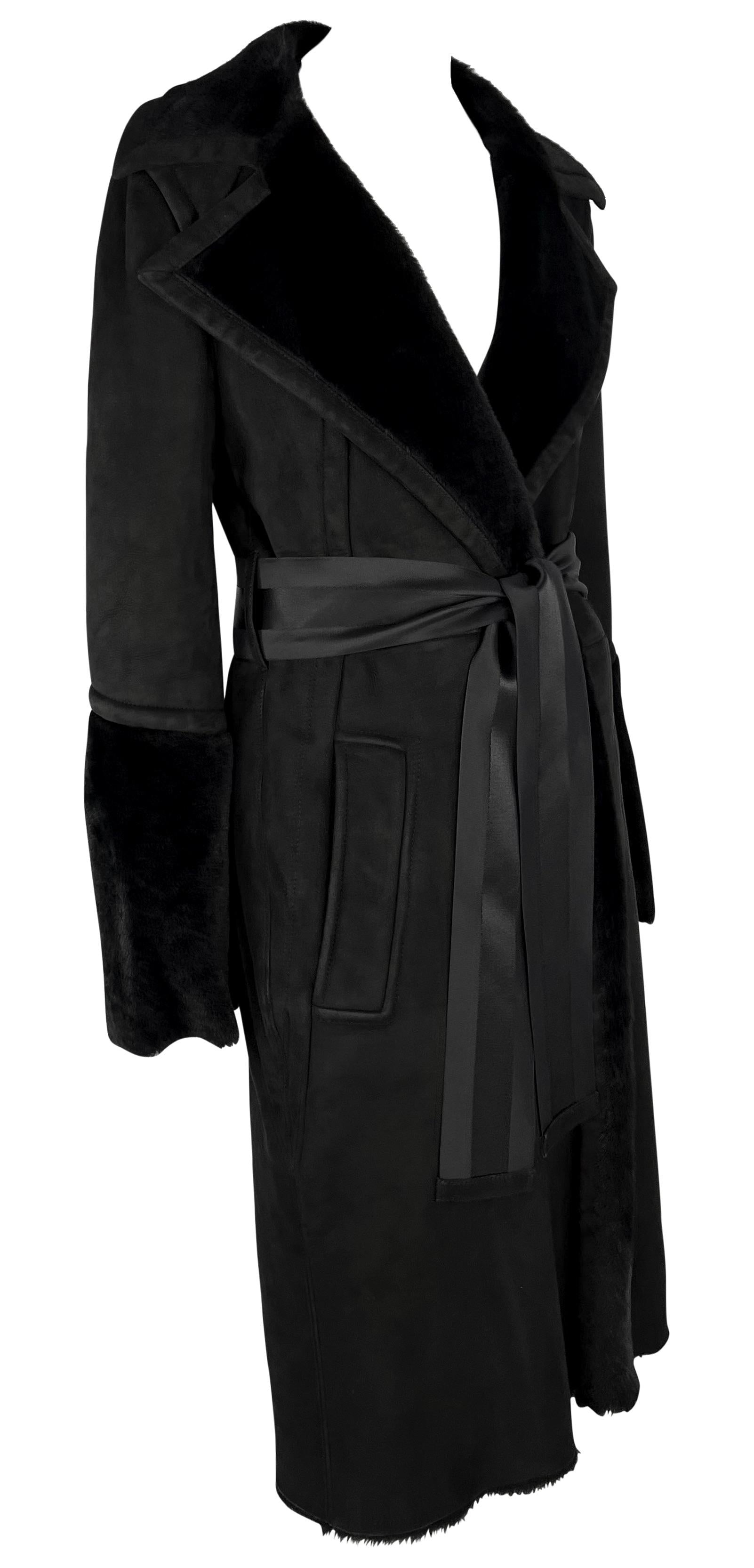 F/W 2004 Gucci by Tom Ford Black Shearling Suede Ribbon Belted Coat